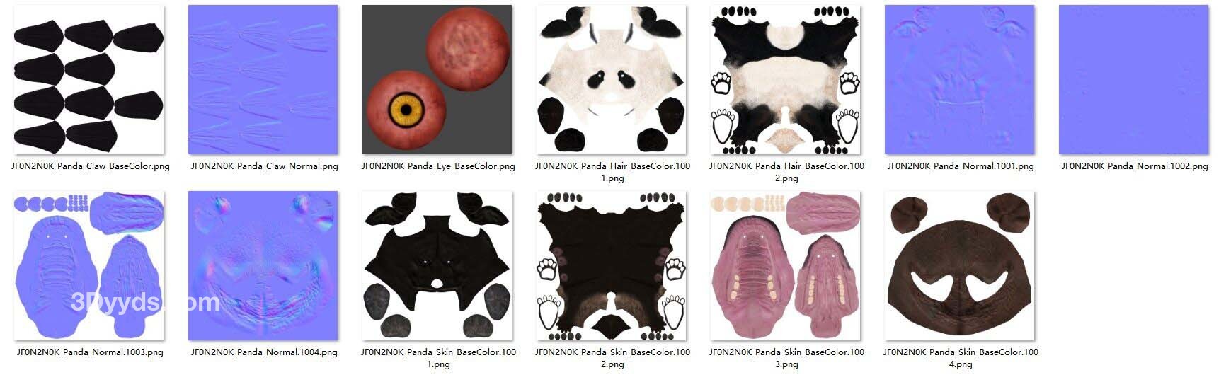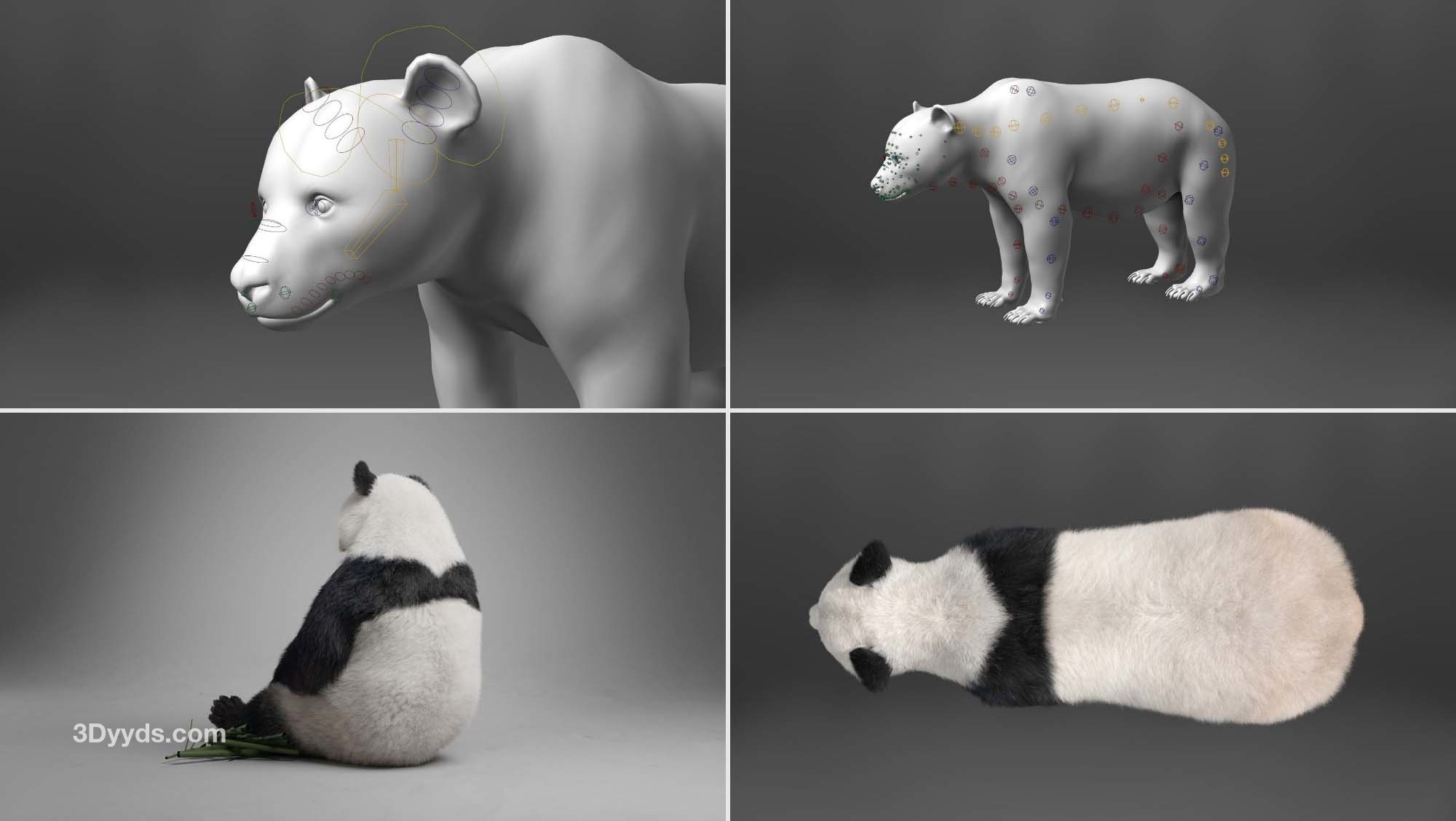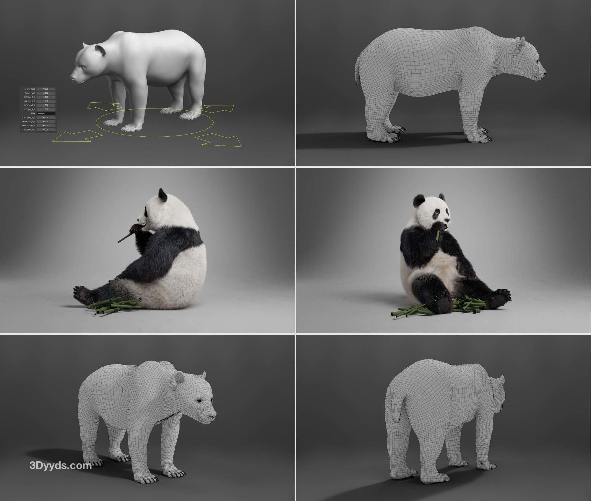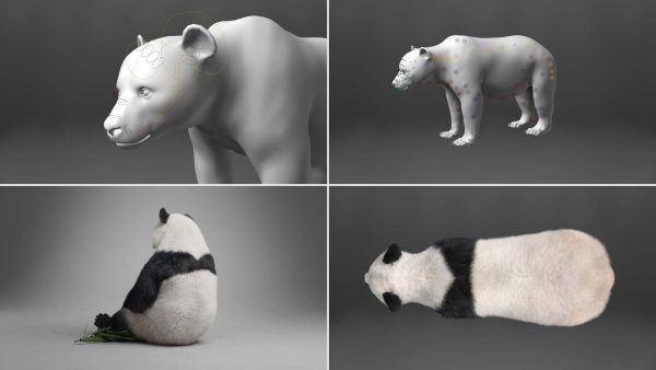 这是一个高质量的熊猫模型,具有 4K UDIM 地图、毛皮、索具和三个逼真的动画。该模型带有逼真的肌肉结构和顶点颜色控制,呈现逼真的效果,并使用 Blender 创建复杂的头发系统以实现头发效果。此模型是使用 Blender 和 Cycles 渲染器以真实世界比例制作的。 描述 它由身体、爪子、泪腺、眼球和巩膜组成。