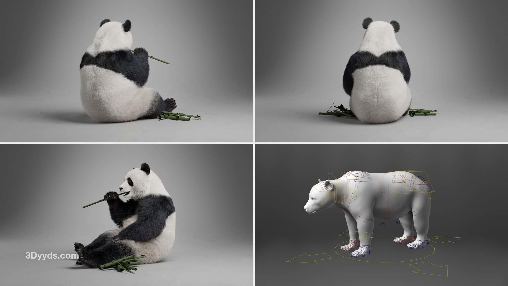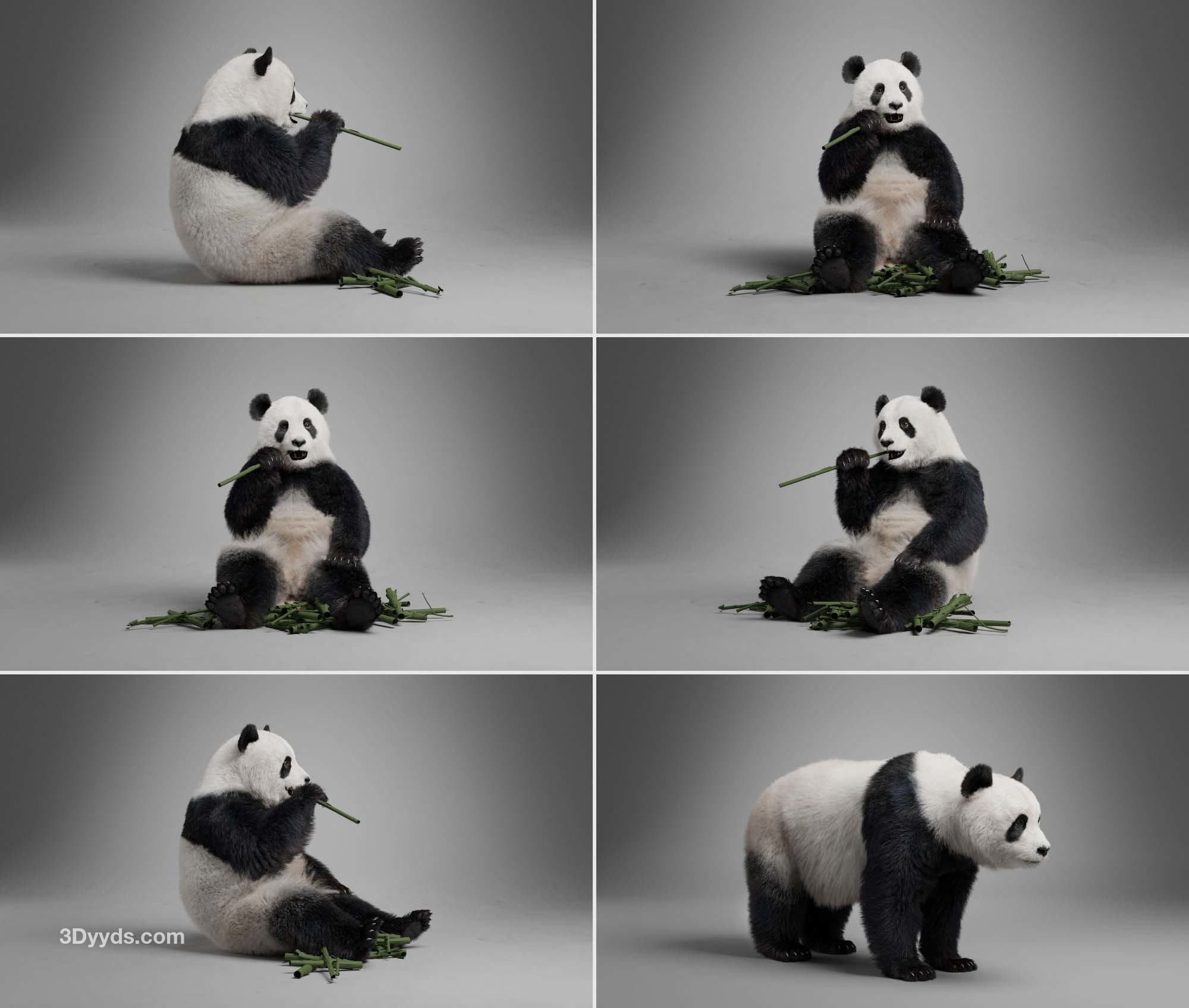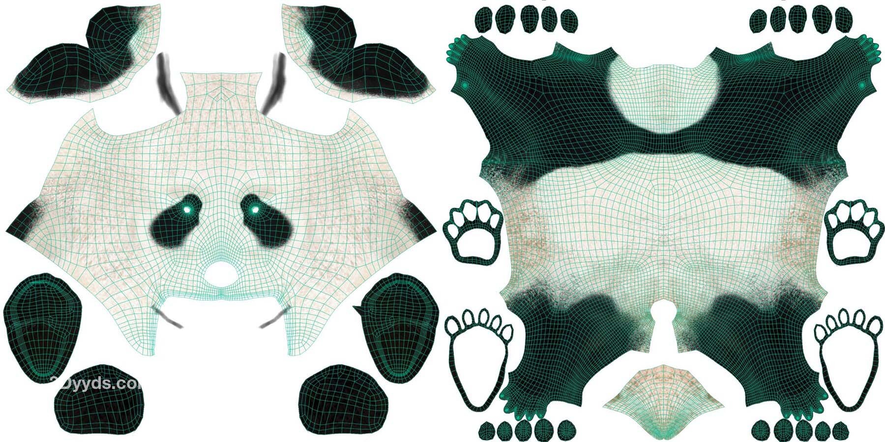这是一个高质量的熊猫模型,具有 4K UDIM 地图、毛皮、索具和三个逼真的动画。该模型带有逼真的肌肉结构和顶点颜色控制,呈现逼真的效果,并使用 Blender 创建复杂的头发系统以实现头发效果。此模型是使用 Blender 和 Cycles 渲染器以真实世界比例制作的。 描述 它由身体、爪子、泪腺、眼球和巩膜组成。