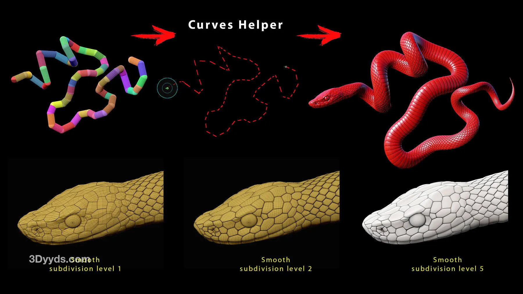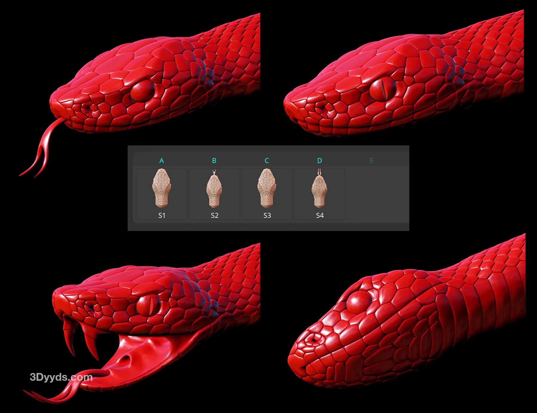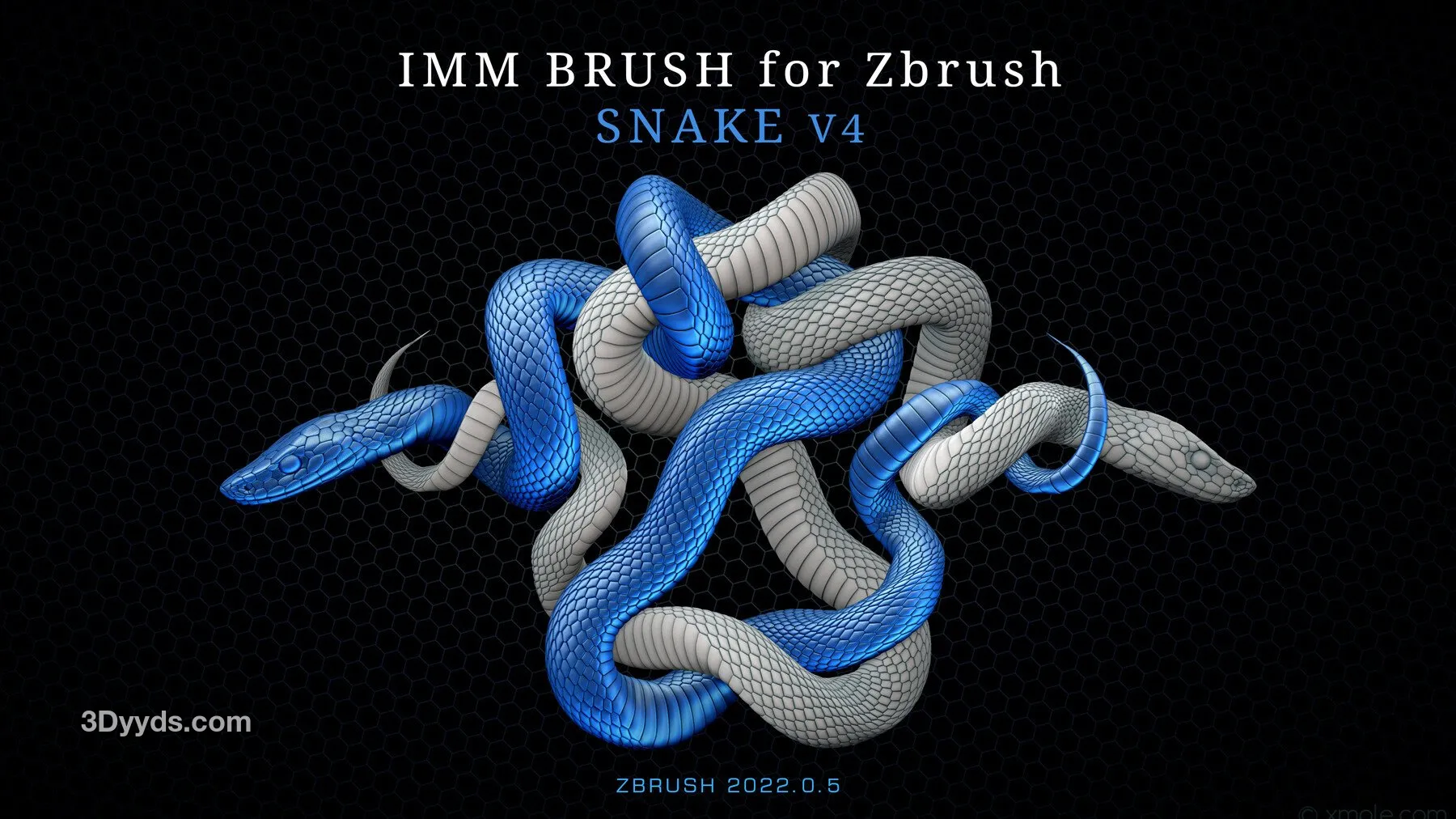 插入多网格笔刷«Snake»V4是在Zbrush 2022.0.5版本中制作的(在旧版本中,该笔刷将无法工作!)在这个版本的笔刷中,我使蛇的纹理更加逼真。文件:Snake V4.ZBP该笔刷有两个选项:用蛇的张开和闭合的嘴。按M键切换模式画笔由一个低多边形网格组成。在交互模式下,可以添加平滑细分级别(几何体>动态细分)。我建议在最低细分级别工作,并在达到蛇的可接受位置后添加细分级别(并应用)。在画笔模式下,您可以更改一些参数:-锁定和,锁定开始(笔划调色板>笔划)-允许冻结头部或尾部以便于操作。-捕捉(笔划调色板>笔划)-绑定到曲面。-最大弯曲角度(画笔调色板>修改器)-影响蛇的灵活性(如果你暴露一个大角度,那么弯曲将不会很漂亮)。有一个特点:只有在将蛇分离成单独的子工具后,才能添加实际的细分级别(工具>几何体>分割),如果不这样做,分区将不会平滑!我强烈建议将CurvesHelper与这款刷子一起使用。