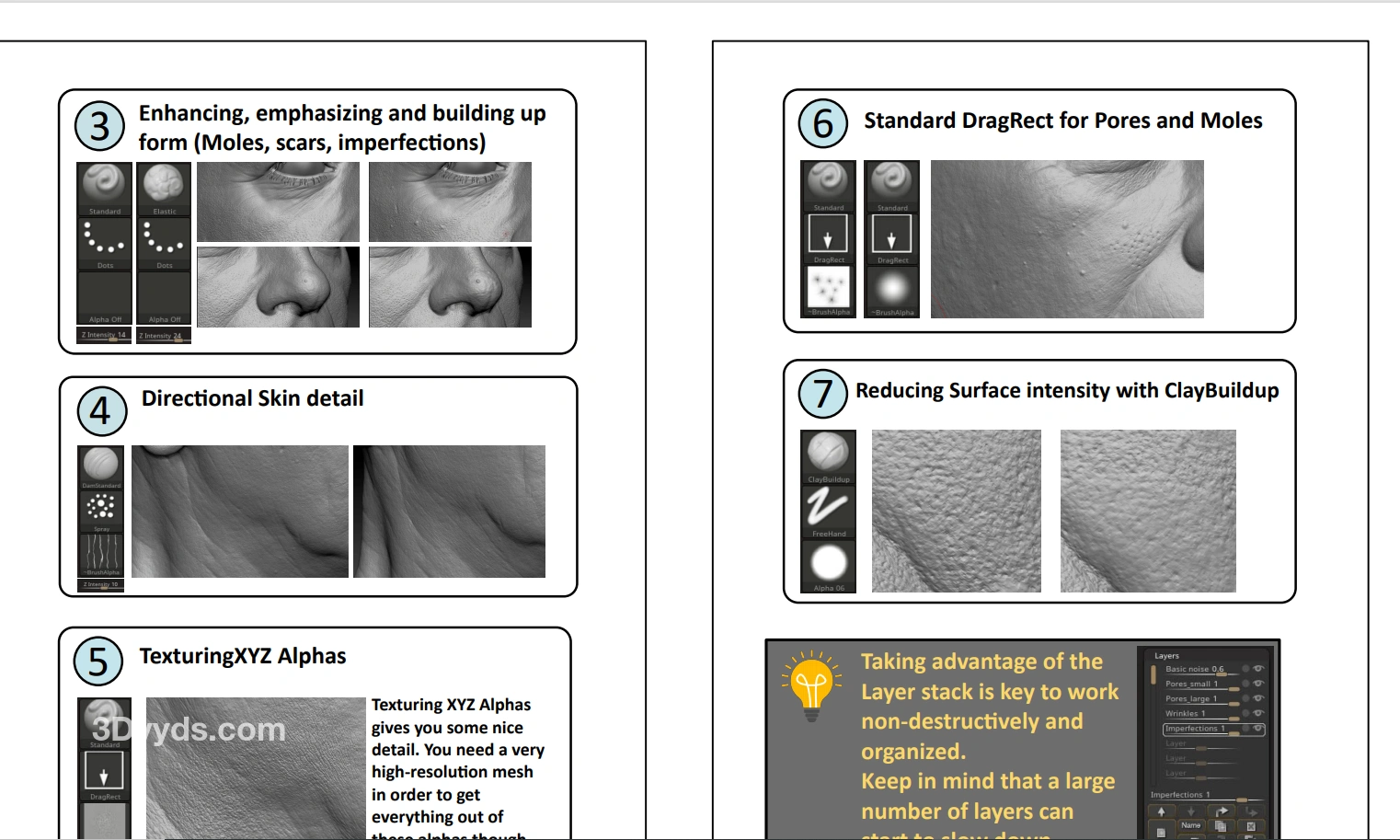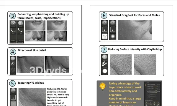 1. 循序渐进的教学:从基础球体开始,逐步讲解头部比例、大型搭建、五官细化、皮肤纹理雕刻等完整流程,适合零基础或有一定基础的 ZBrush 用户。
