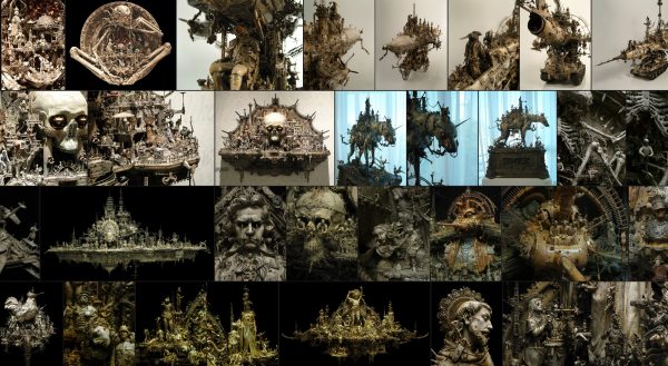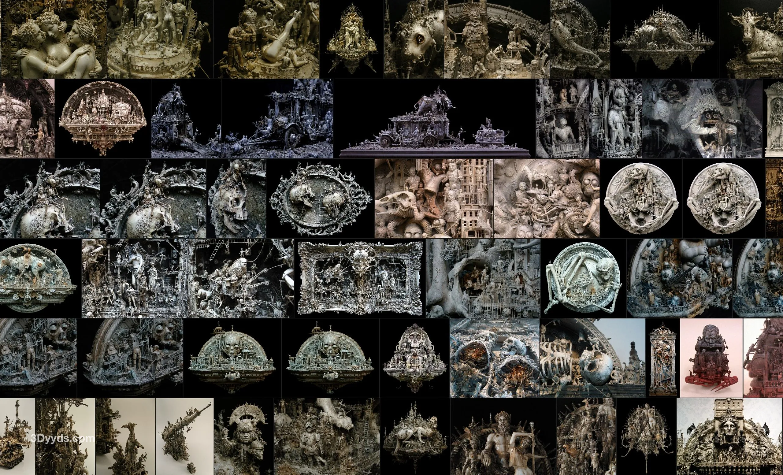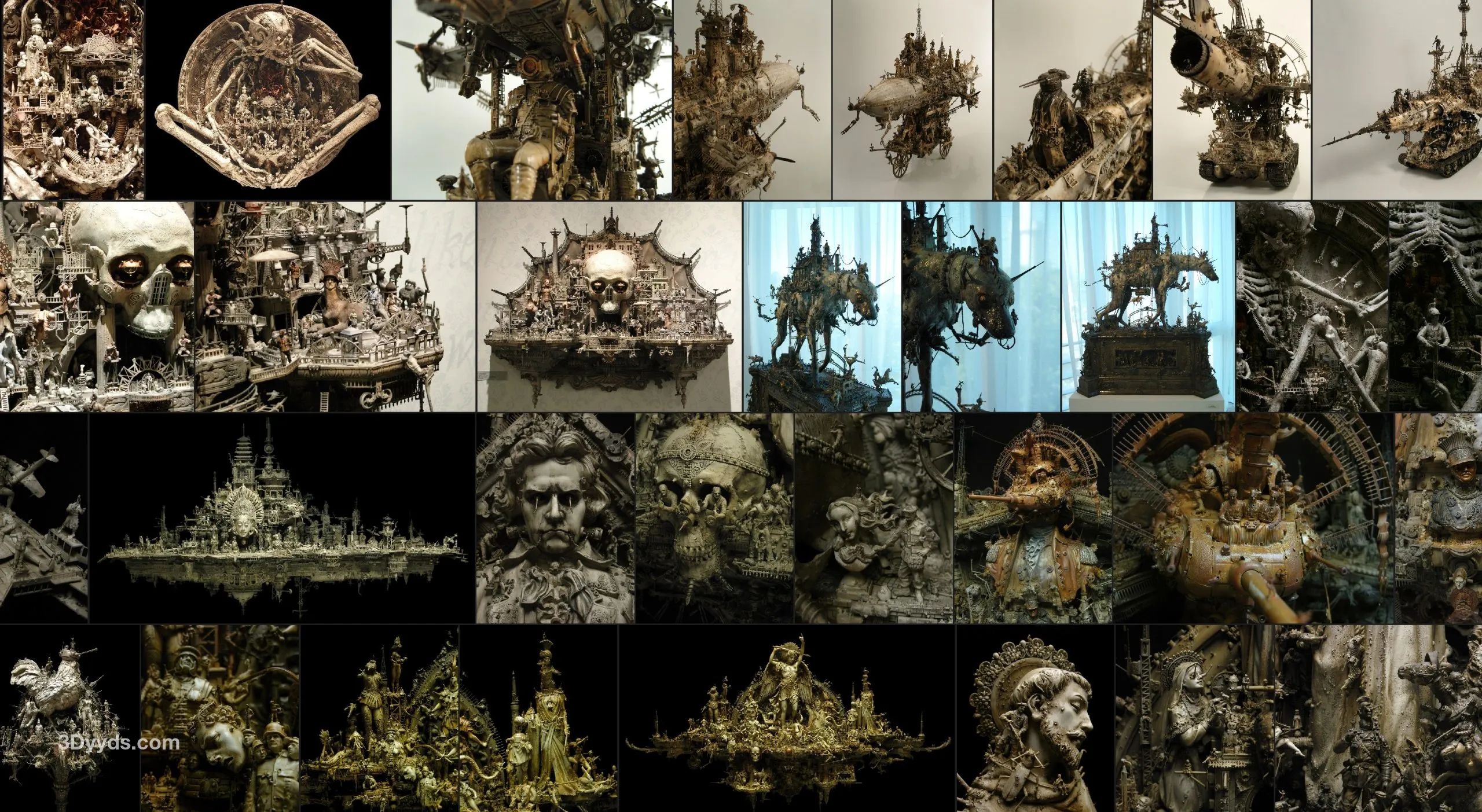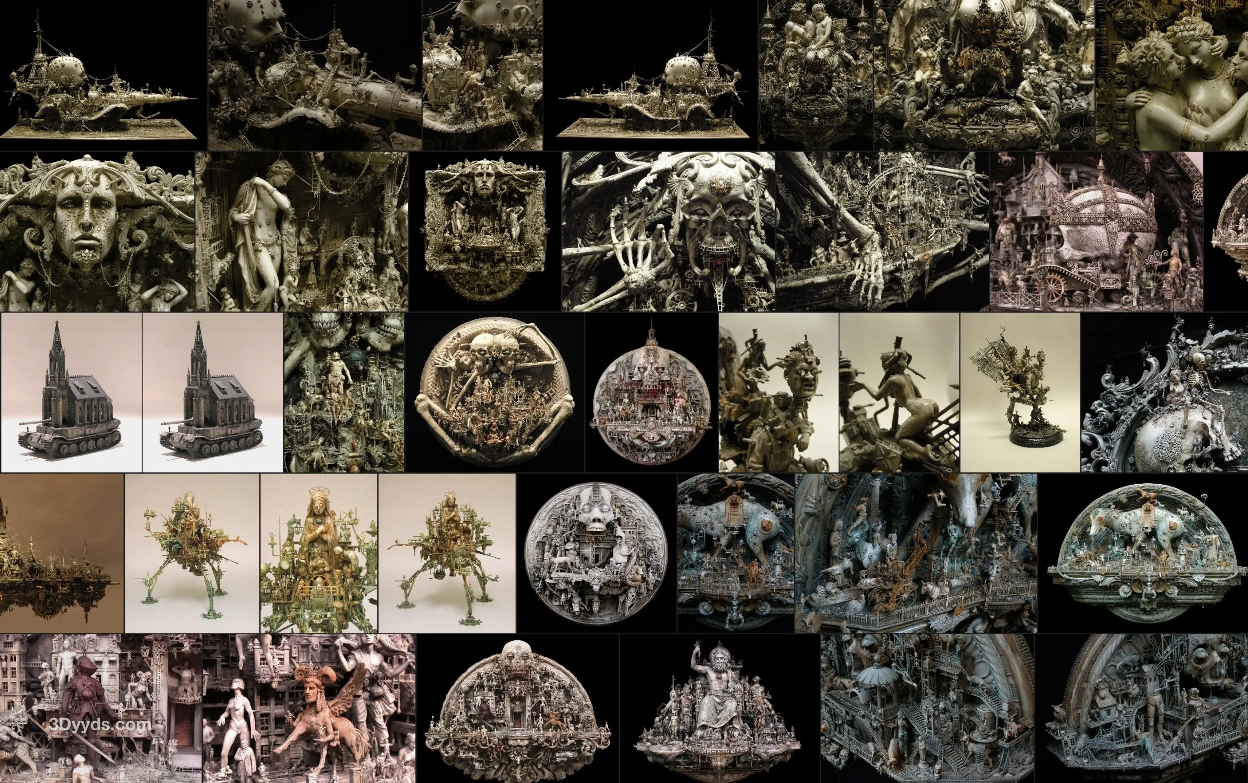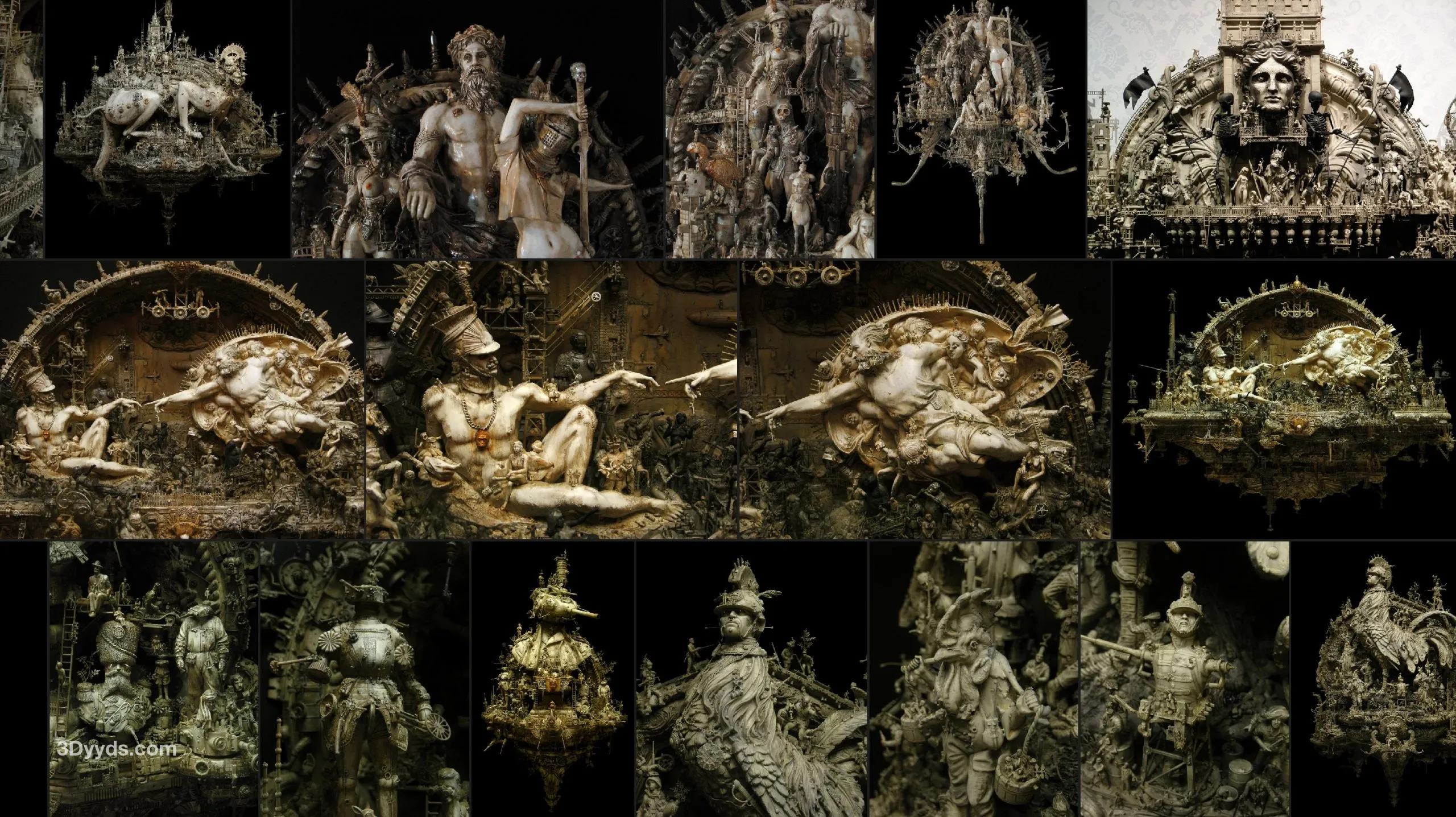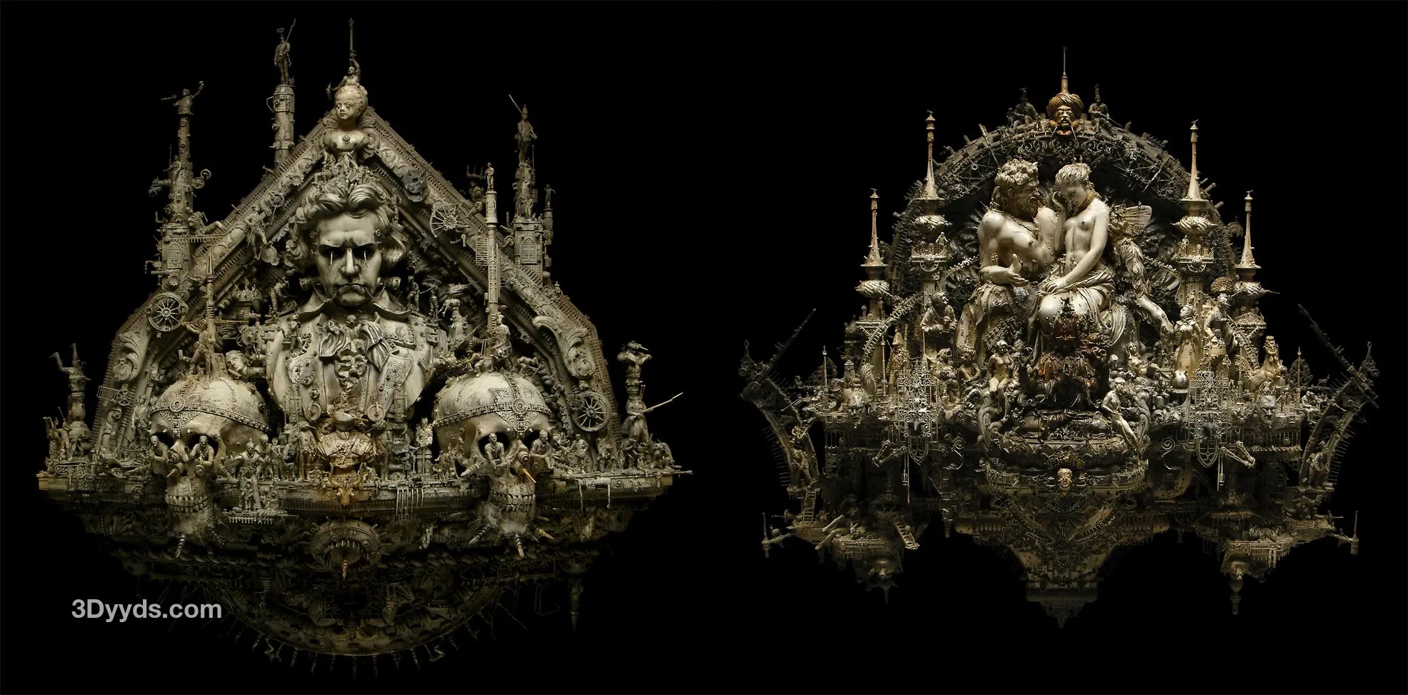 Kris Kuksi的作品集展现了独特的后工业时代洛可可风格艺术。他巧妙融合工业废弃零件与洛可可式的繁复装饰,创造出充满奇幻色彩与深刻内涵的雕塑作品。这些作品在细节上极致考究,金属部件的精密组合与古典洛可可的柔美线条相互碰撞,既呈现出工业文明的冷峻质感,又不失艺术的浪漫与华丽,为观者带来一场视觉与思想的双重盛宴,深刻探讨了在现代化进程中传统与工业、精致与粗糙之间的复杂关系。