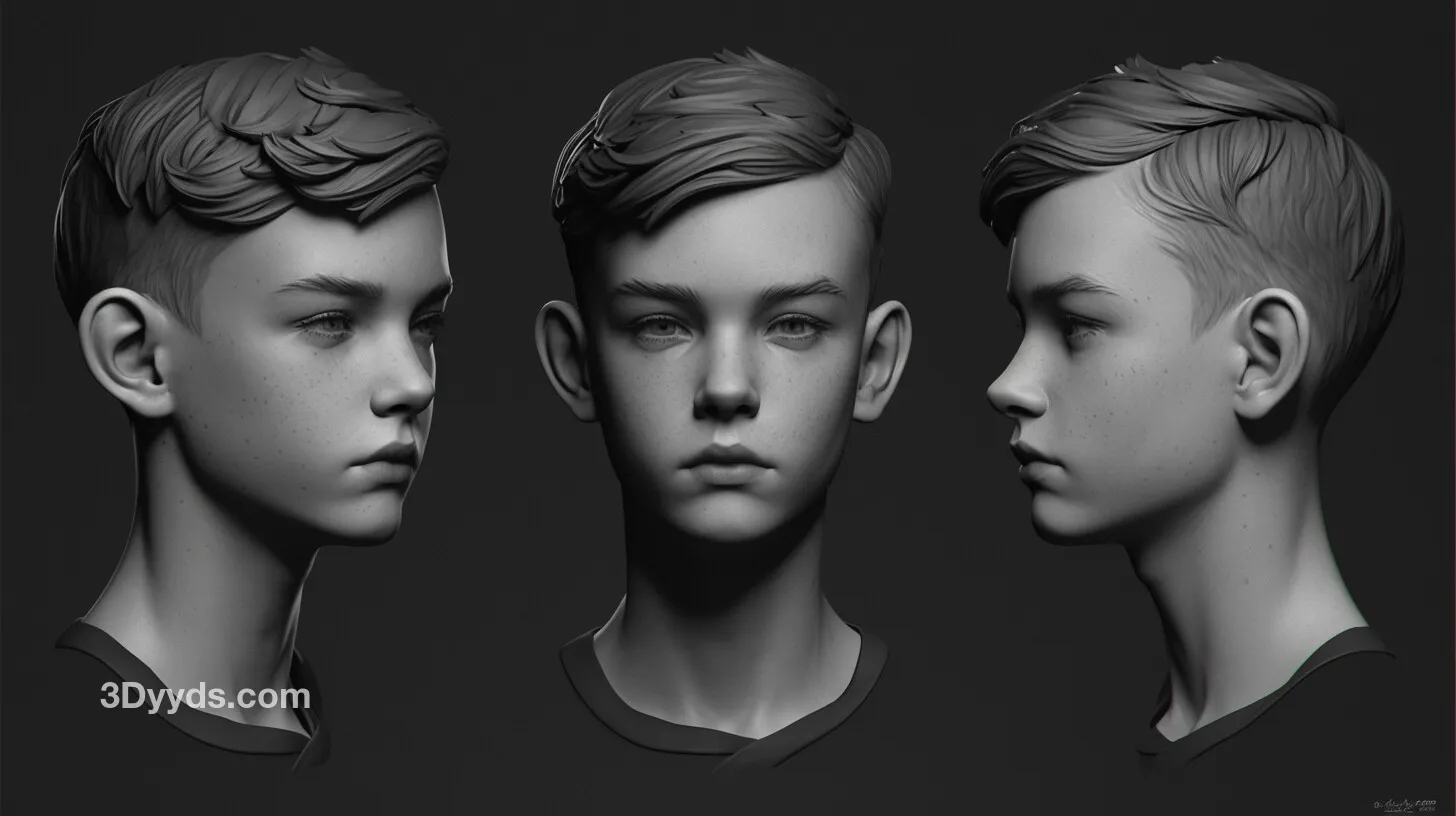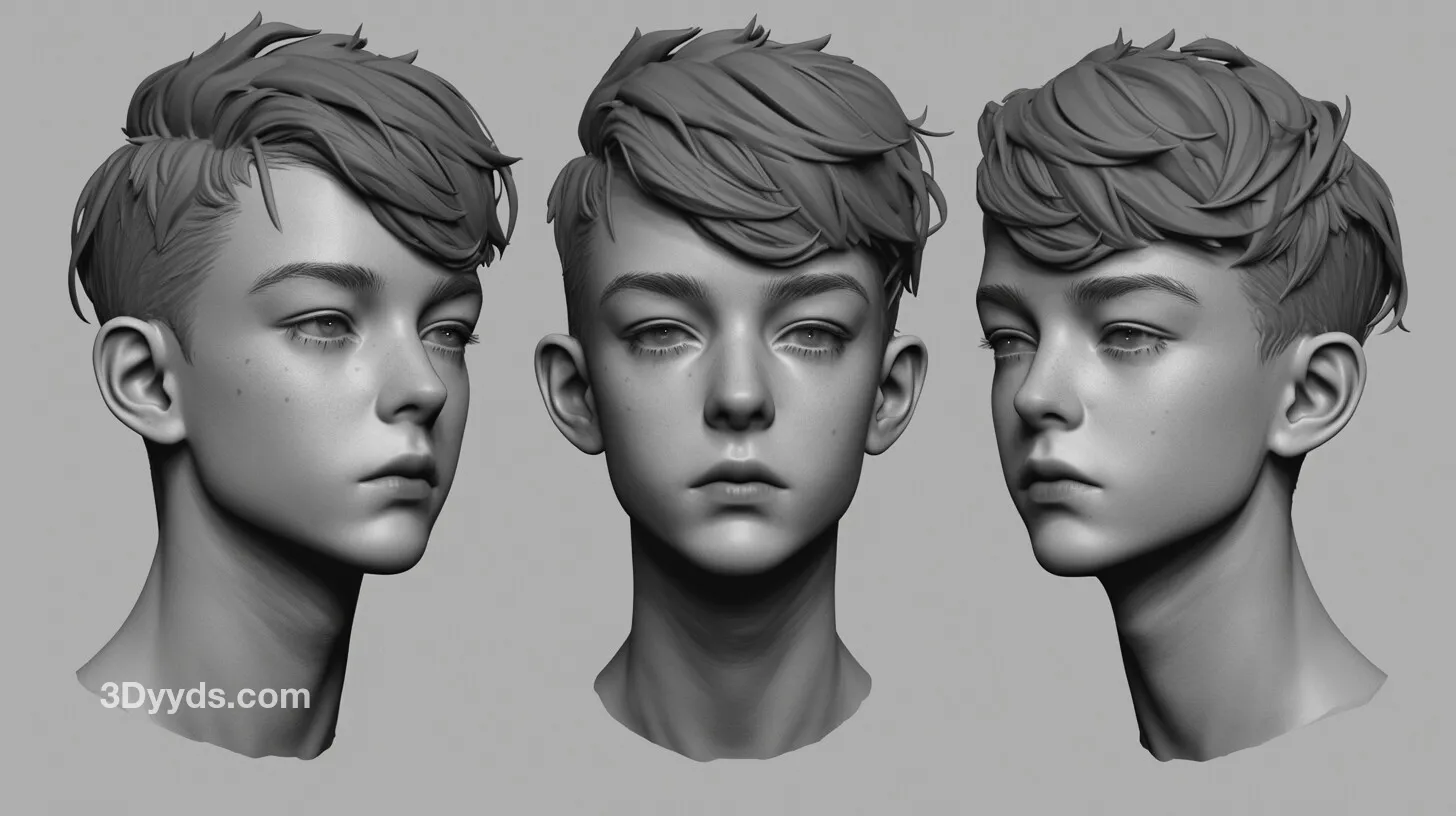 本资源是一套包含超过390张高清儿童男孩头部参考图,专为ZBrush等数字雕刻软件设计,提供多角度、高清晰度的头部结构细节,是角色艺术家创作写实或风格化儿童角色的理想参考素材。