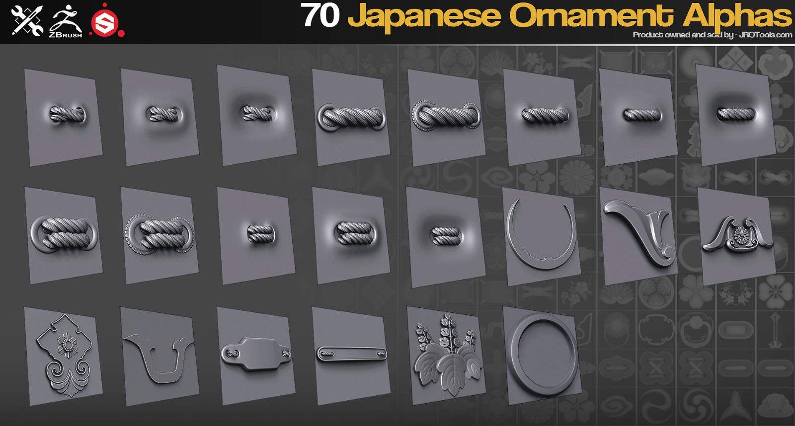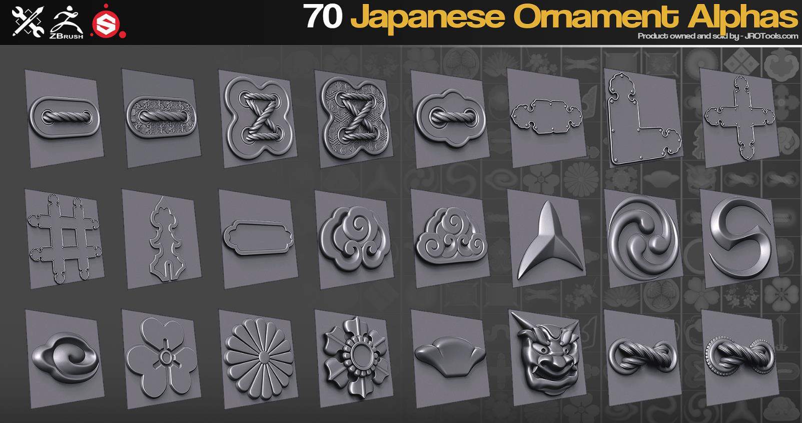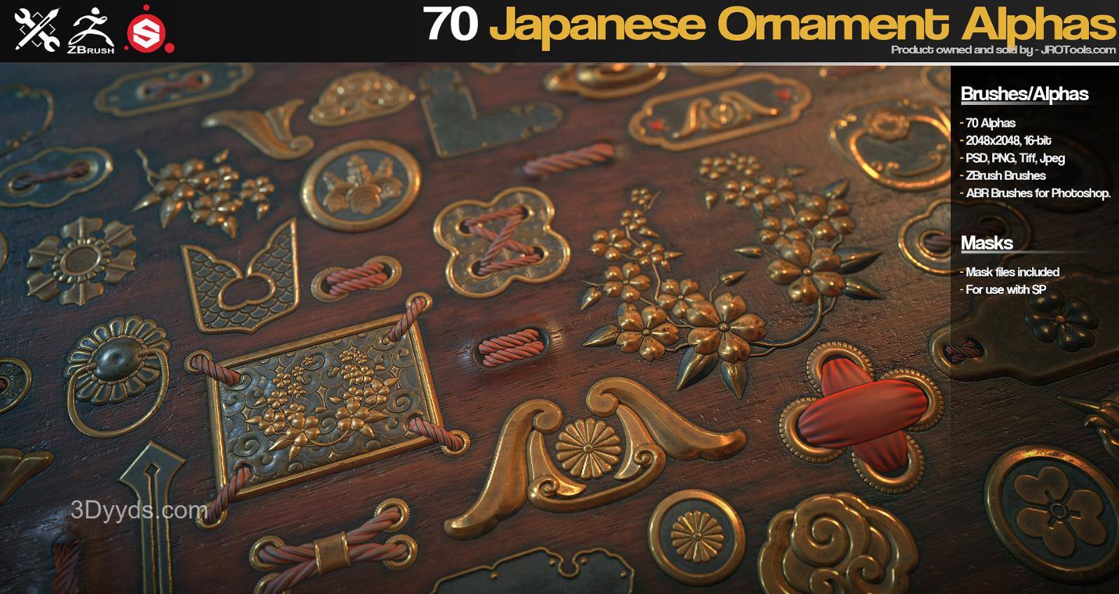 这是一套包含 70 个日式装饰图案的 alpha/刷子,可用于 ZBrush、Substance Painter、Quixel DDO、Mixer、NDO 等软件。