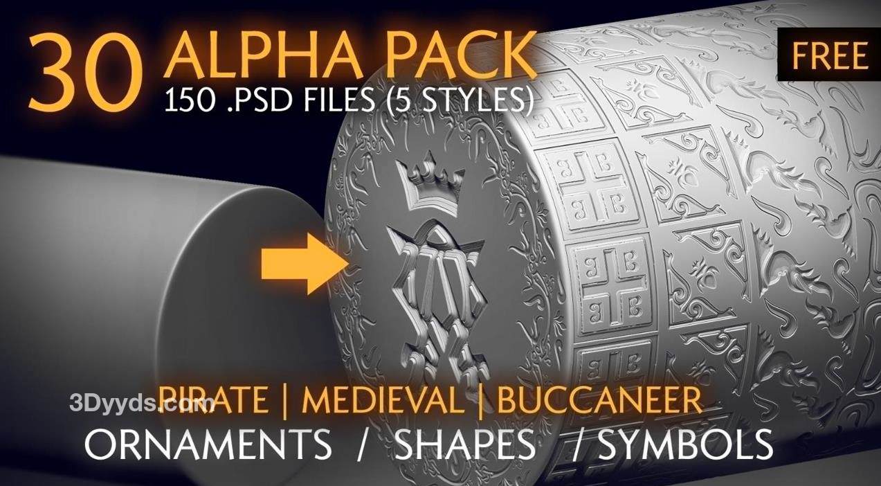 这个链接提供了一个免费的 Alpha Pack - VOL.1,主题是海盗/中世纪/海盗王。这个 Alpha Pack 包含了各种装饰图案和形状的 alpha 纹理。
