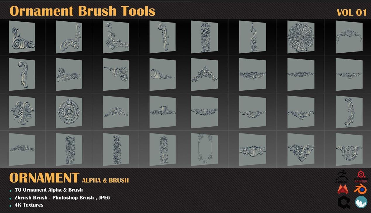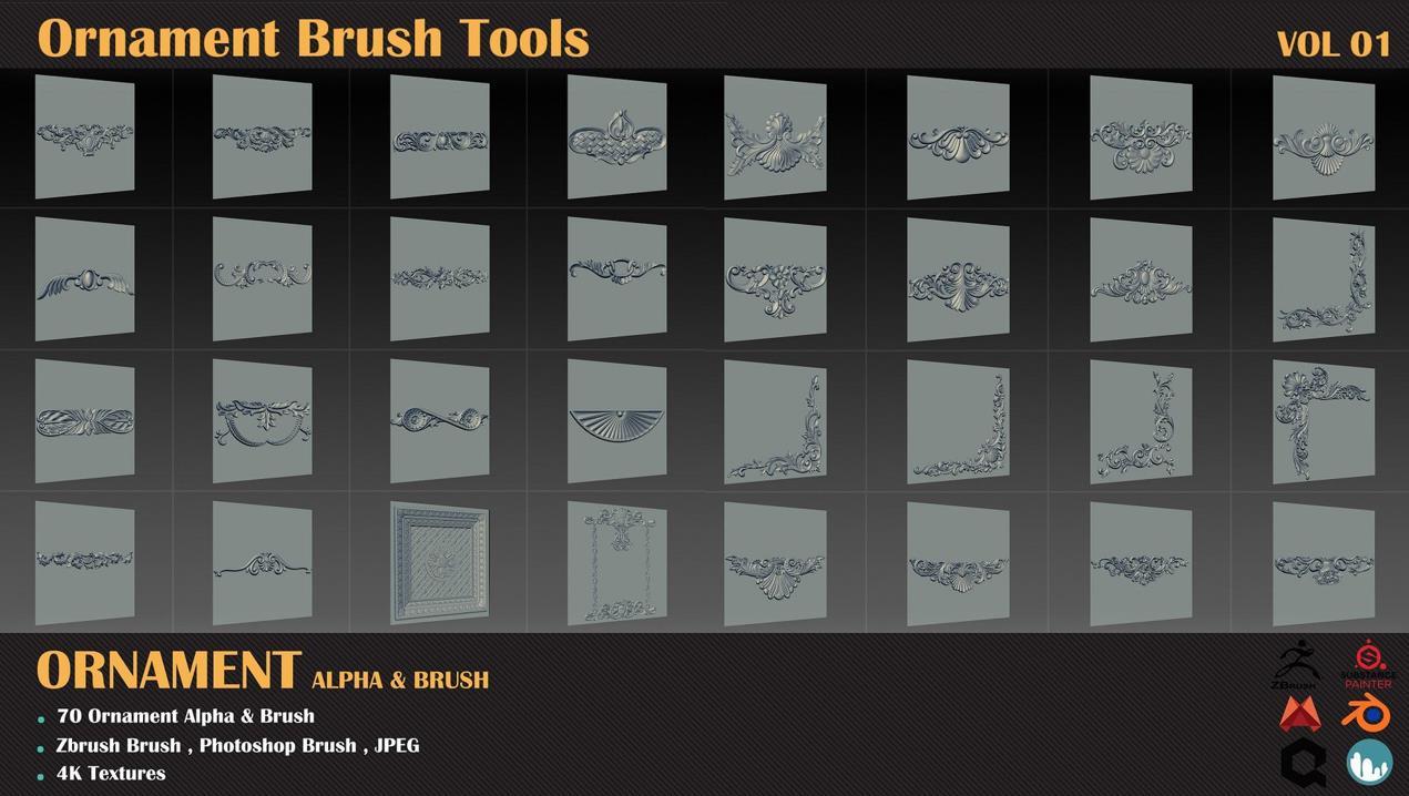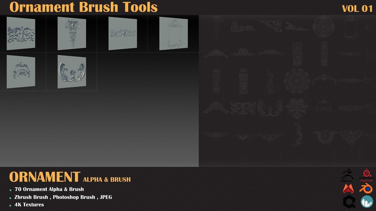 这是一套适用于ZBrush、Substance Painter、Quixel DDO和NDO等软件的饰品alpha/笔刷套装。