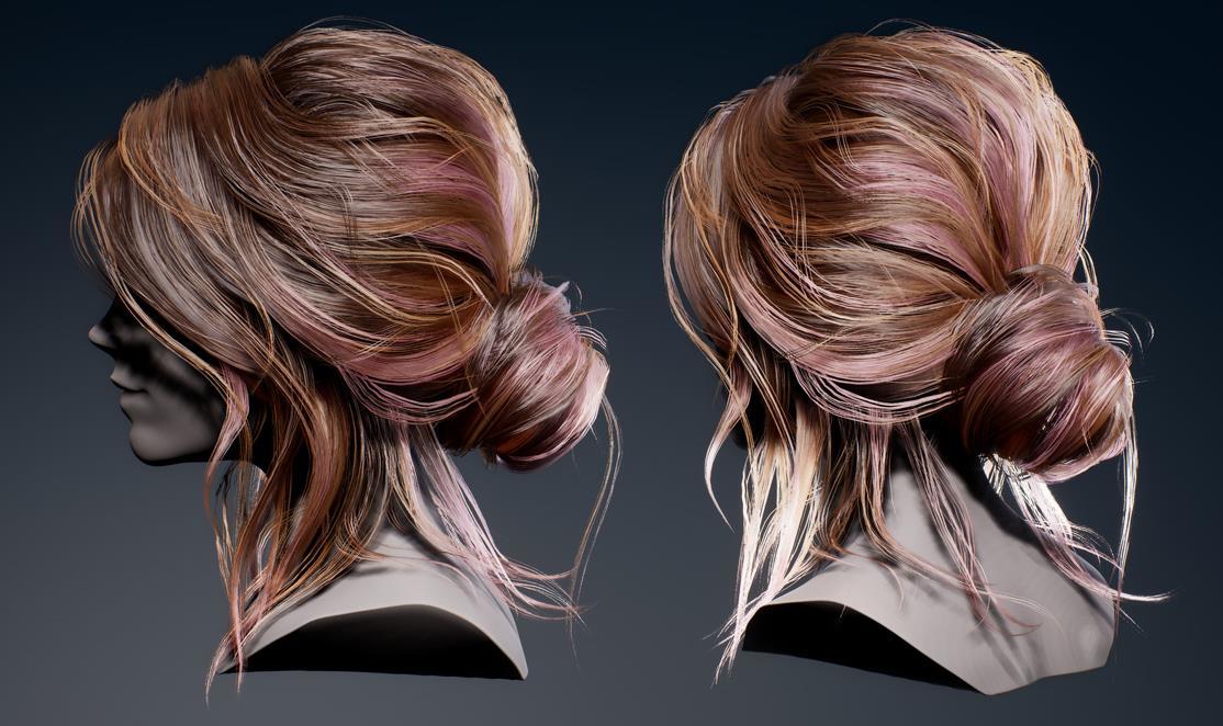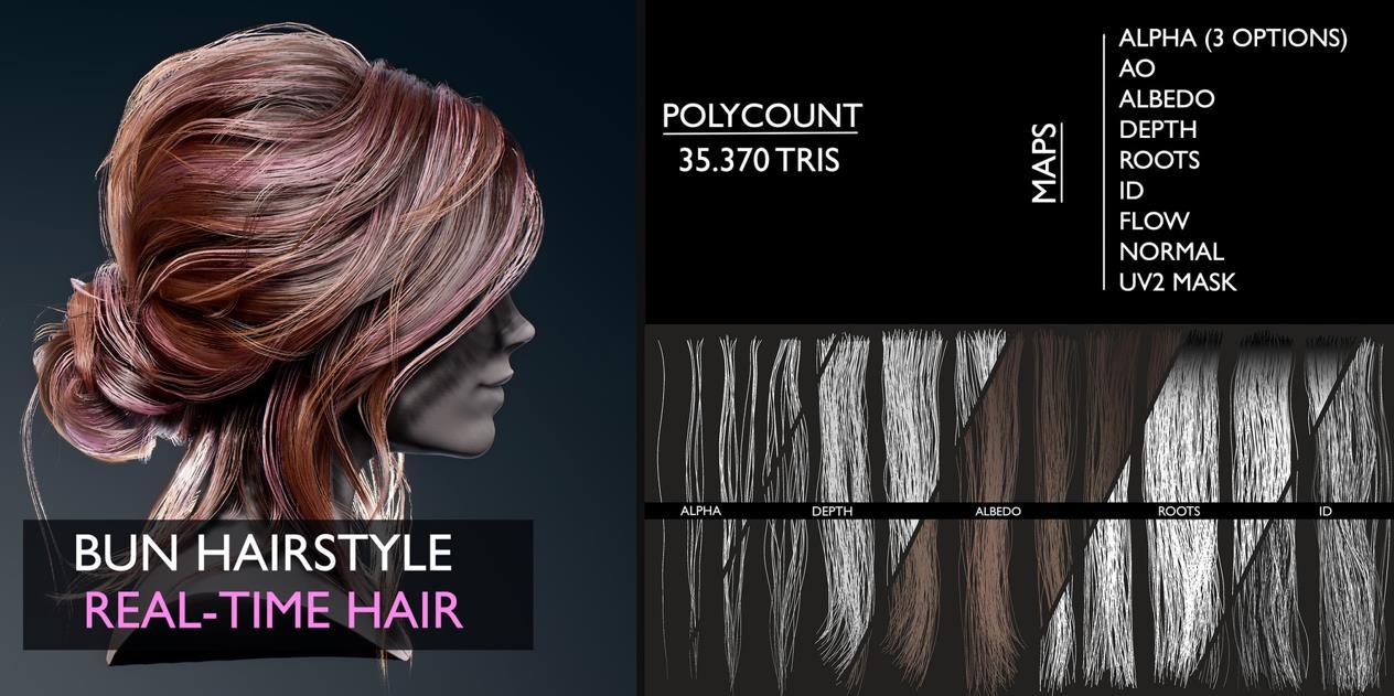 - 圆髻发型4k纹理:漫反射、环境光遮蔽、流动、高度、ID、法线、透明度(3种变体)、发根、UV2遮罩tga;