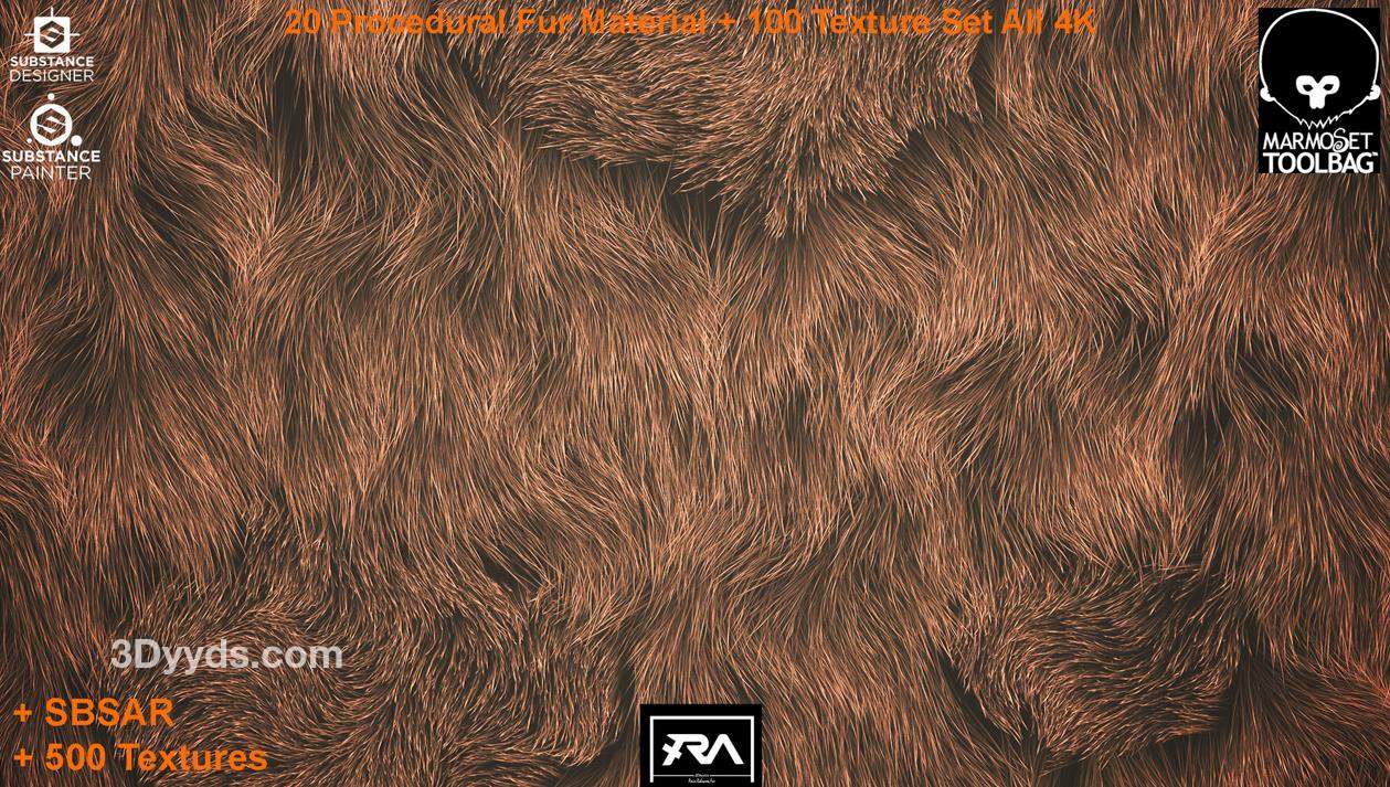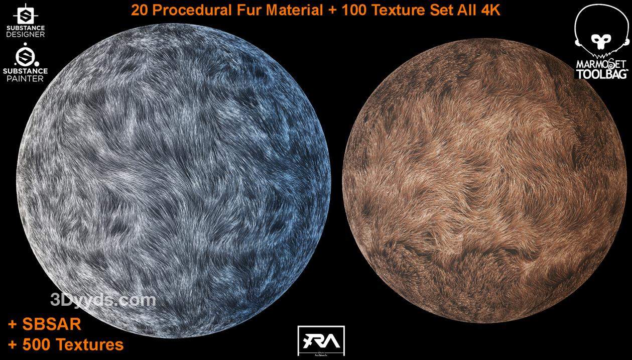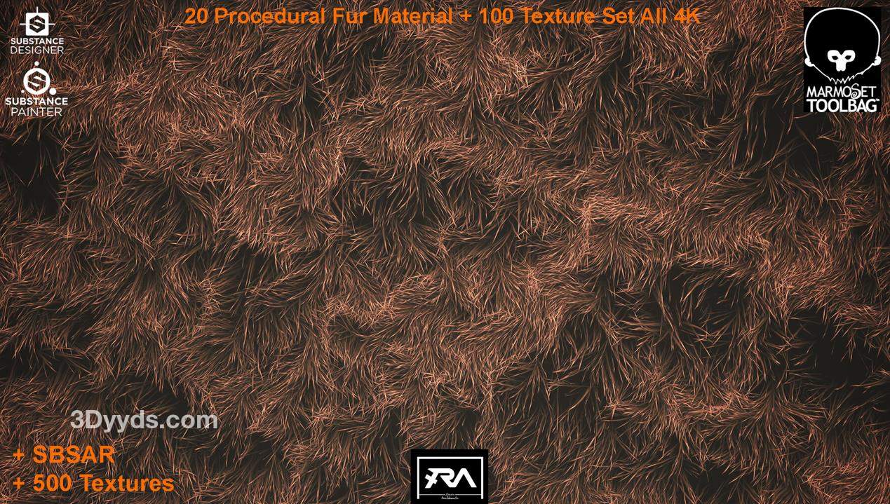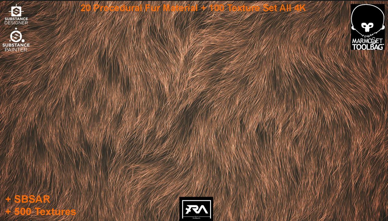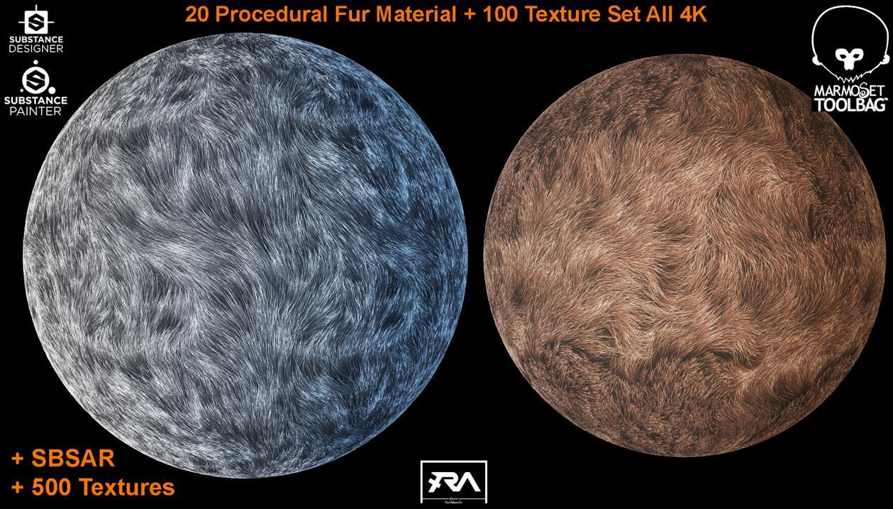 20 个程序化毛皮材质(可平铺)+ 100 材质集合(500 材质 4K - 5 种不同颜色)