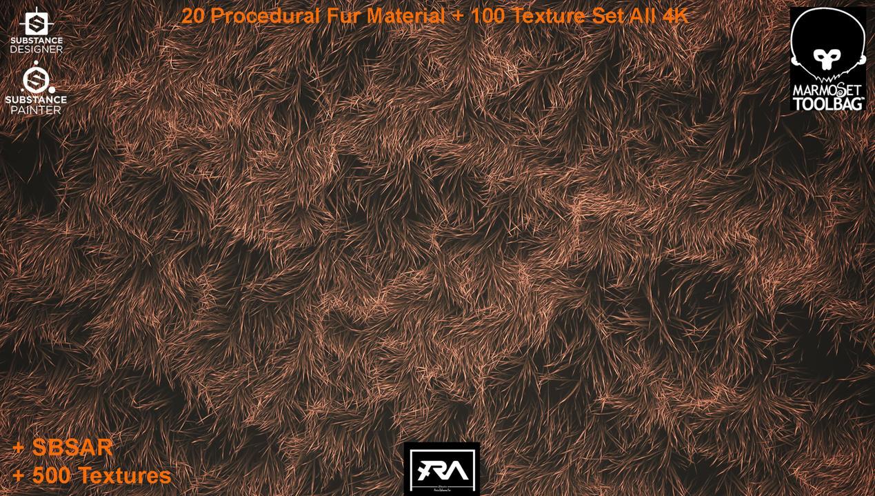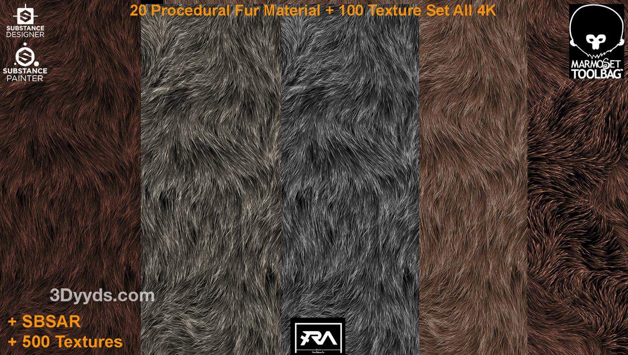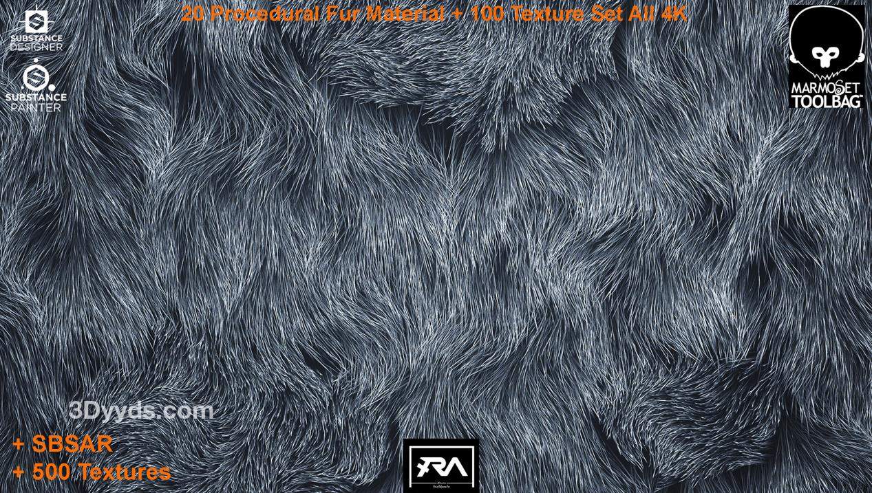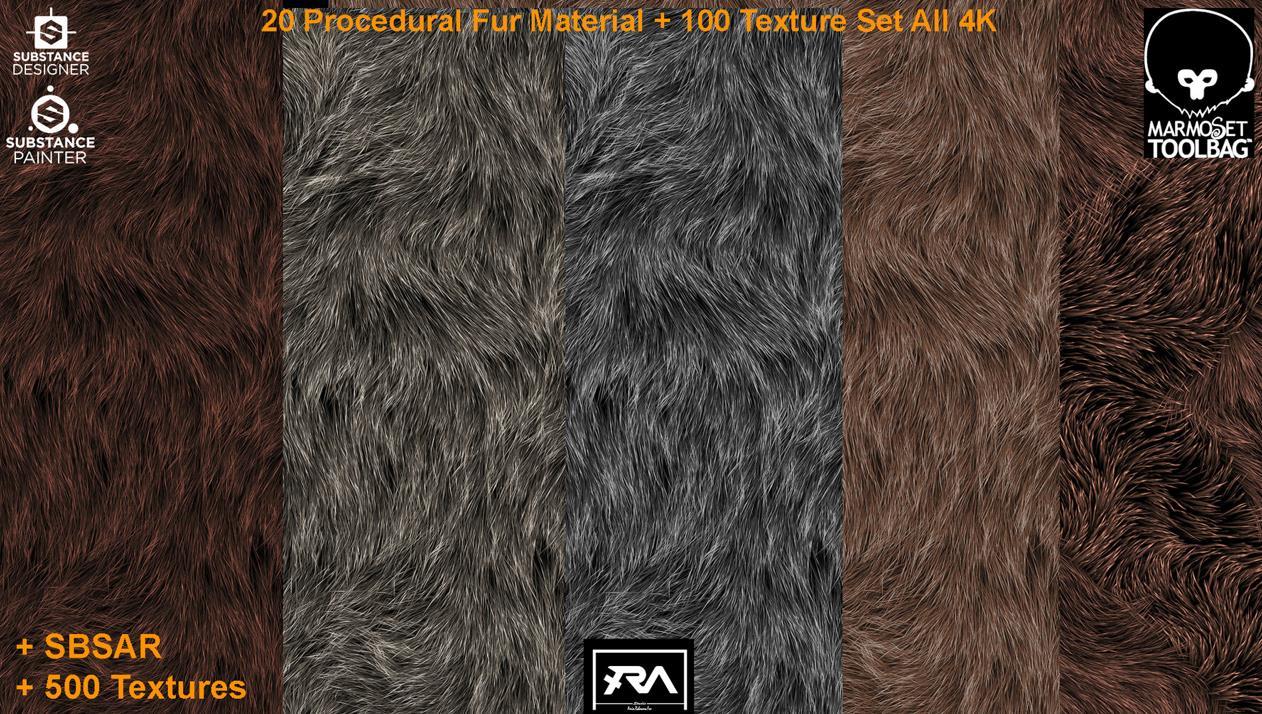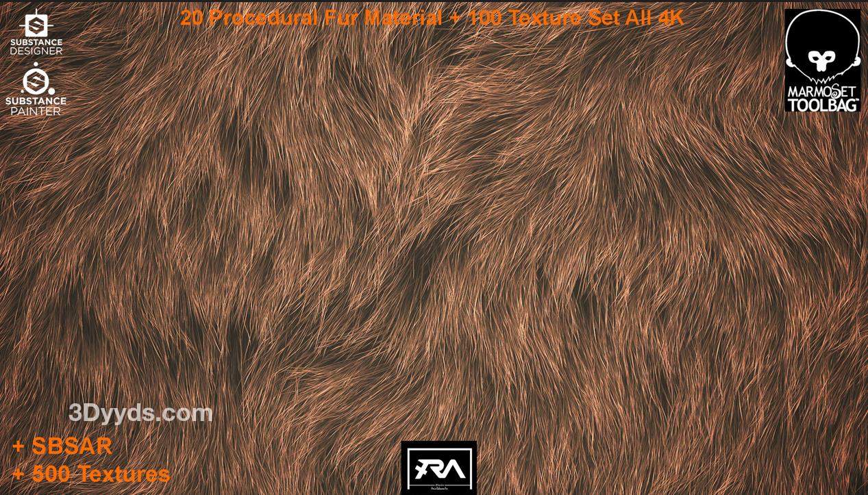 20 个程序化毛皮材质(可平铺)+ 100 材质集合(500 材质 4K - 5 种不同颜色)
