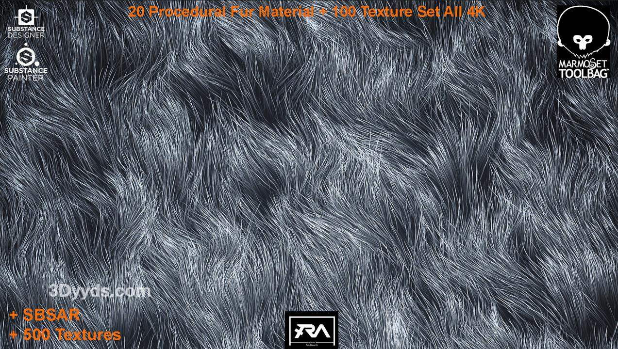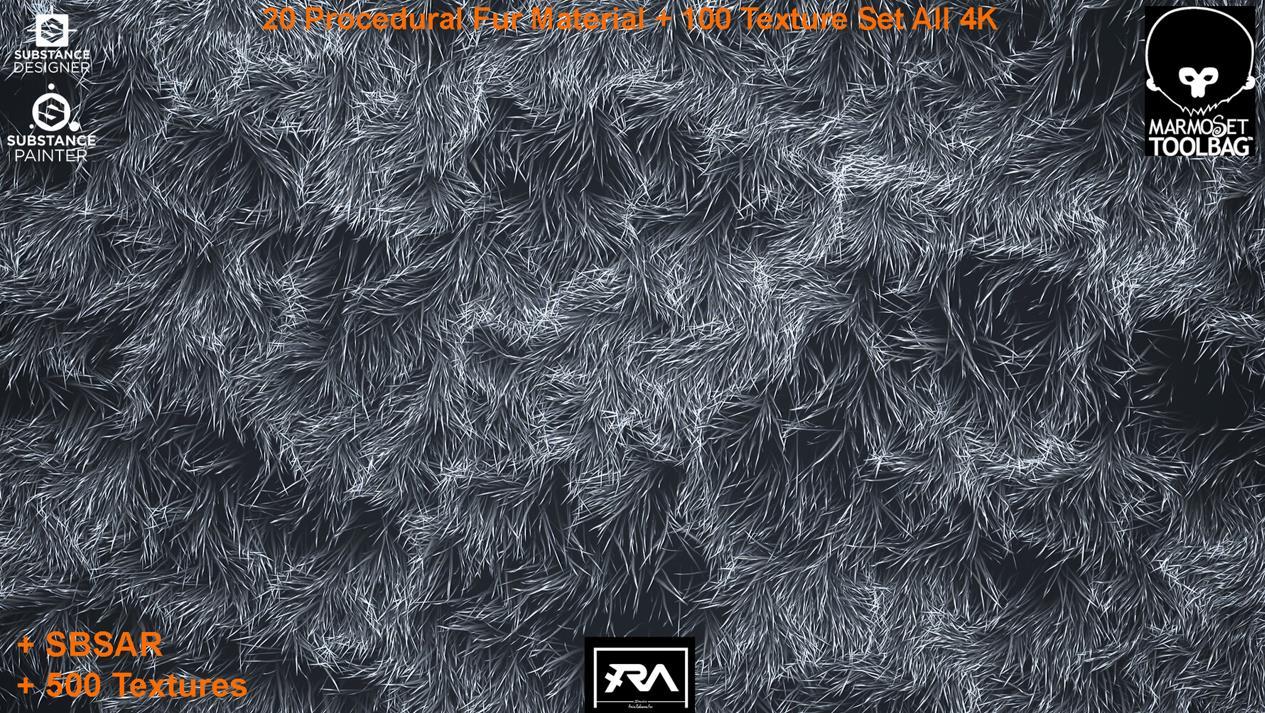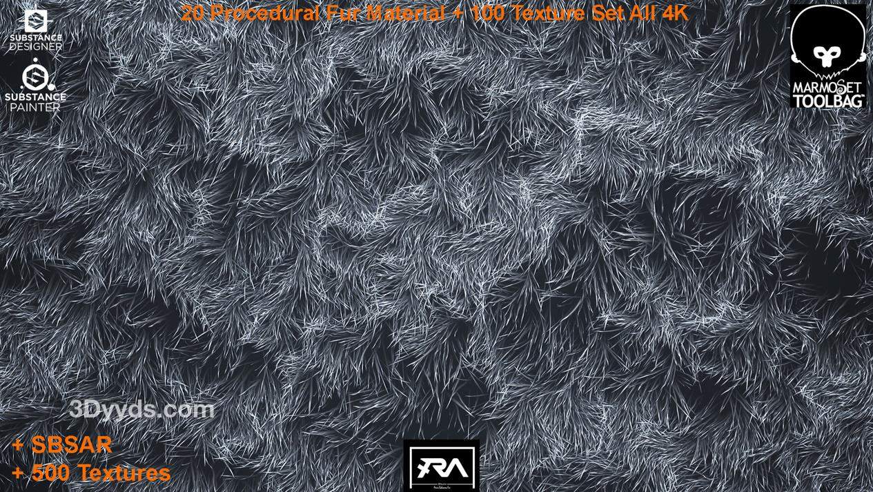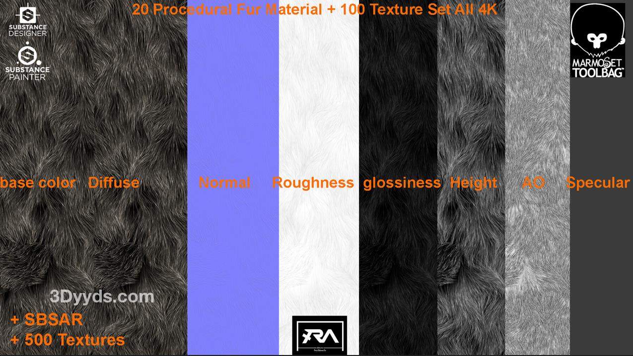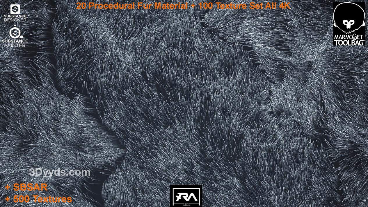 20 个程序化毛皮材质(可平铺)+ 100 材质集合(500 材质 4K - 5 种不同颜色)