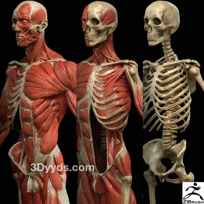 zbrush三维人体肌肉骨骼3D模型雕刻高精细ZTL写实男性骷髅分离