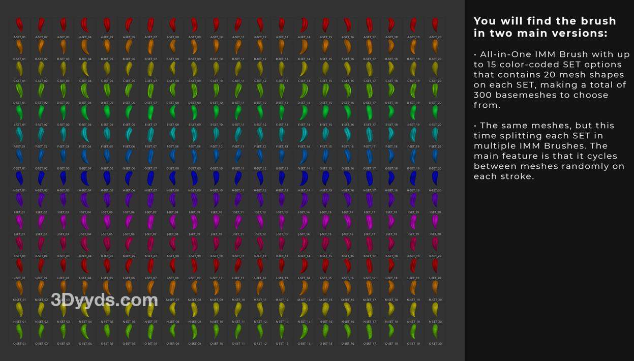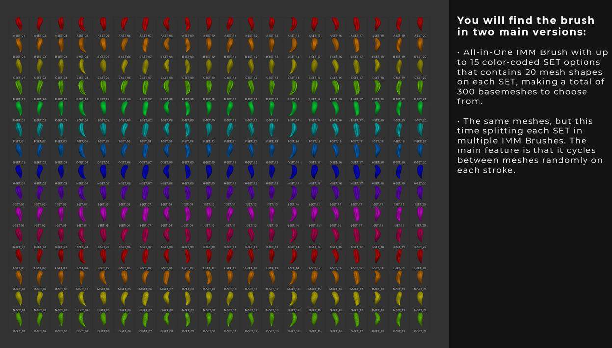 FastNFurry_IMM.ZBP 相同的网格,但这次将每个 SET 分成多个 IMM 刷子。其主要特点是每次笔划时随机循环网格。