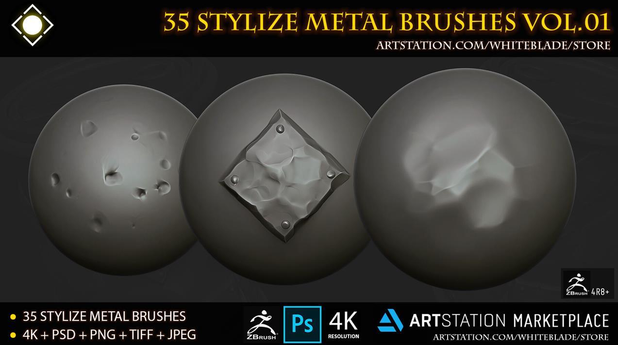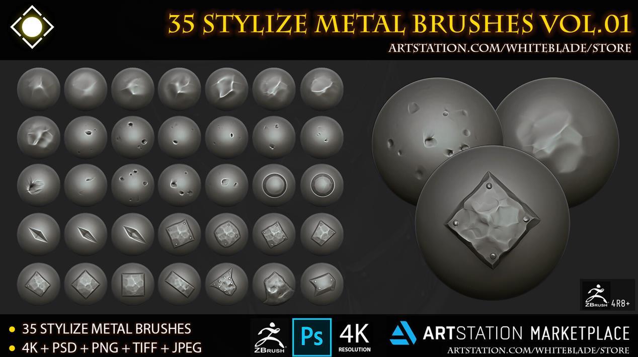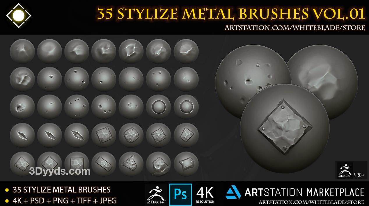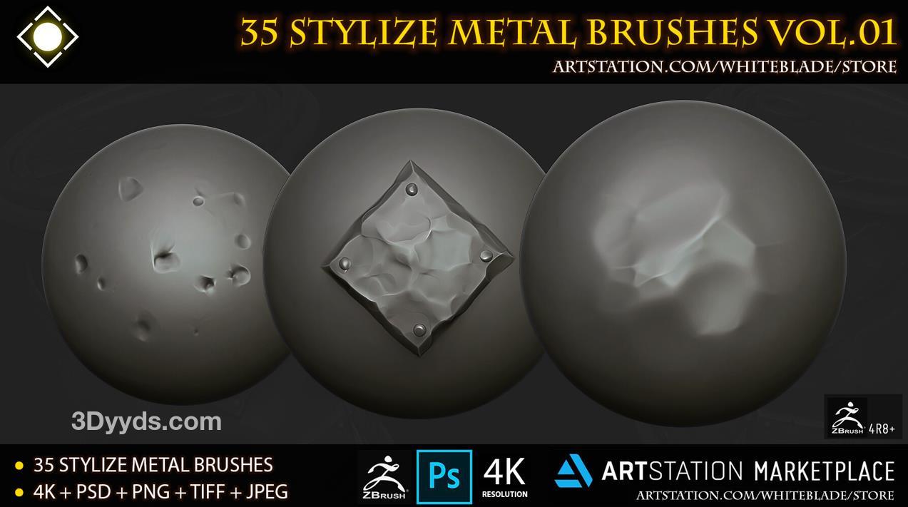 一套包含 35 个样式化金属笔刷和 4K 阿尔法的套装,适用于 ZBrush 和其他雕刻软件,如 Mudbox、3dCoat 等。
