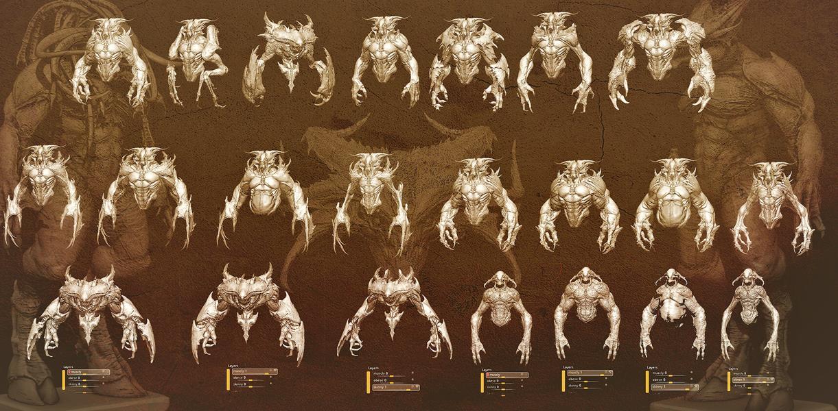 在ZBrush中的164个混合形状(肌肉、肥胖、瘦身版本和偶尔的独特形态)