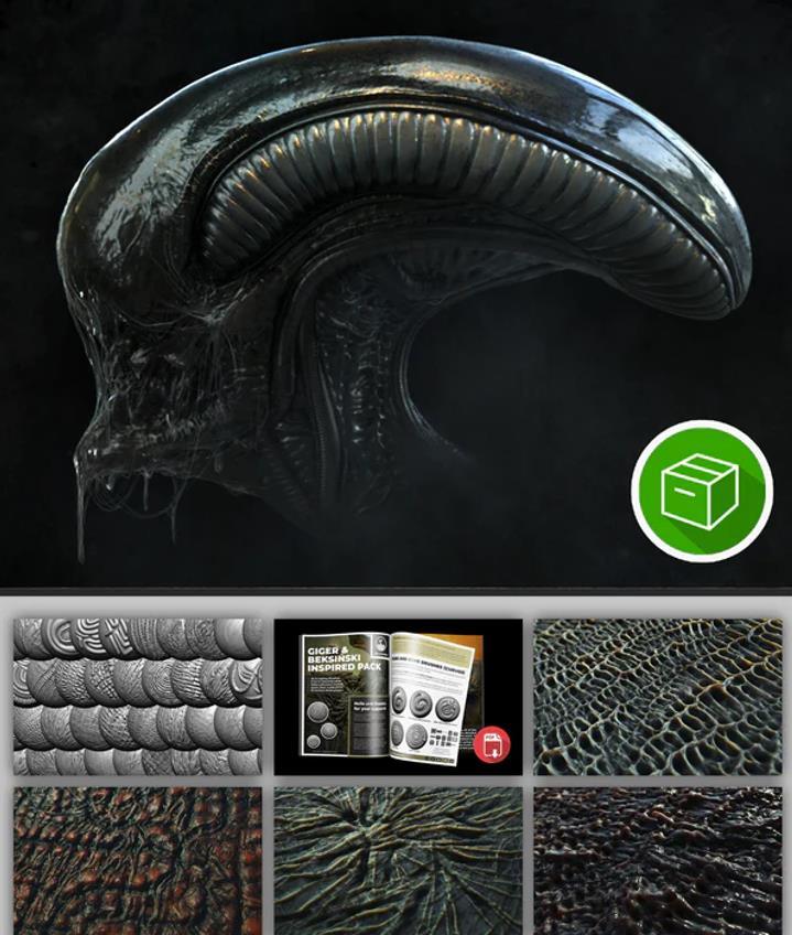 这个 45 支画笔包和奖励资源是我一直想做的“致敬”,它的灵感来自我最喜欢的两位艺术家:Hans Ruedi Giger 和 Zdzisław Beksinski。