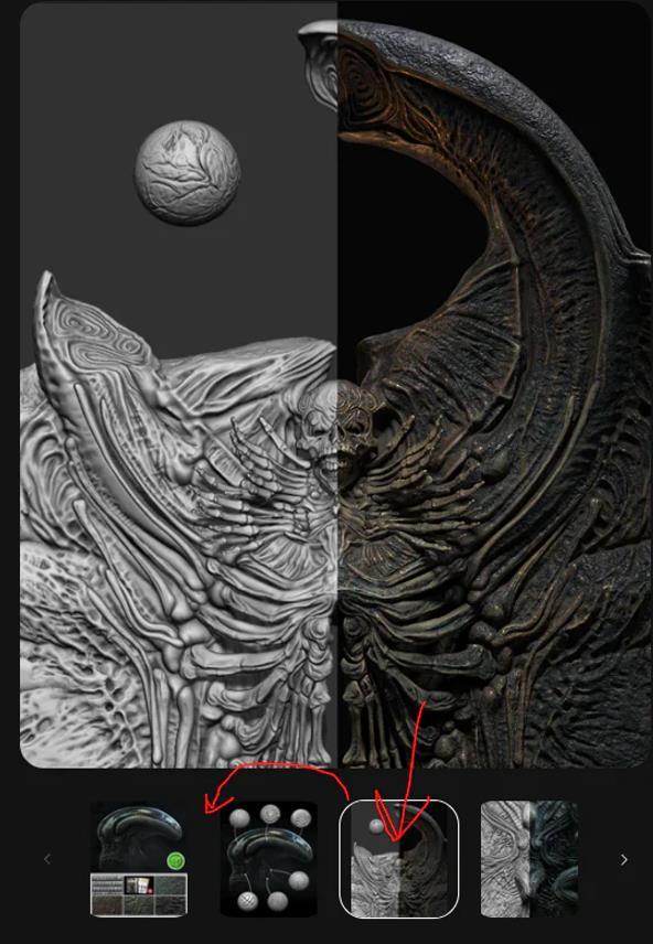 我在这个包中创建了画笔,以帮助您在 ZBrush 中雕刻类似于 Beksinski 和 Giger 的生物力学美学的反乌托邦超现实主义图案的细节。目的是为您提供一些工具来加快细节设计过程,并帮助您为项目创建有趣的图案。