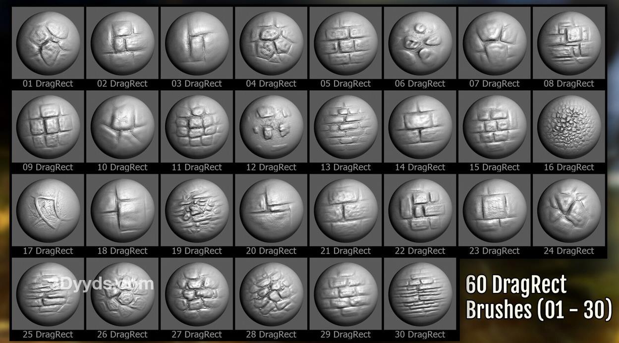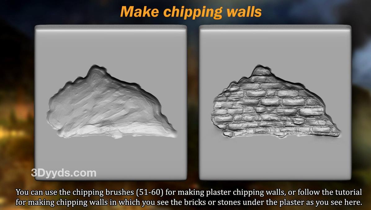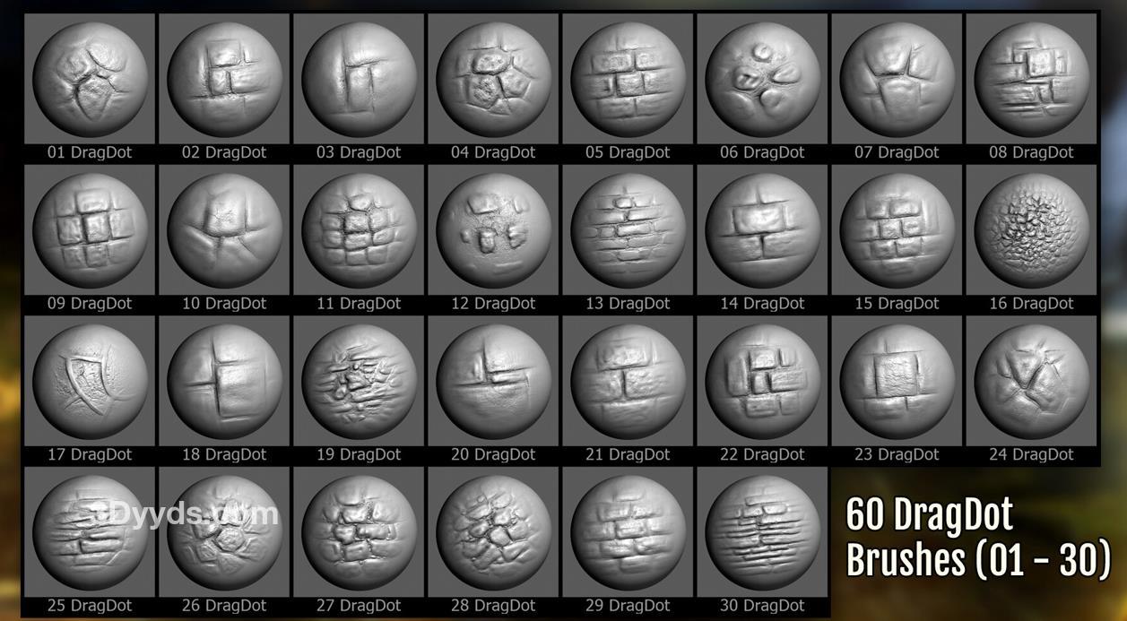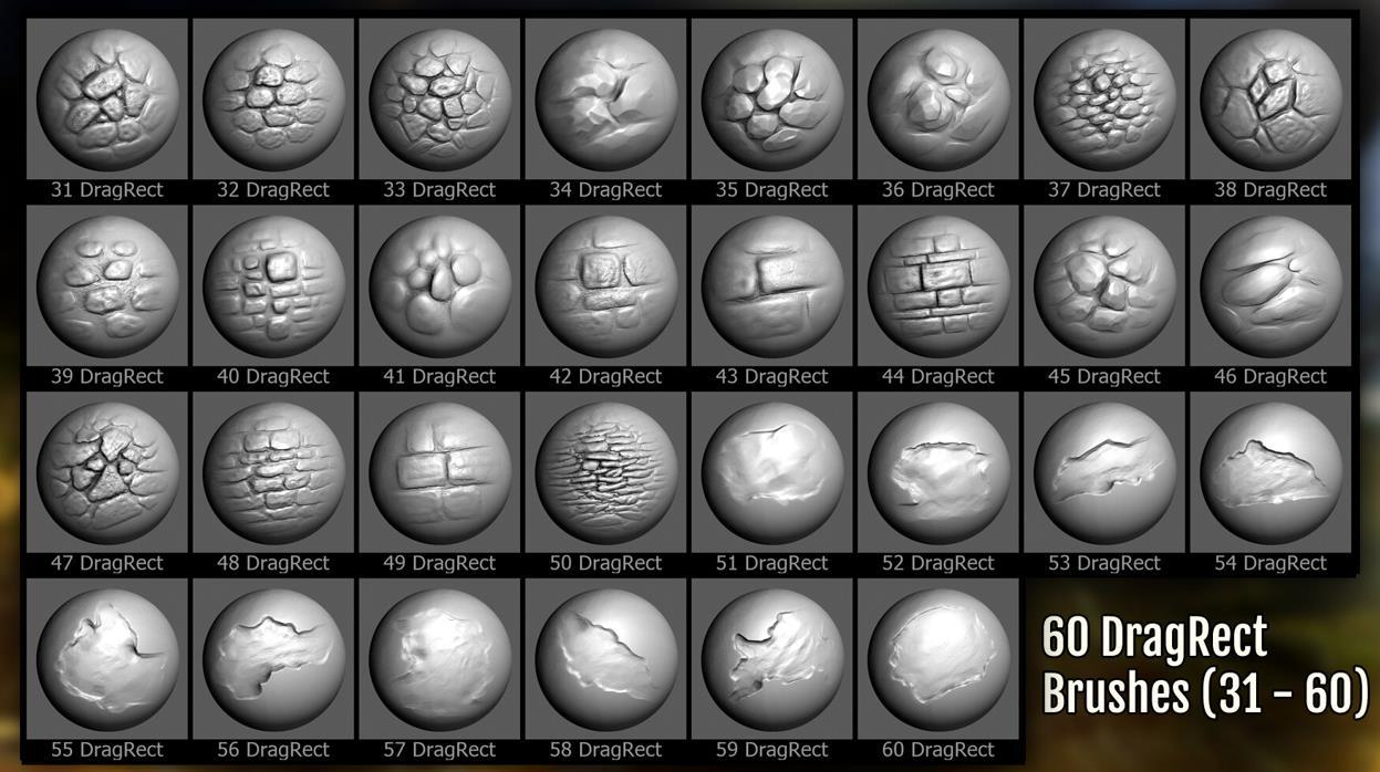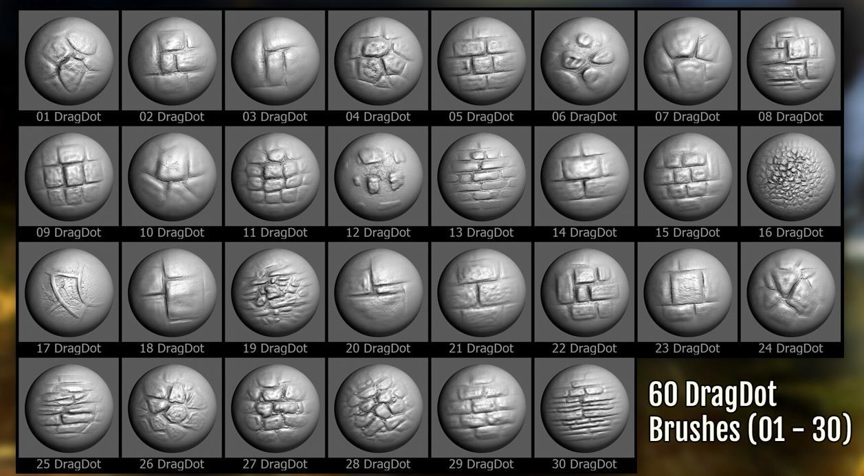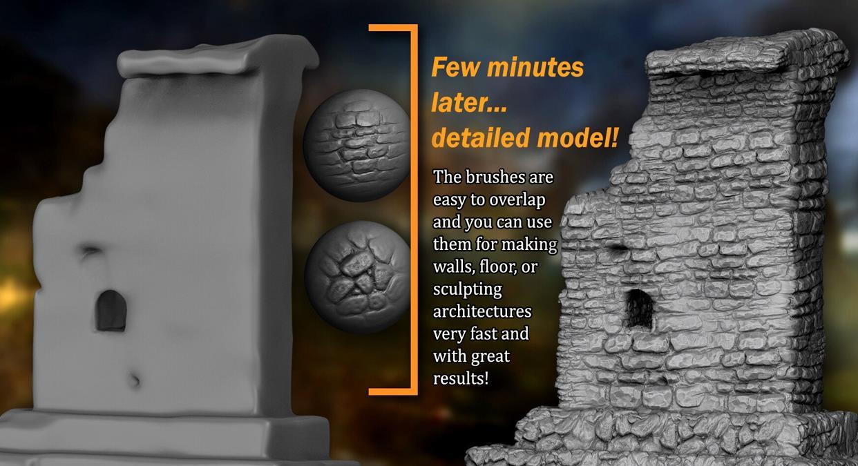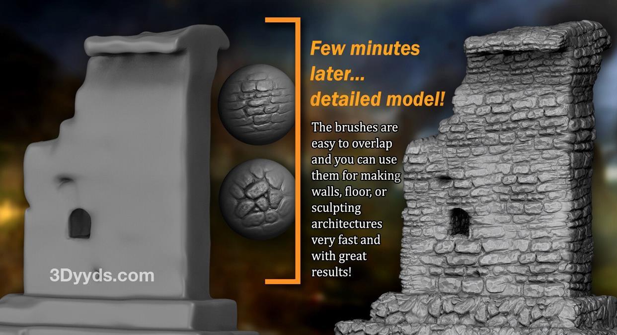 - 120个ZBrush画笔(60个DragRect和60个DragDot),用于雕刻石头、砖块、破损墙壁和石工砌体。
