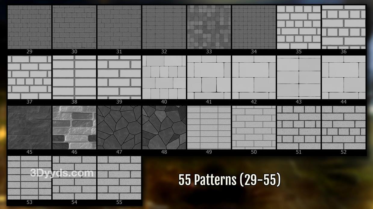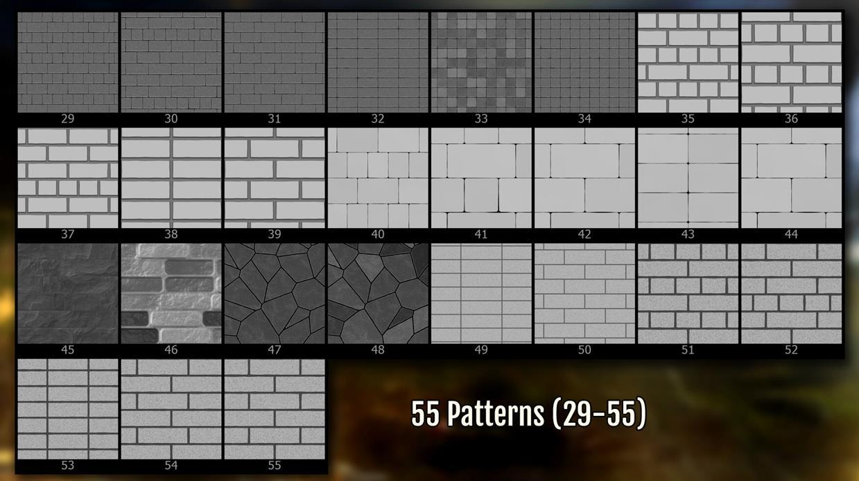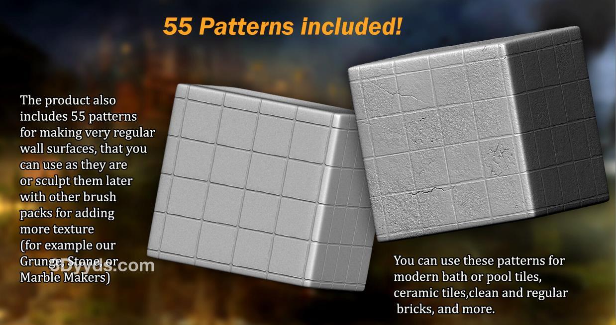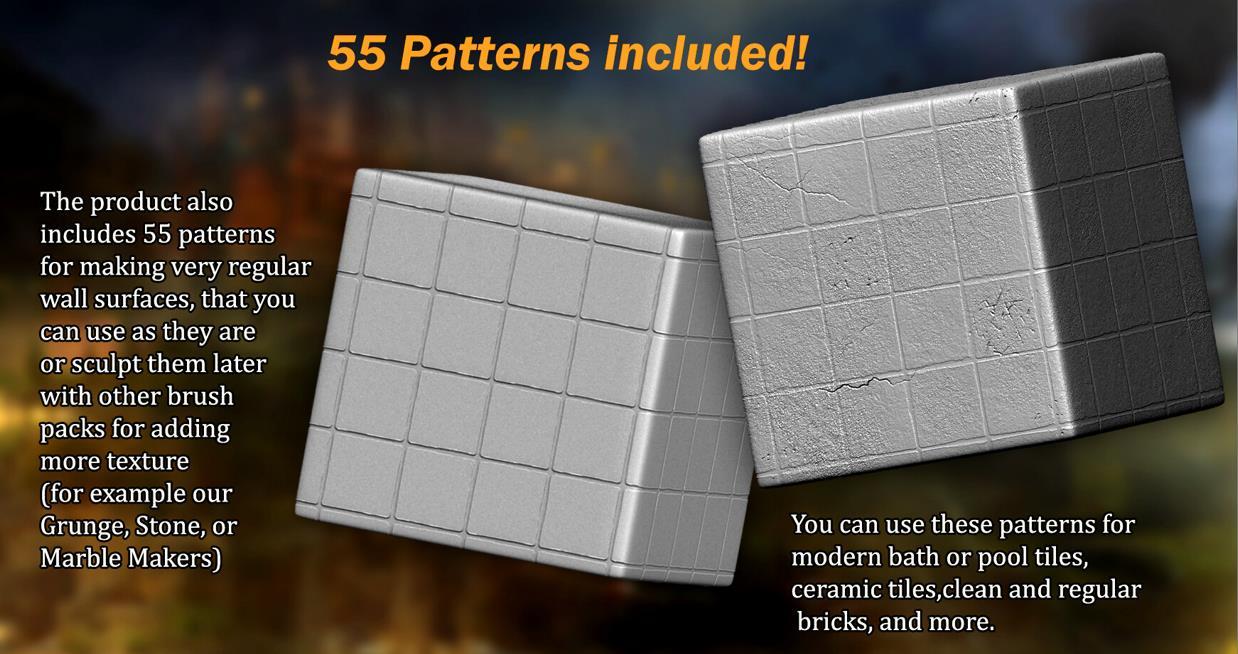 Wall Maker包括120个精心雕刻的ZBrush画笔,它们的60个ZBrush阿尔法,以及55个无缝纹理图案,您可以在任何程序中用于纹理处理,或在ZBrush中加载它们与噪声表面文件(也包含在内)。