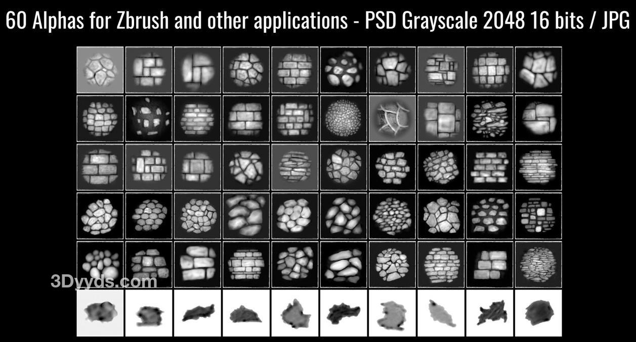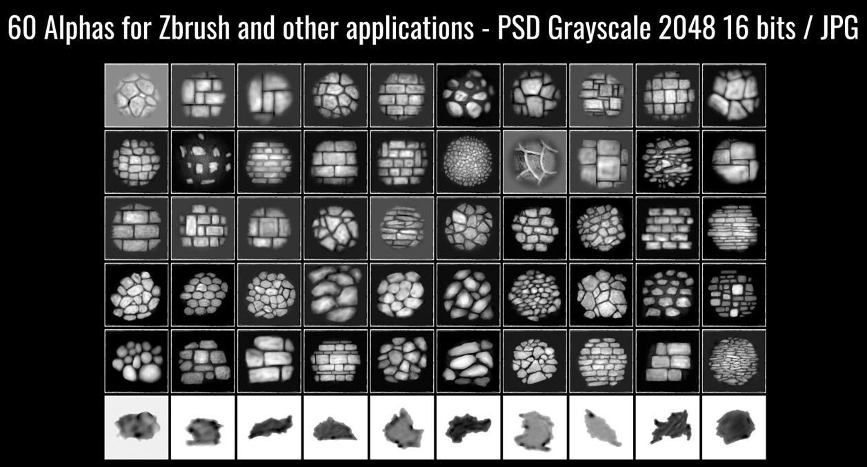 - 60个ZBrush的PSD阿尔法和支持中间点设置的3D应用程序。2048x2048像素,16位,灰度,PSD和JPG格式。