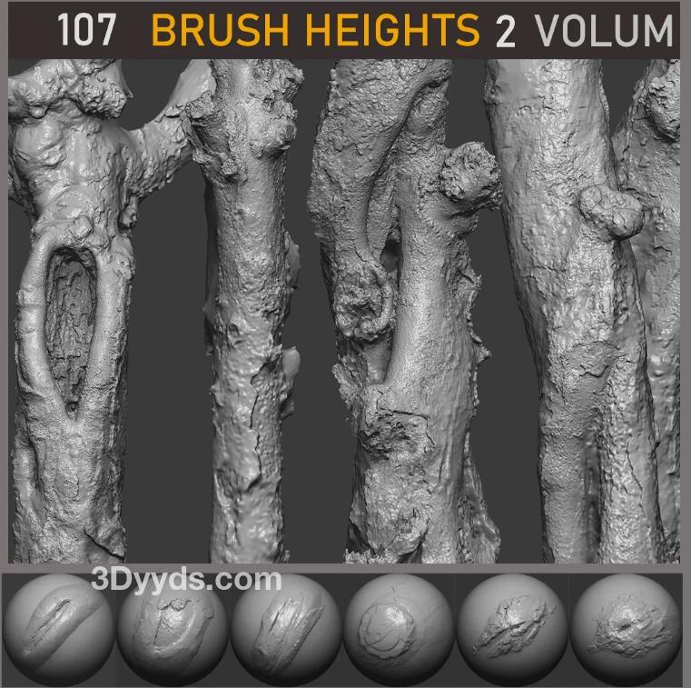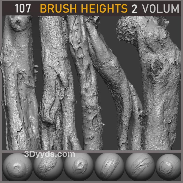 这是关于一组107个基于摄影测量的木料树干笔刷的描述,适用于Zbrush。这些笔刷已经准备好在Zbrush中导入使用。它们是通过高分辨率扫描树皮后进行制作的。