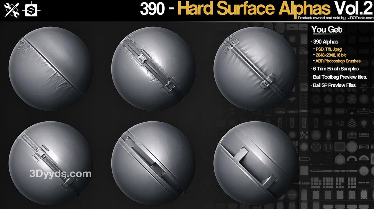这是我的硬表面alpha贴图的第二卷,最初作为一套350个alpha贴图出售,但目前包括390个alpha贴图 + 6个镶边笔刷。