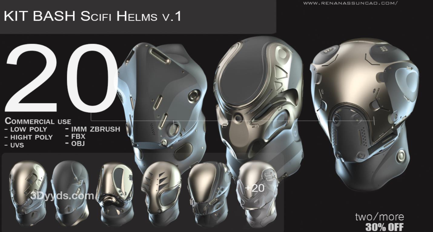 KITBASH SEASON - 20款独特的科幻头盔,可节省概念设计时间,您可以根据需要进行姿势调整,然后涂鸦或补充并自定义您的雕塑作品,为作品集或商业项目制作出色的作品。