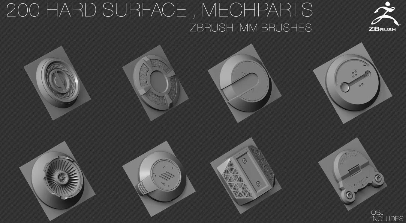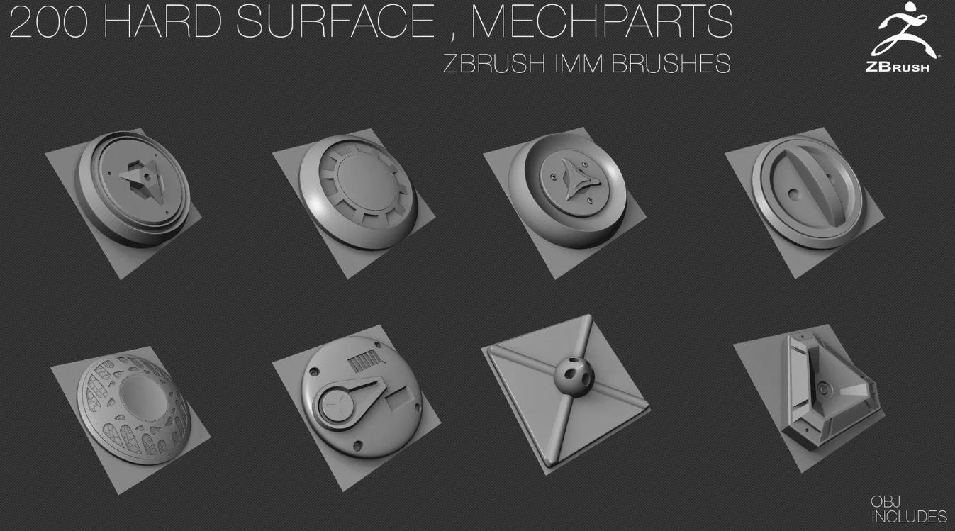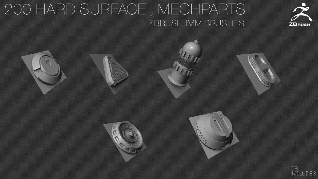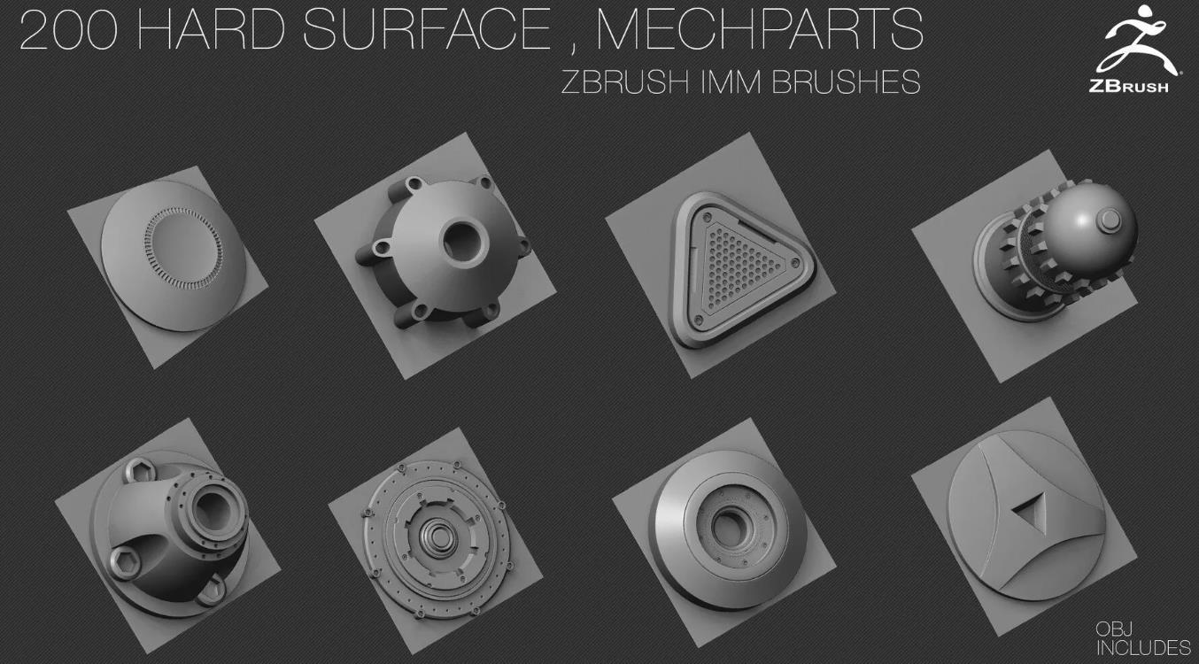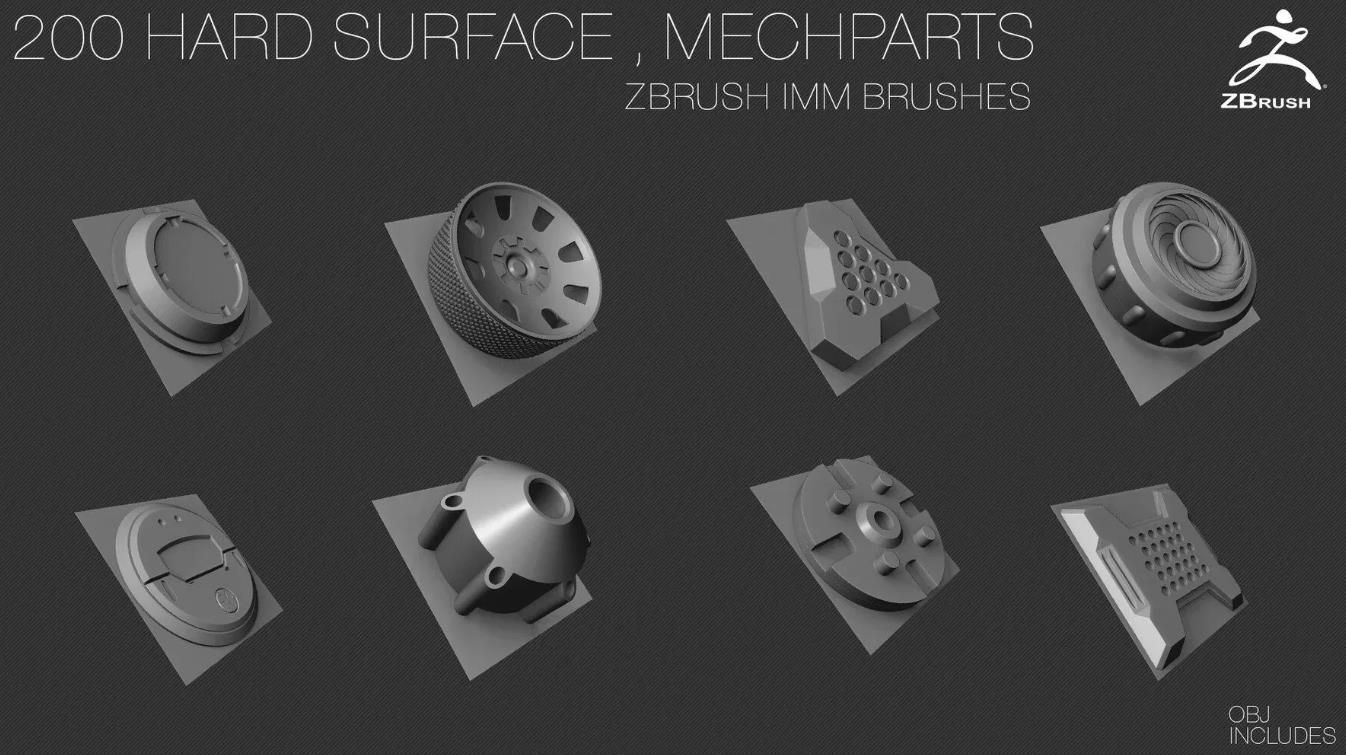 200个硬表面ZBrush IMM刷子 [OBJ] [中等拓扑] + Alpha [法线,AO]贴图