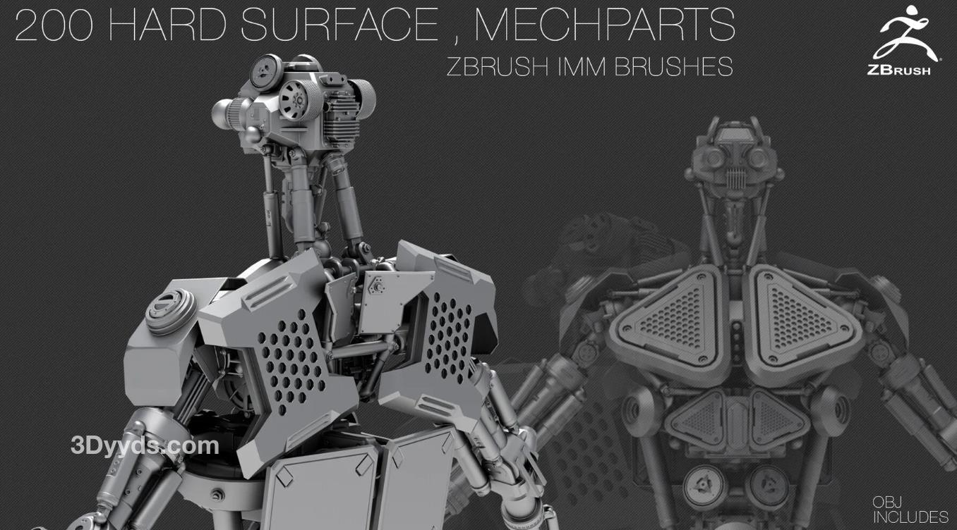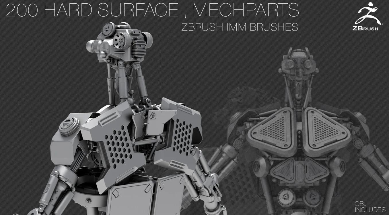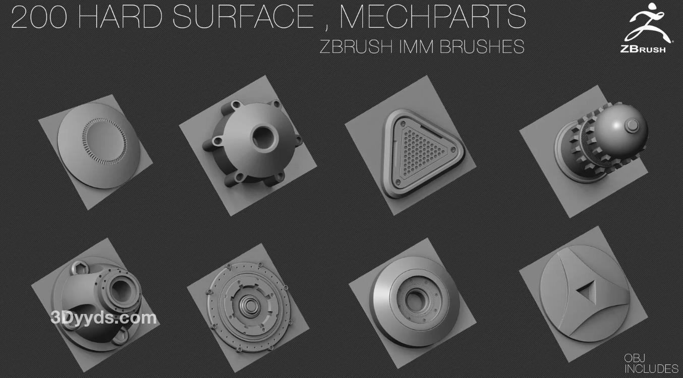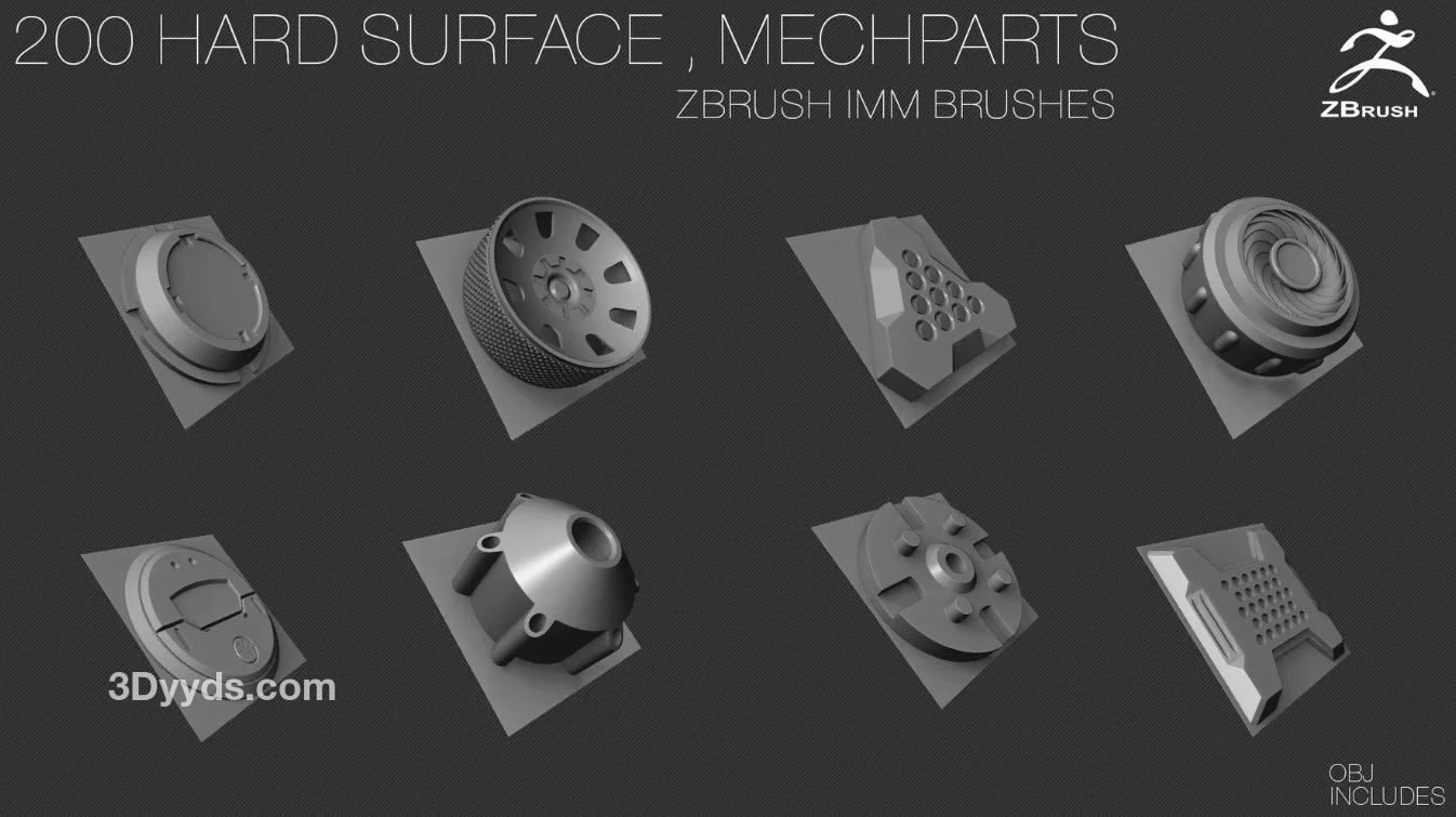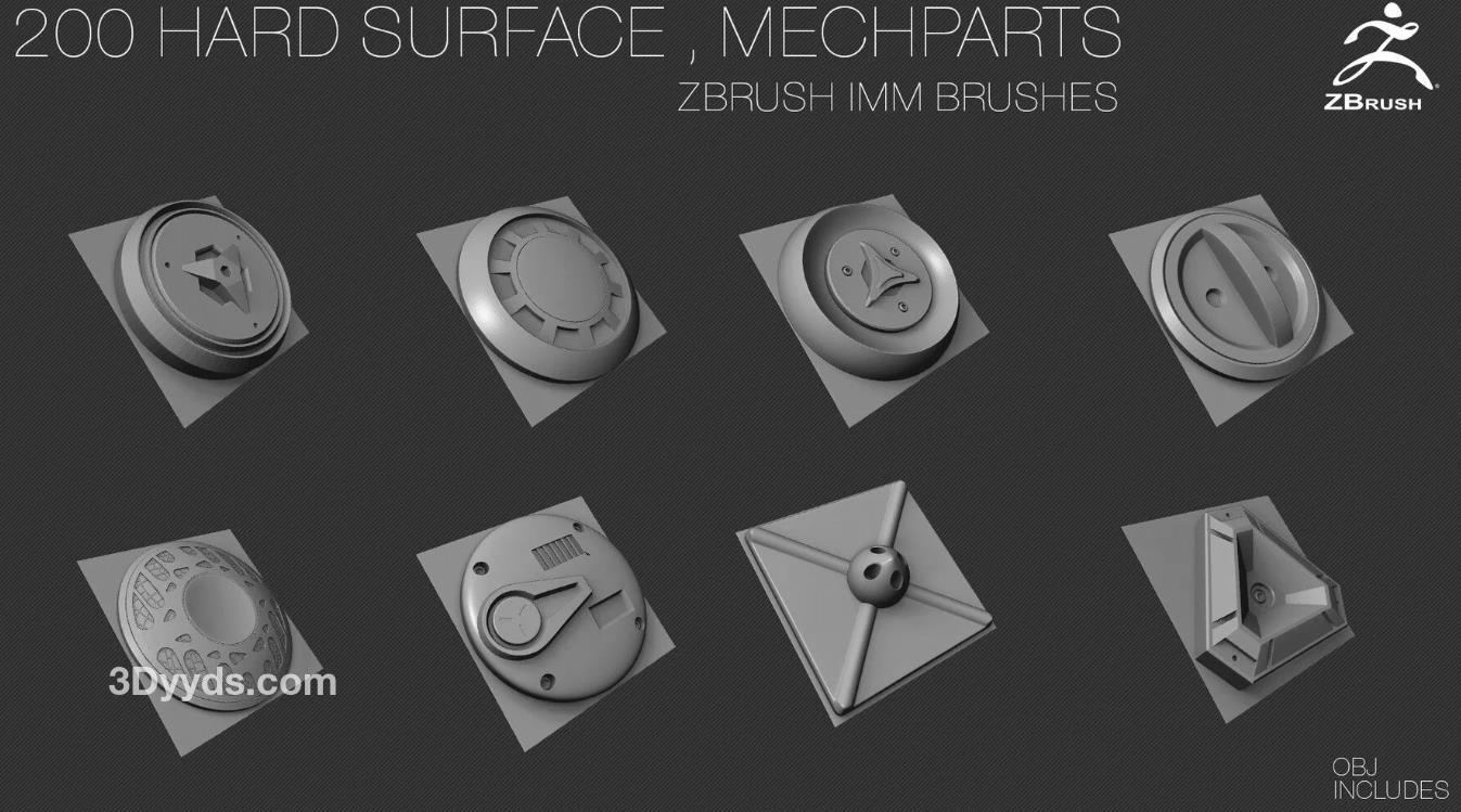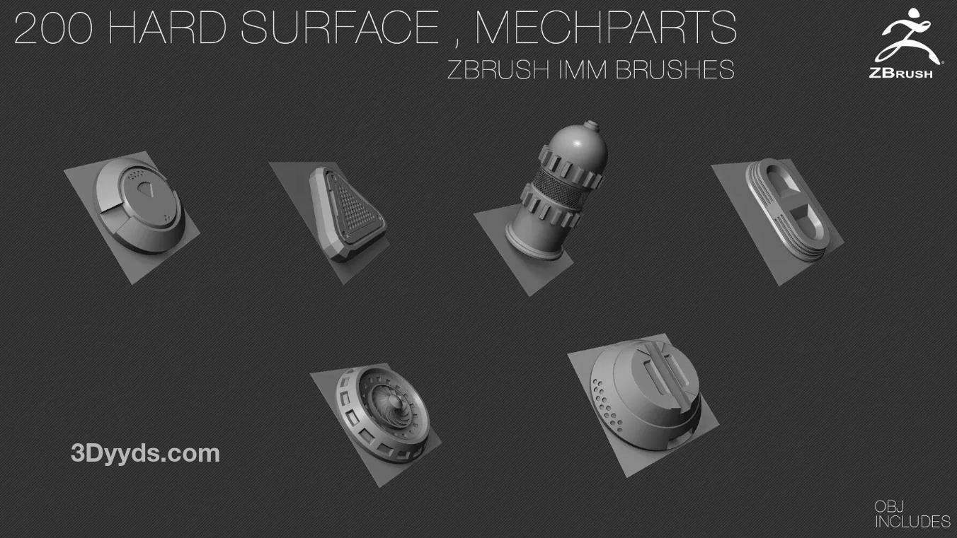 200个硬表面ZBrush IMM刷子 [OBJ] [中等拓扑] + Alpha [法线,AO]贴图