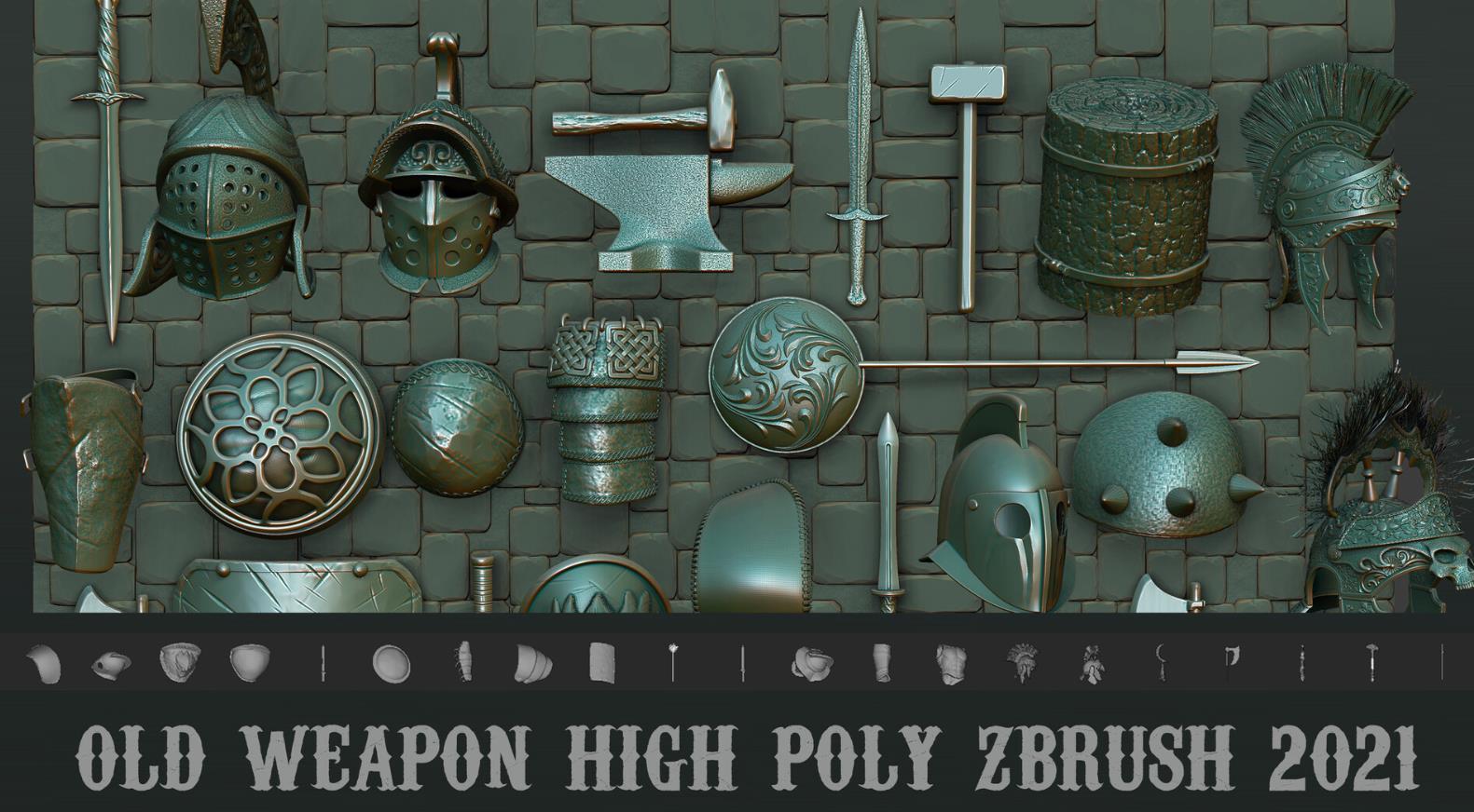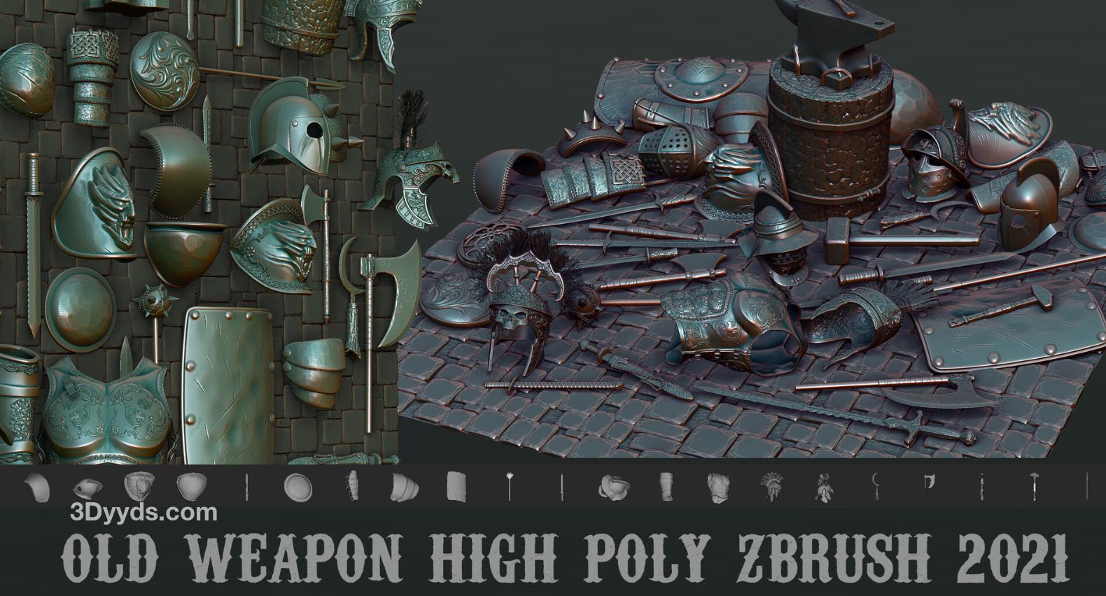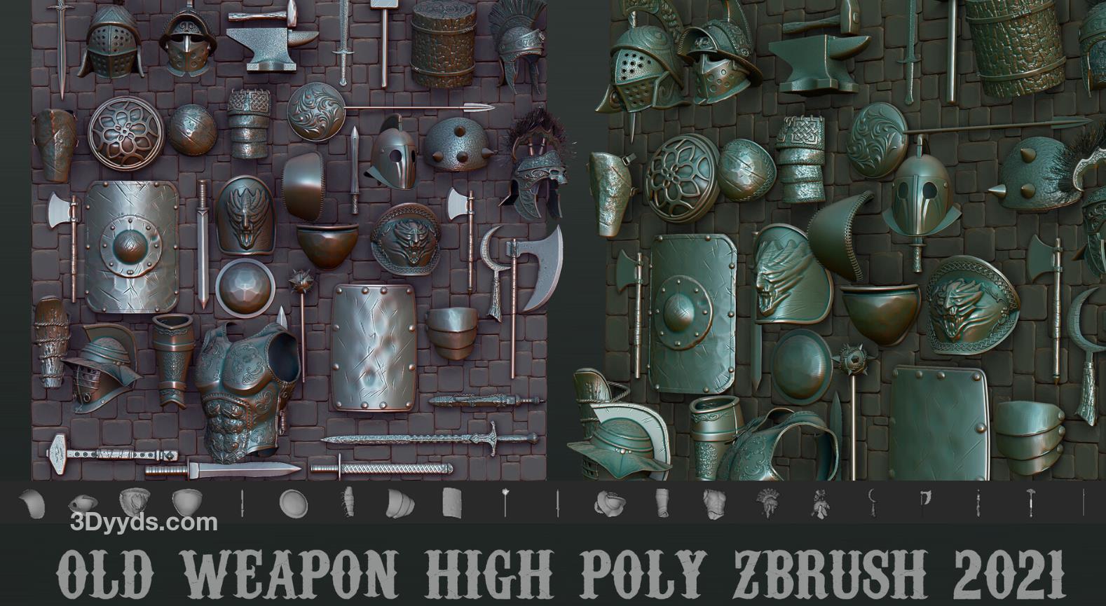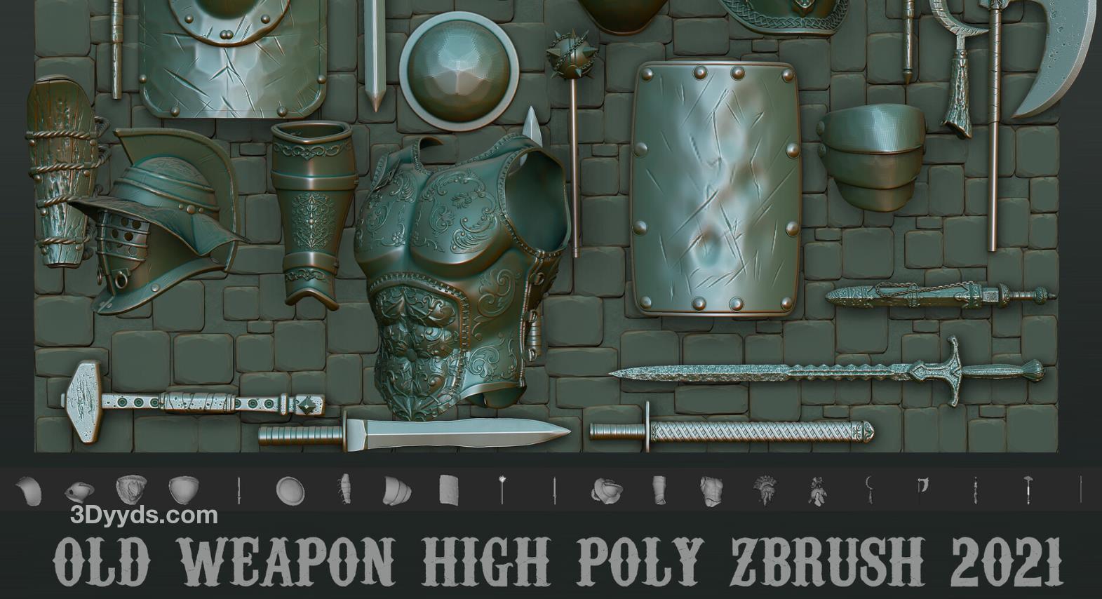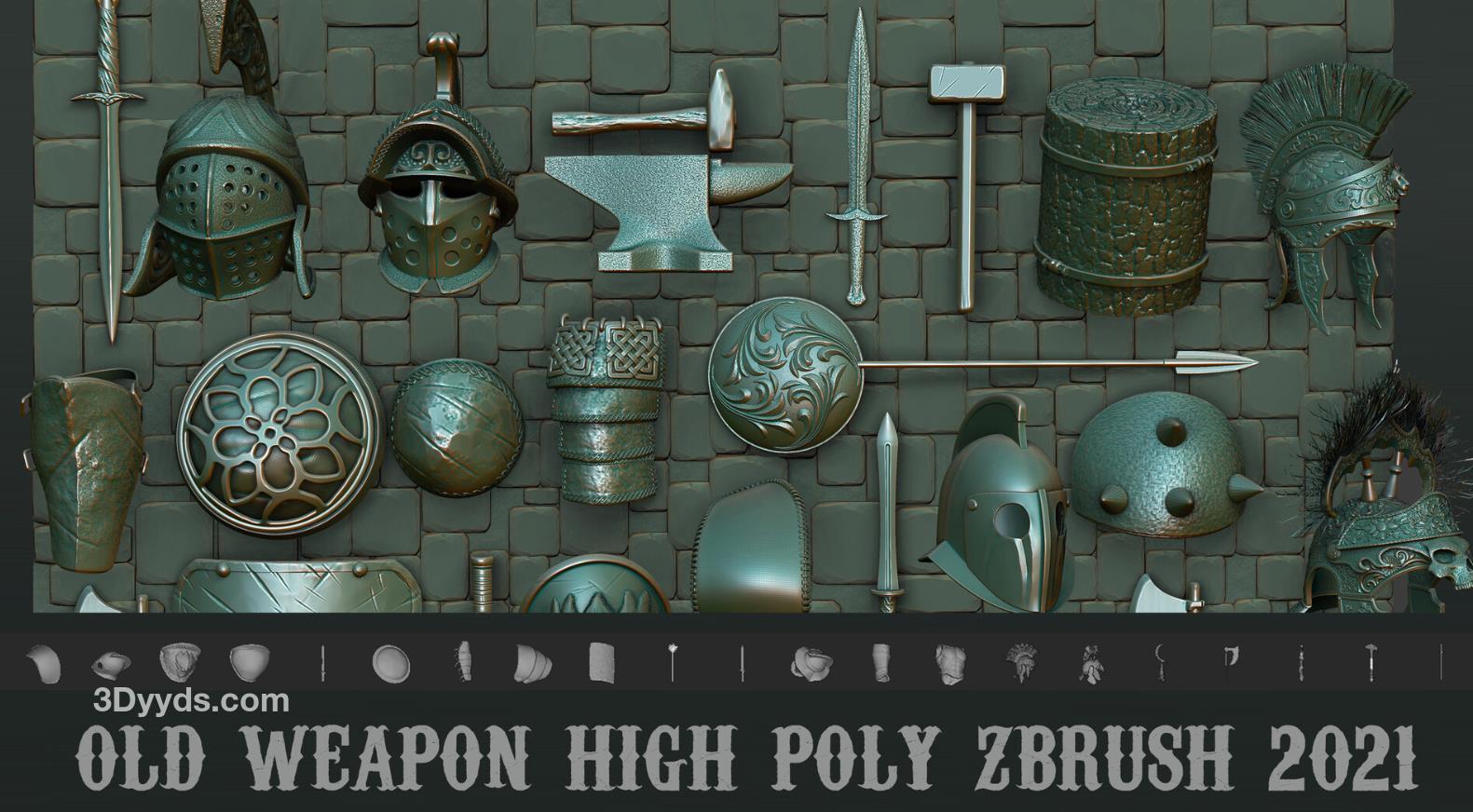zbrush228老实复古冷兵器盔甲斧头刀剑雕刻笔刷&铁头盔锤子匕首
