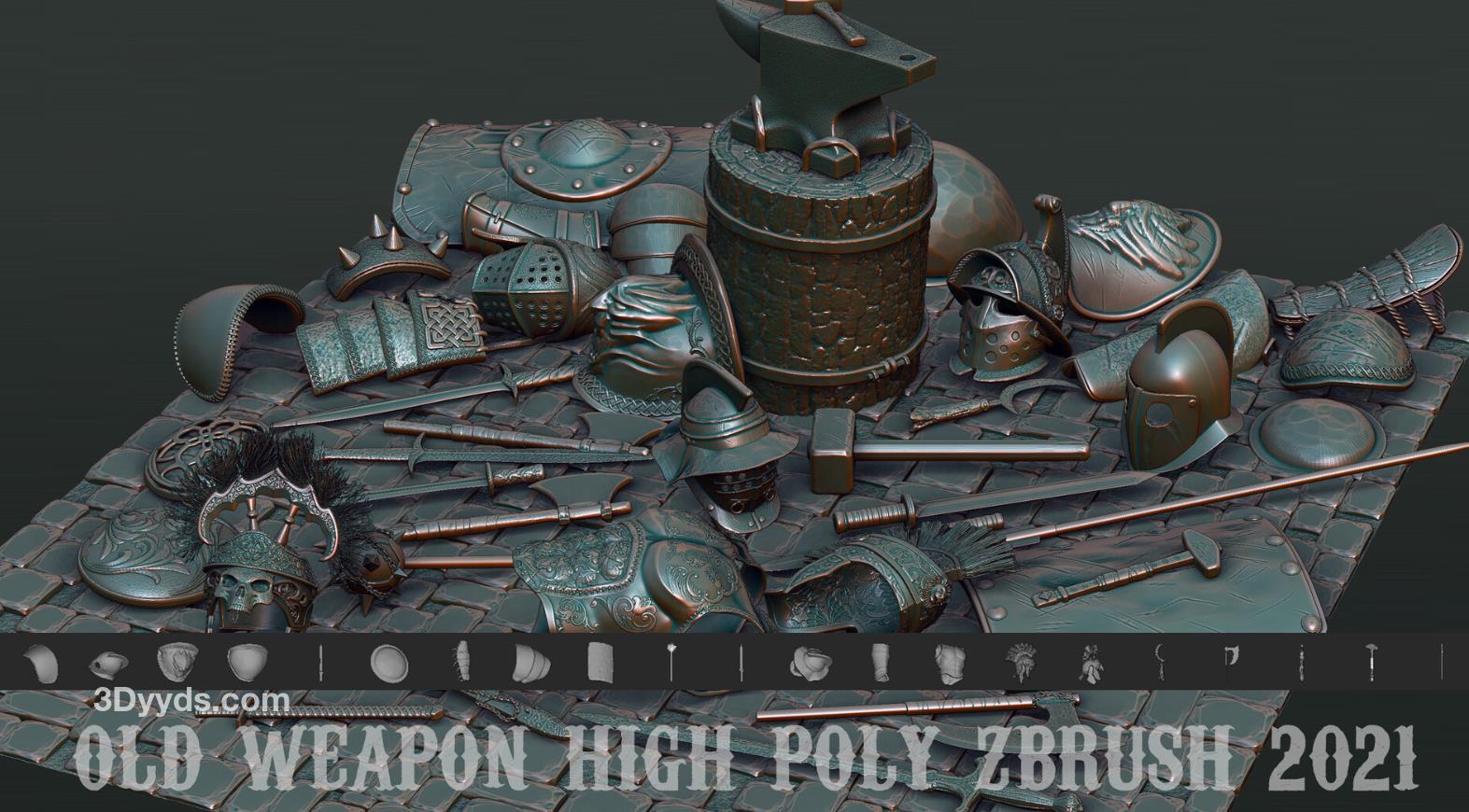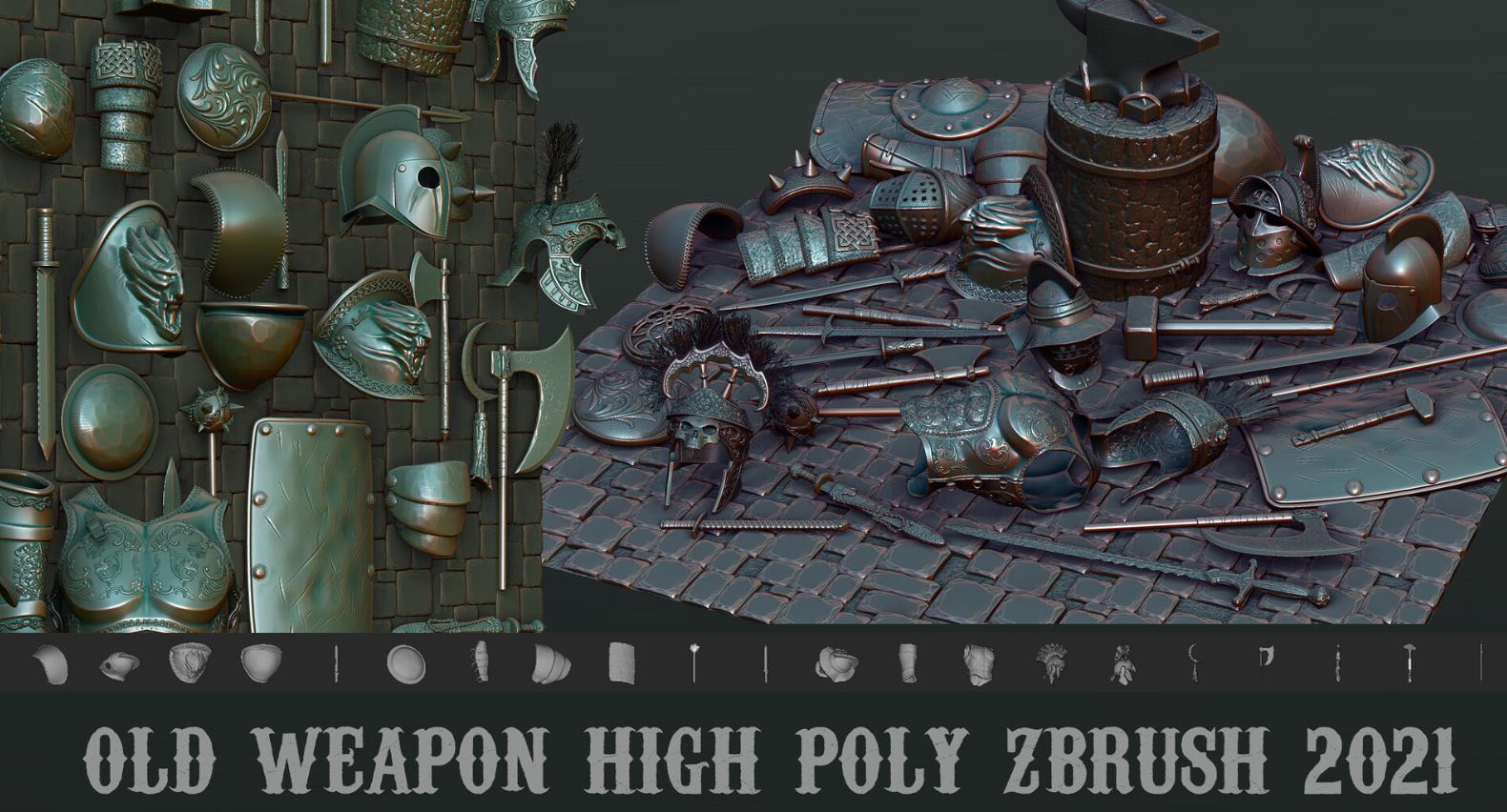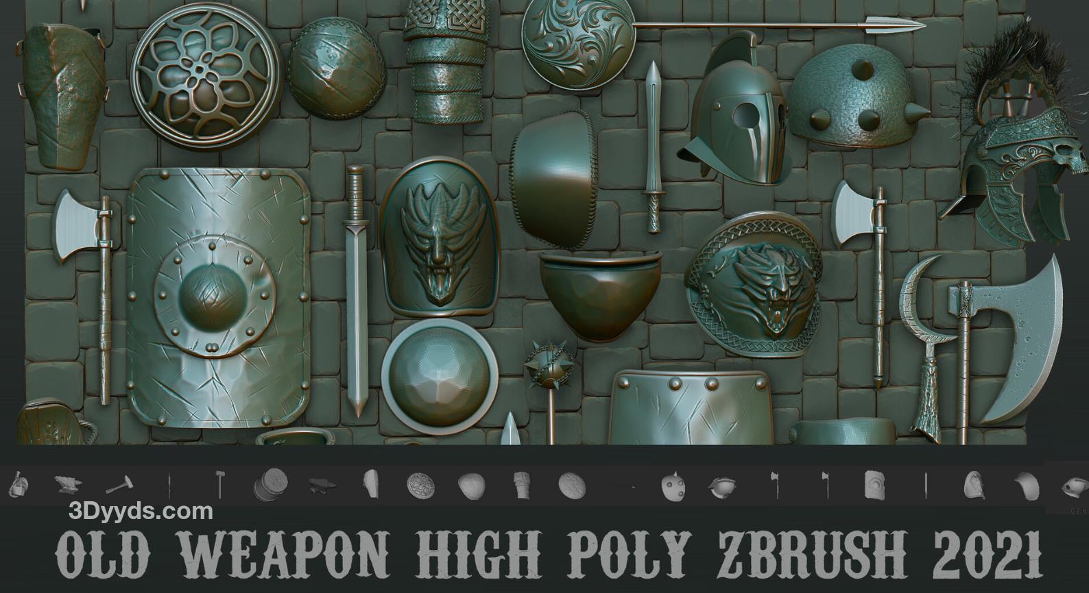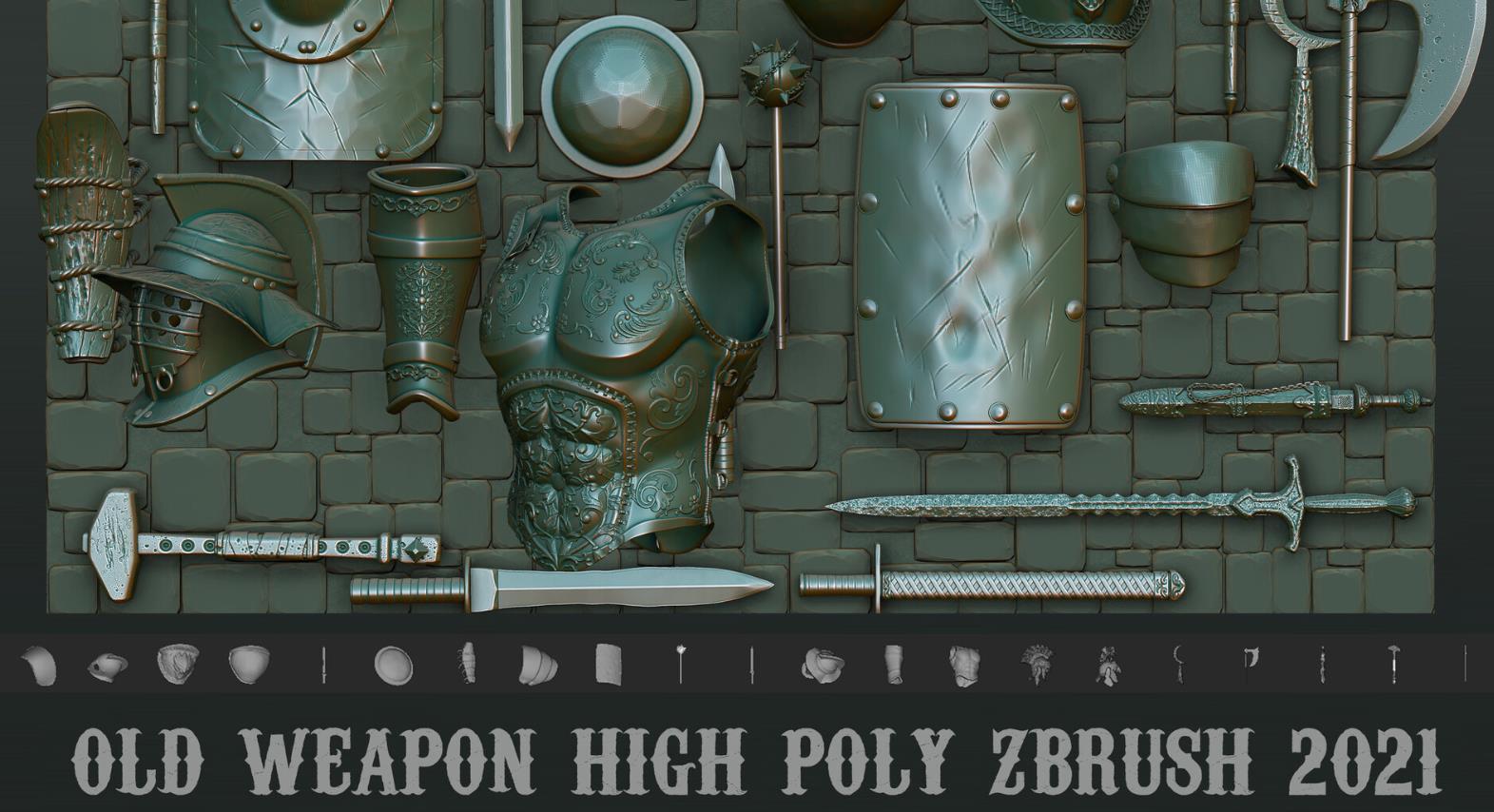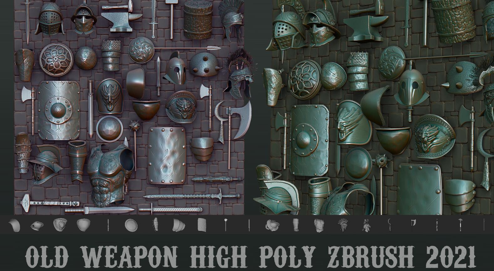 zbrush228老实复古冷兵器盔甲斧头刀剑雕刻笔刷&铁头盔锤子匕首