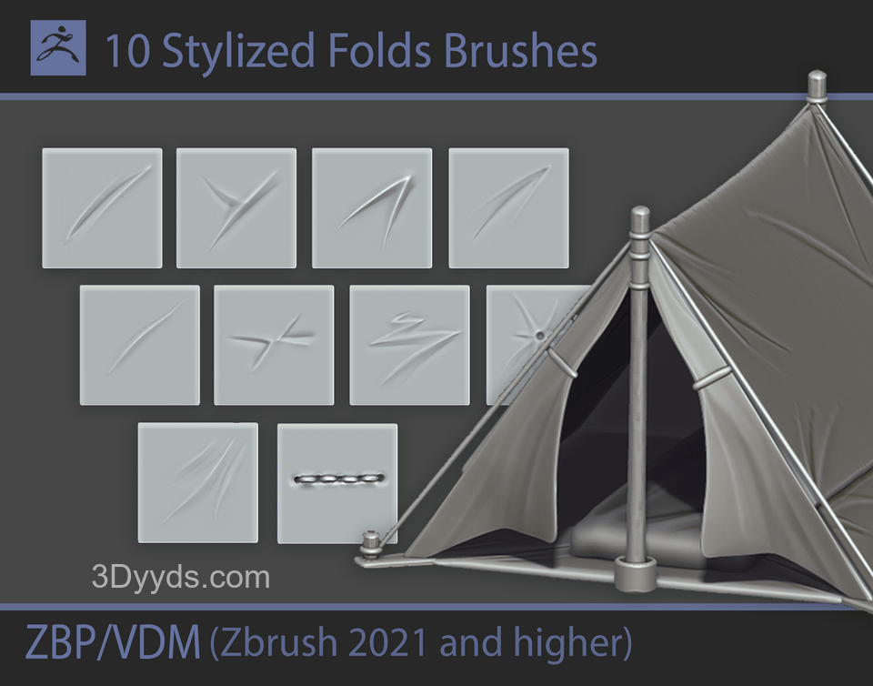 一套 10 款适用于 Zbrush 的风格化 VDM Folds 笔刷。使用这些笔刷,您可以快速创建织物纹理并使您的衣服多样化。这些笔刷仅在 Zbrush 2021 (6.6) 及更高版本中受支持。