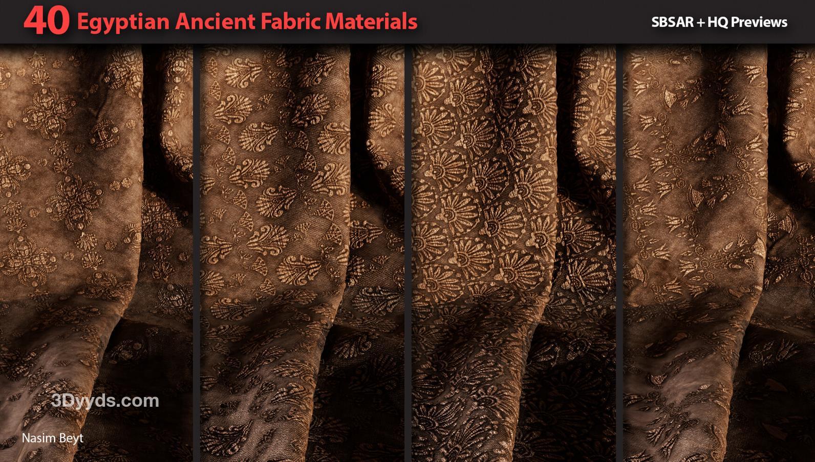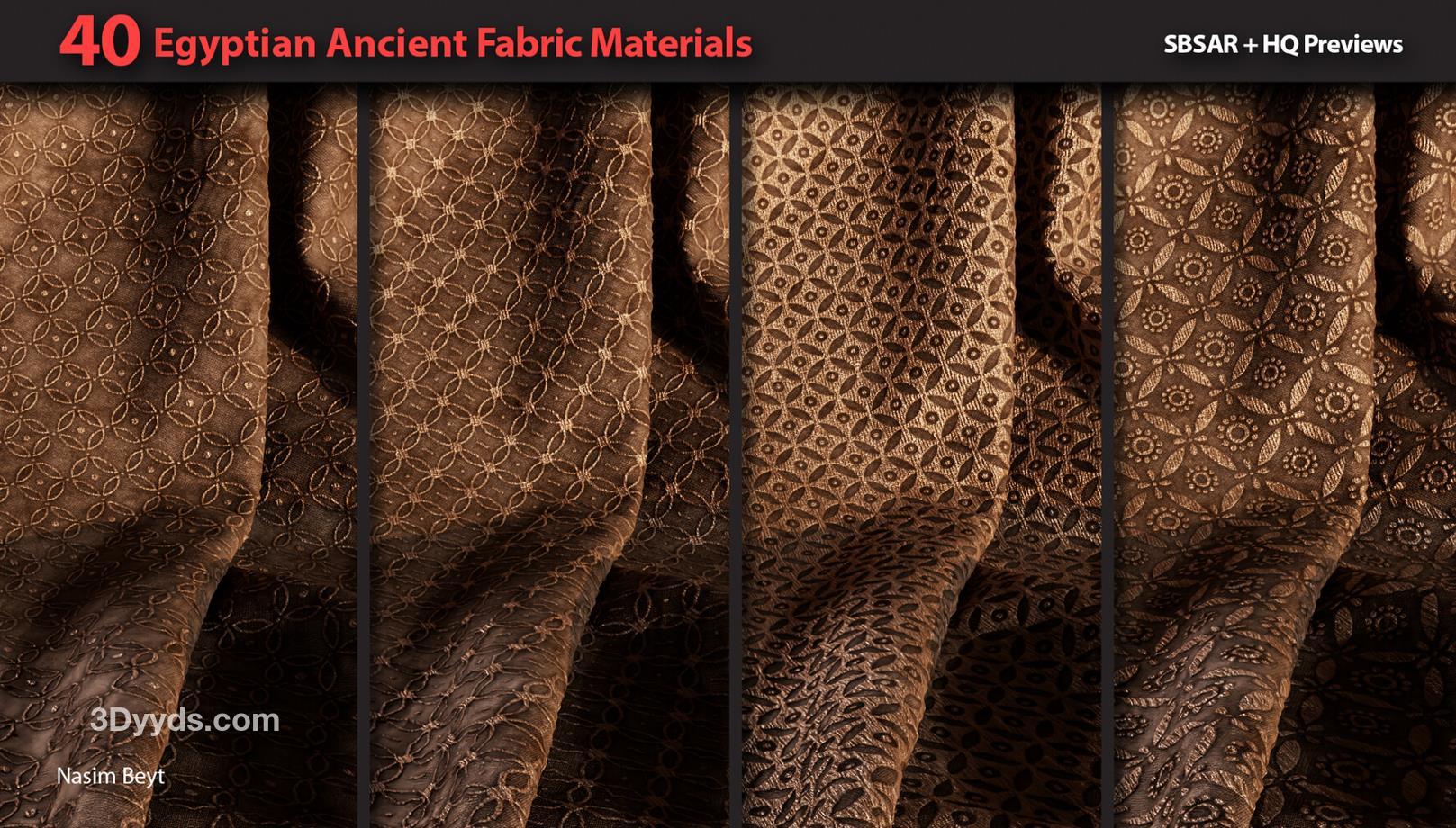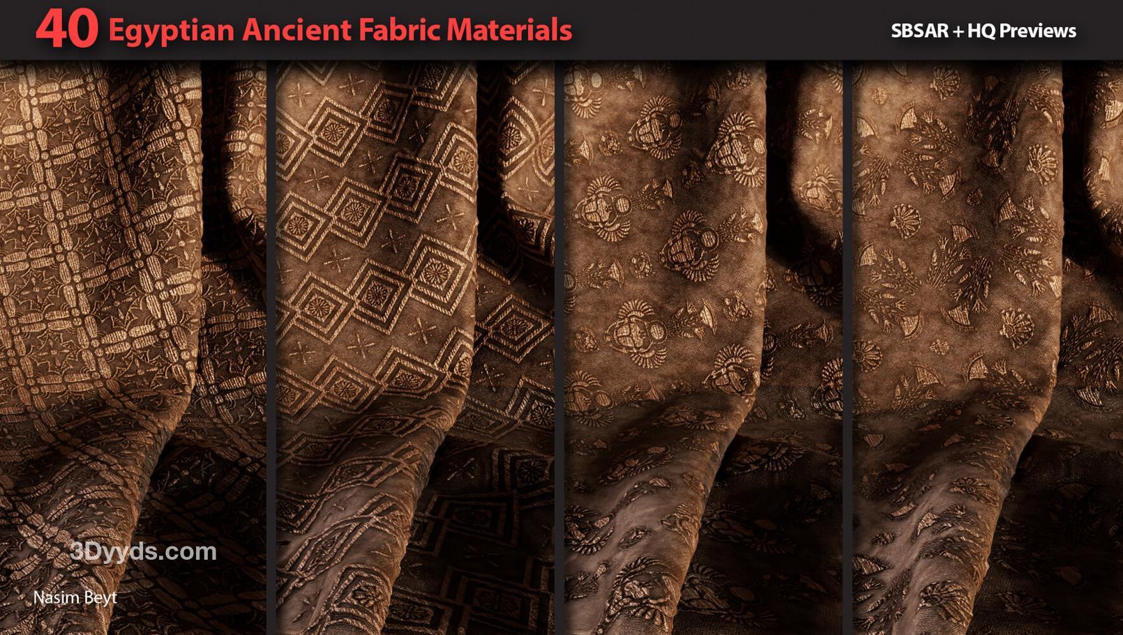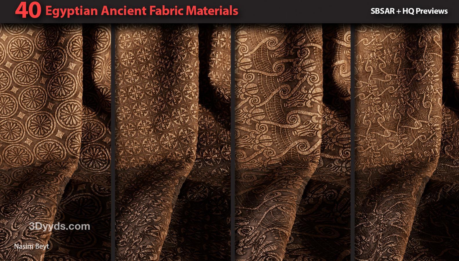 这些信息详细描述了一个包含40种不同埃及风格织物图案的资源包,适用于多种3D制作软件和纹理编辑需求。