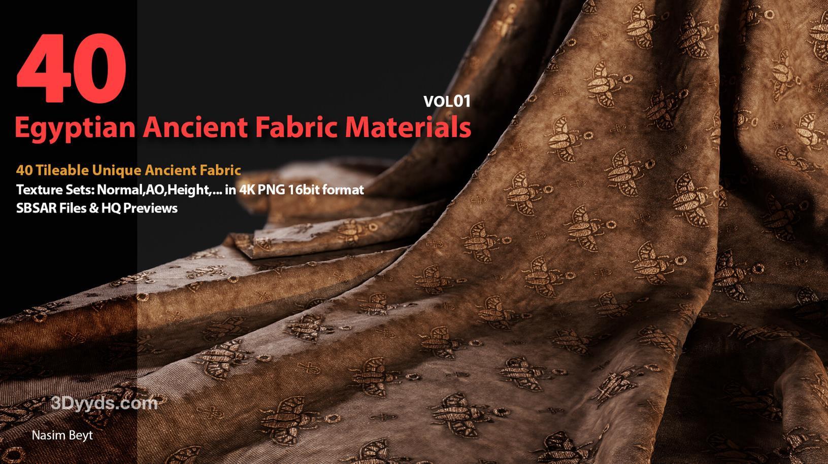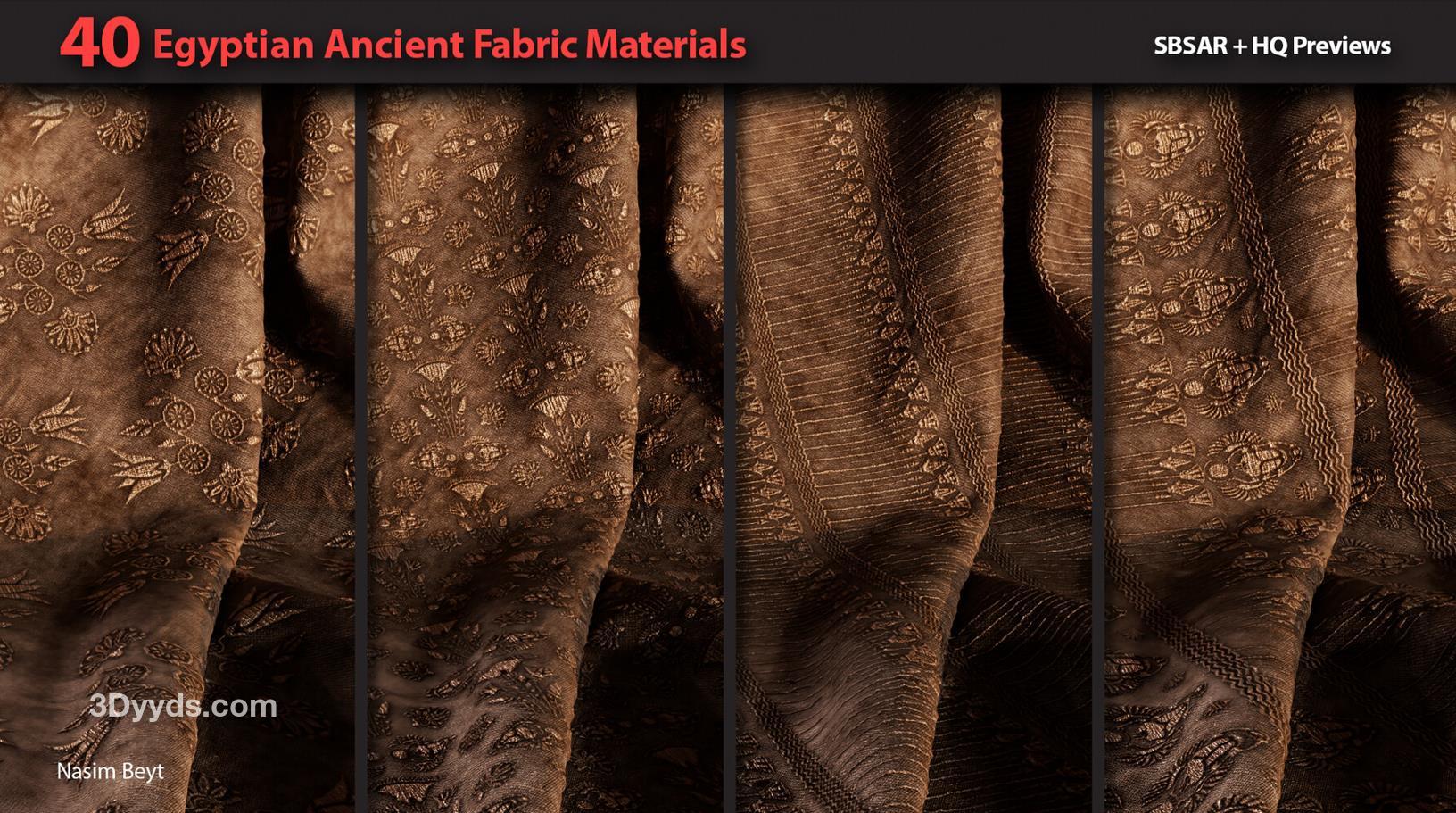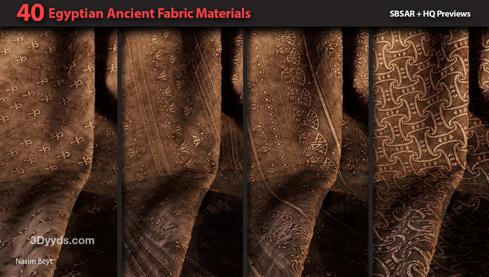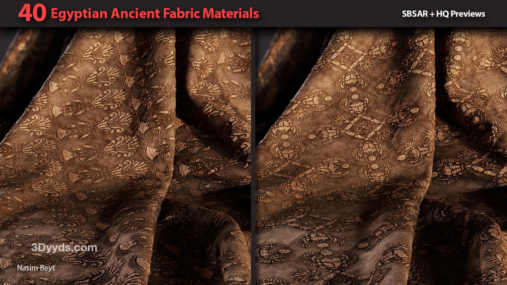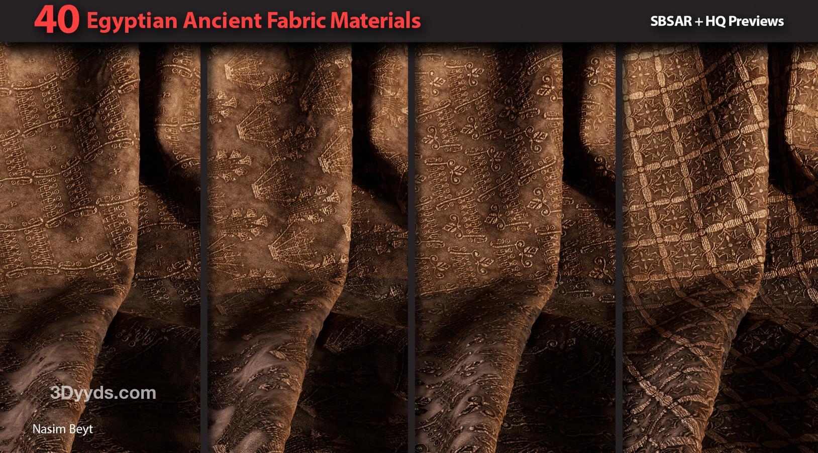 这些信息详细描述了一个包含40种不同埃及风格织物图案的资源包,适用于多种3D制作软件和纹理编辑需求。