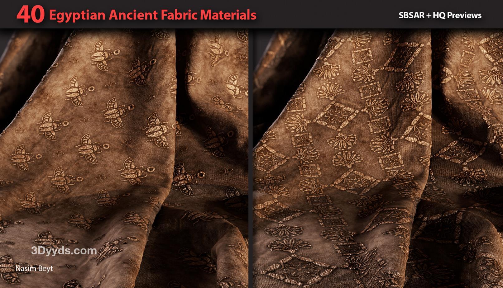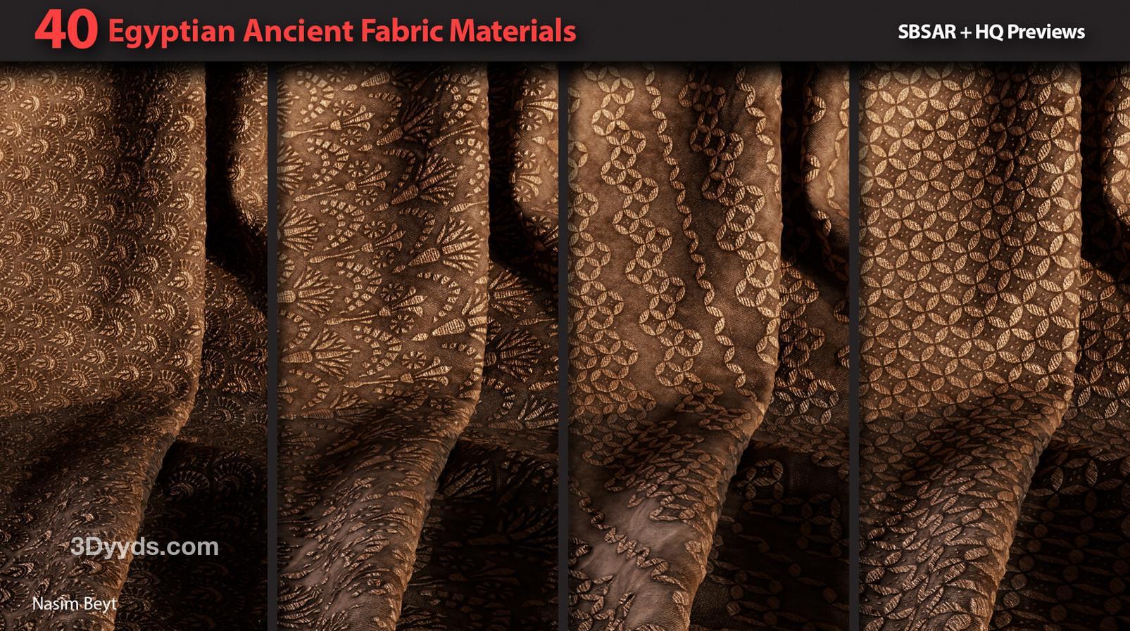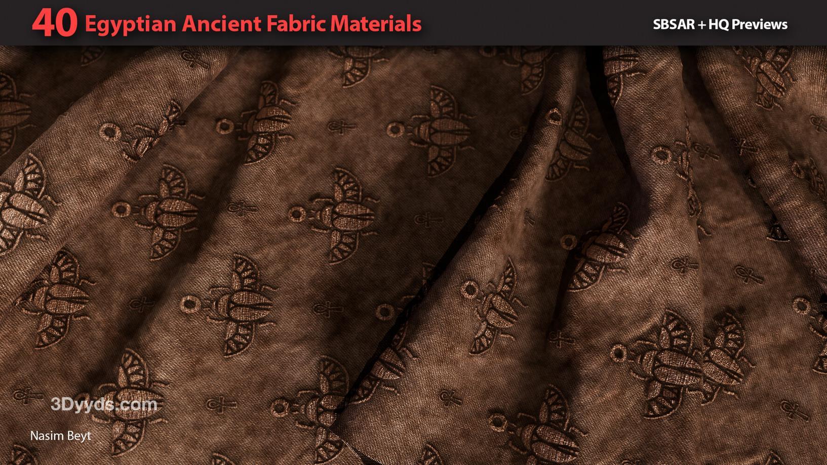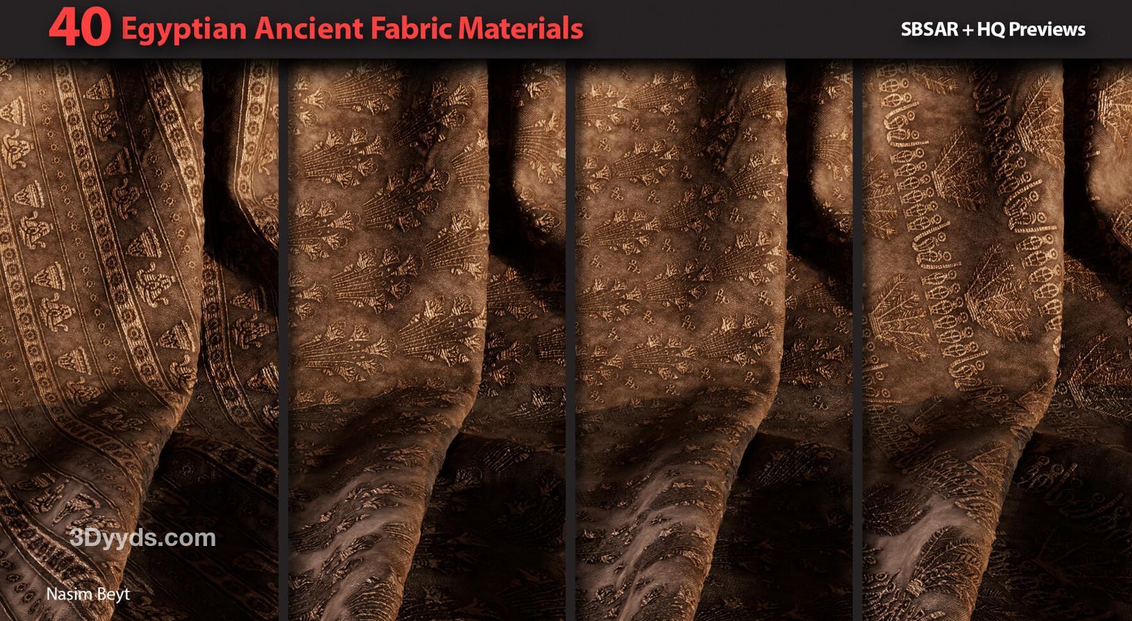 这些信息详细描述了一个包含40种不同埃及风格织物图案的资源包,适用于多种3D制作软件和纹理编辑需求。