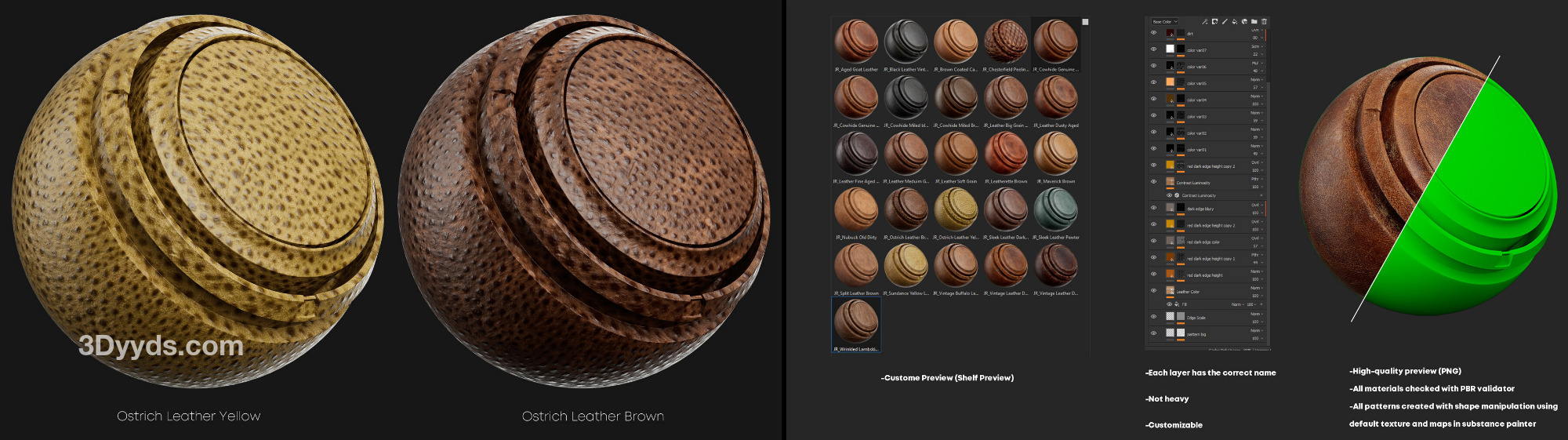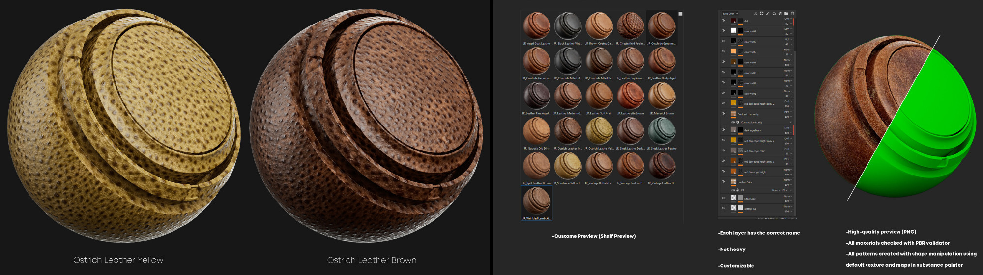 每个图层都有正确的名称 轻量级 可定制 高质量预览(PNG 格式) 100% 使用 Substance Painter 制作 所有材质均经过 PBR 验证器检查 自定义预览(架子预览) 所有图案通过在 Substance Painter 中使用默认纹理和贴图进行形状操作创建