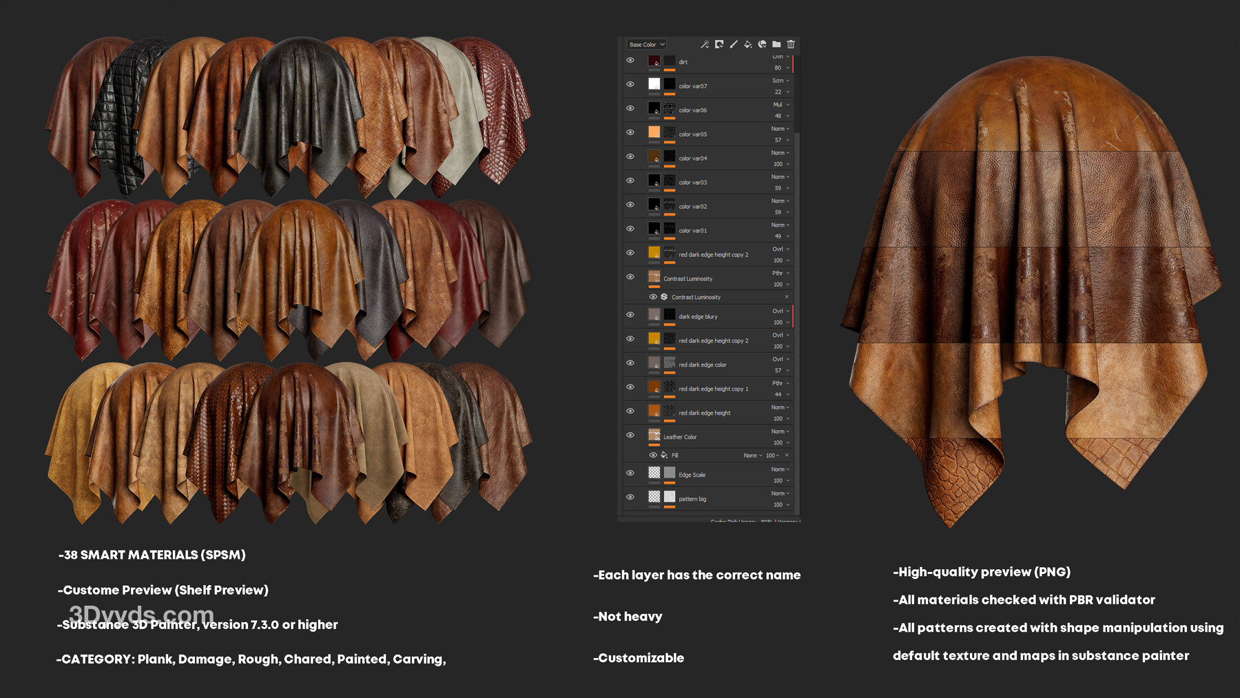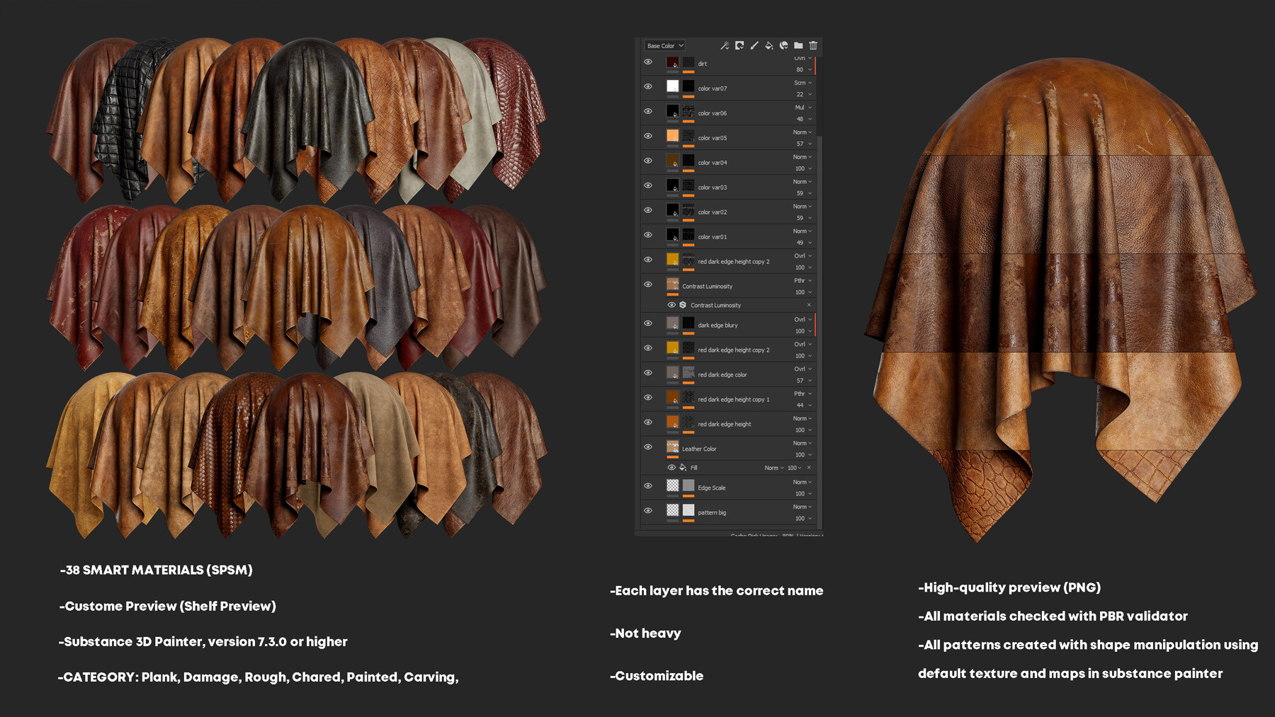 这些智能材质专为Substance Painter设计,让用户能轻松实现逼真效果。无论您是在开发新的游戏项目还是创建数字艺术作品,我们的逼真皮革智能材质都是将您的工作推向新高度的完美工具。