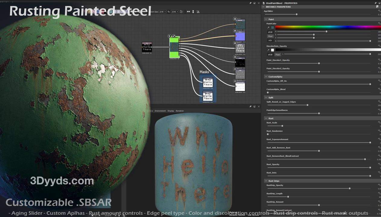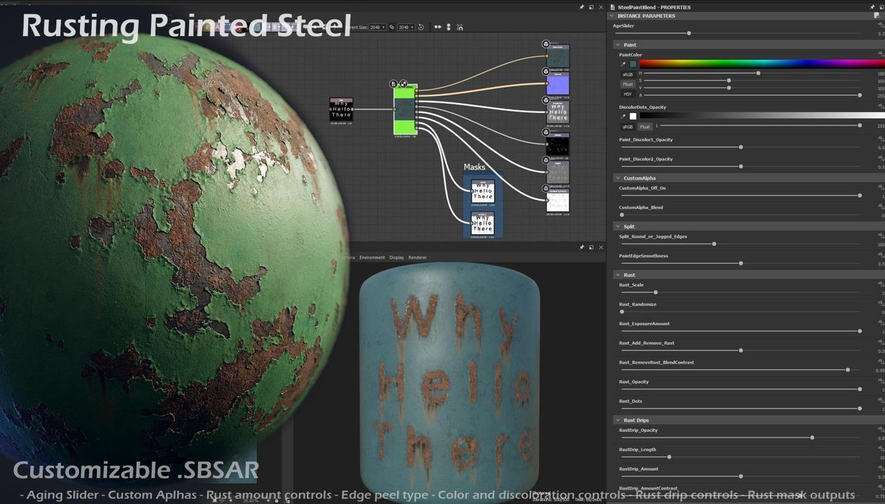这是一个定制化的.SBSAR节点,用于创建各种生锈涂漆金属的变体。首先是涂层起泡,然后出现裂纹和分裂,暴露金属和锈蚀,随着年龄滑块的增加效果逐渐显现。可以查看这个过程的GIF动画:https://www.artstation.com/artwork/nQPBLe