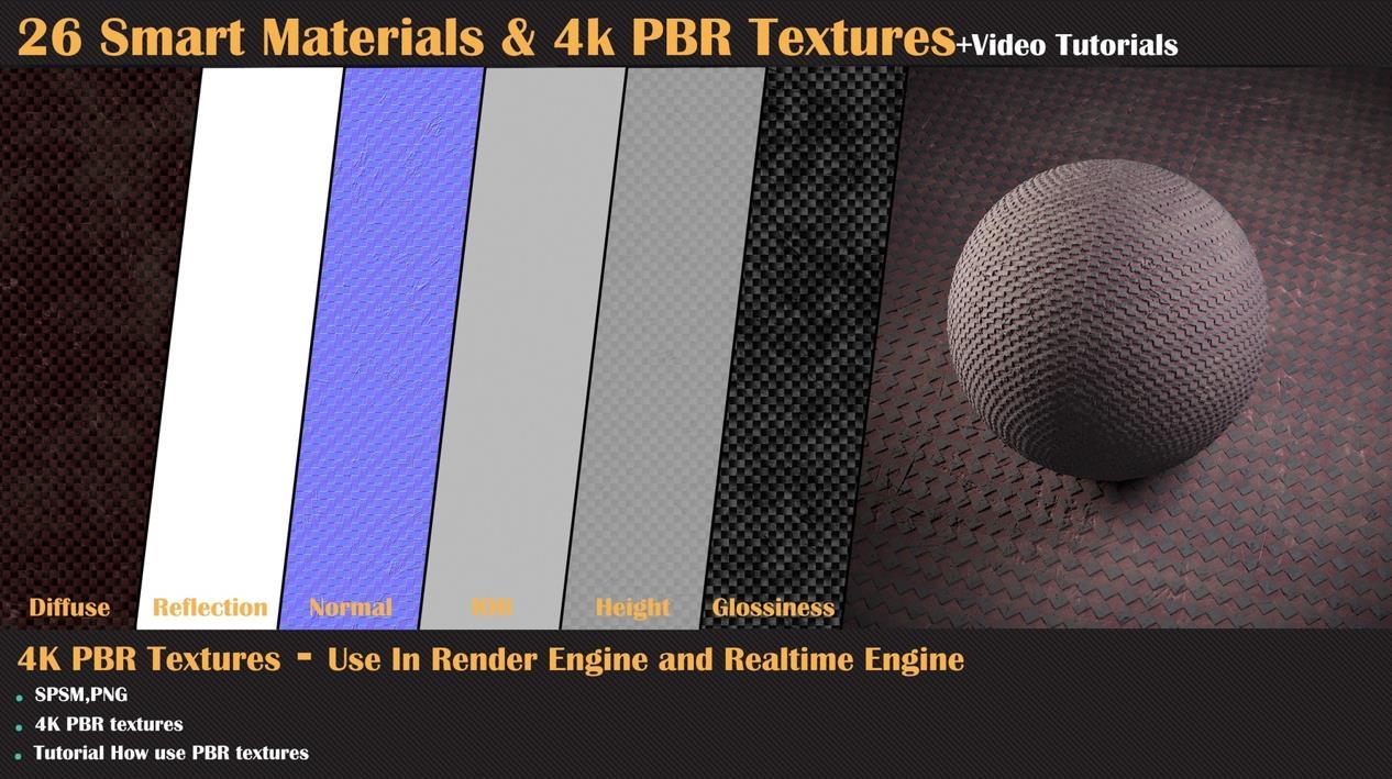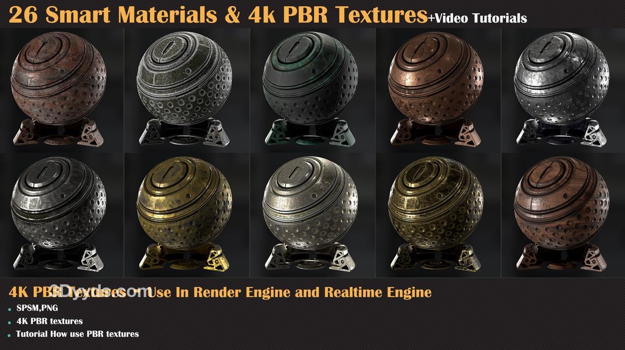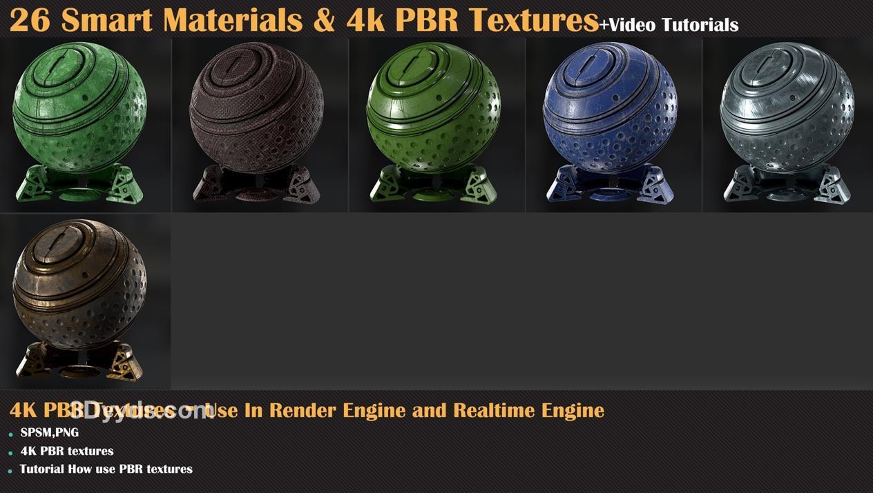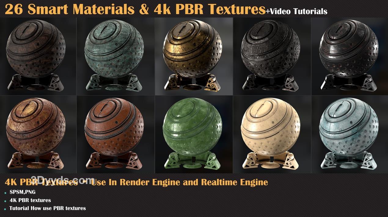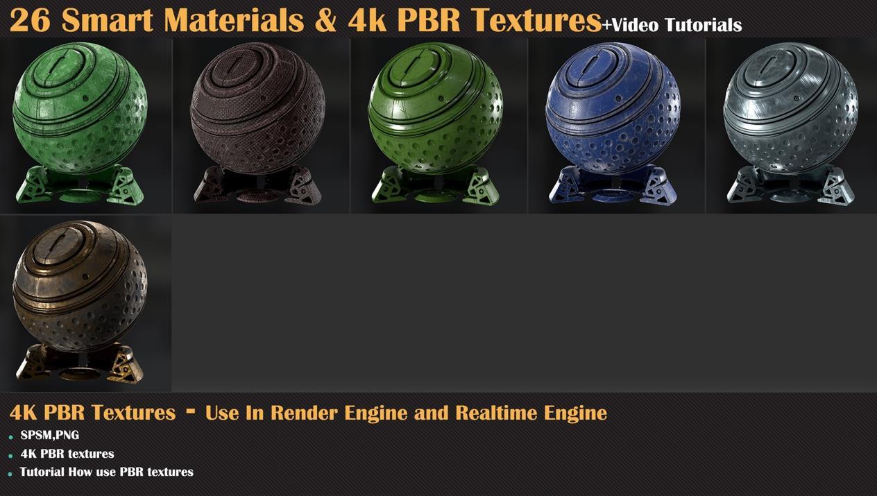 这个产品包含了26种高质量的程序化智能材质,适用于Substance Painter