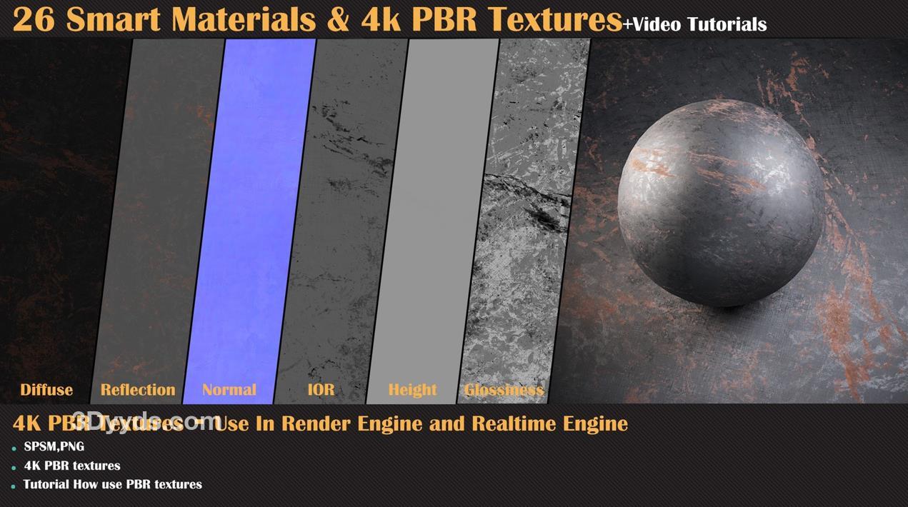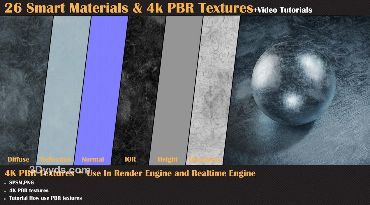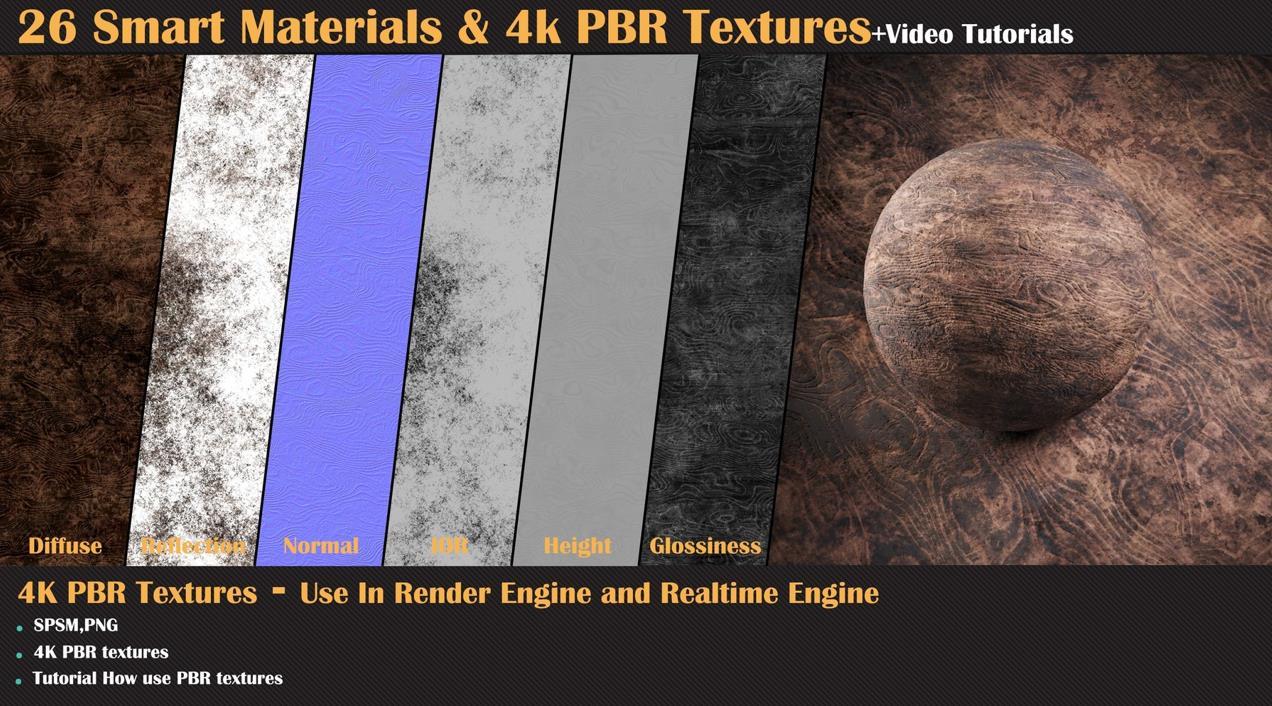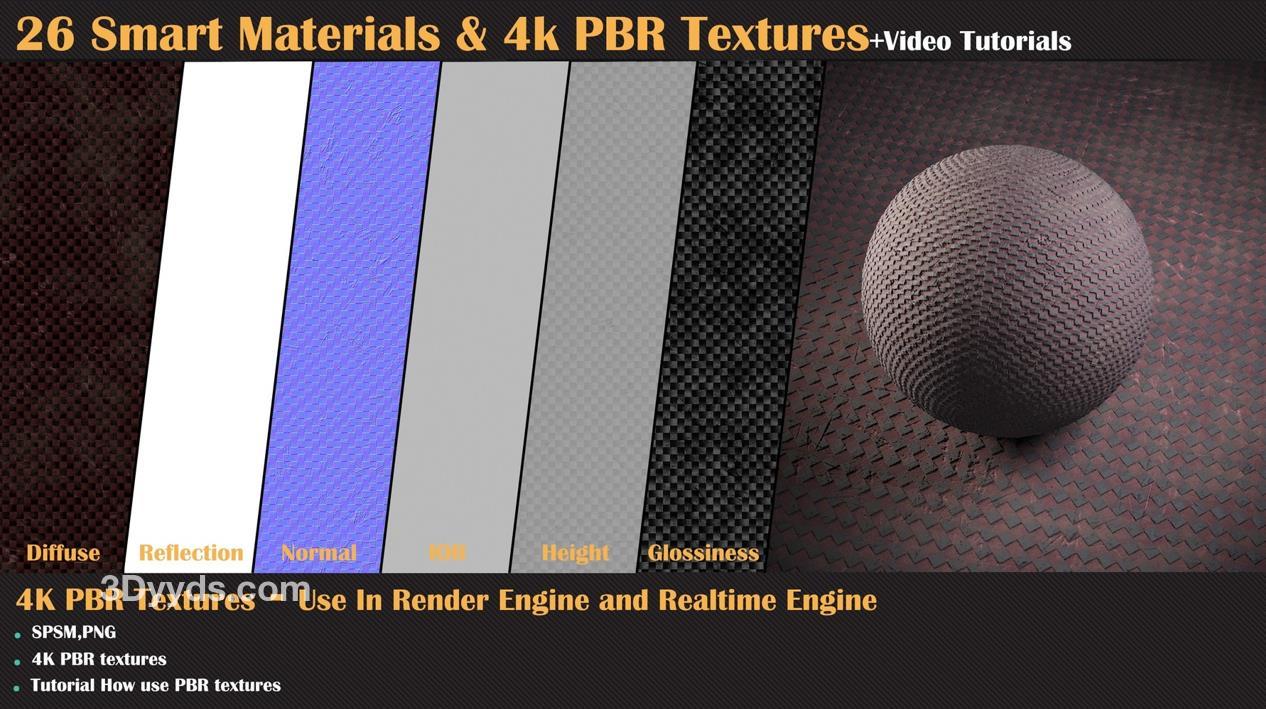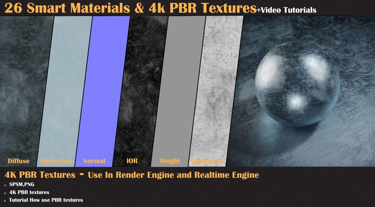 这个产品包含了26种高质量的程序化智能材质,适用于Substance Painter