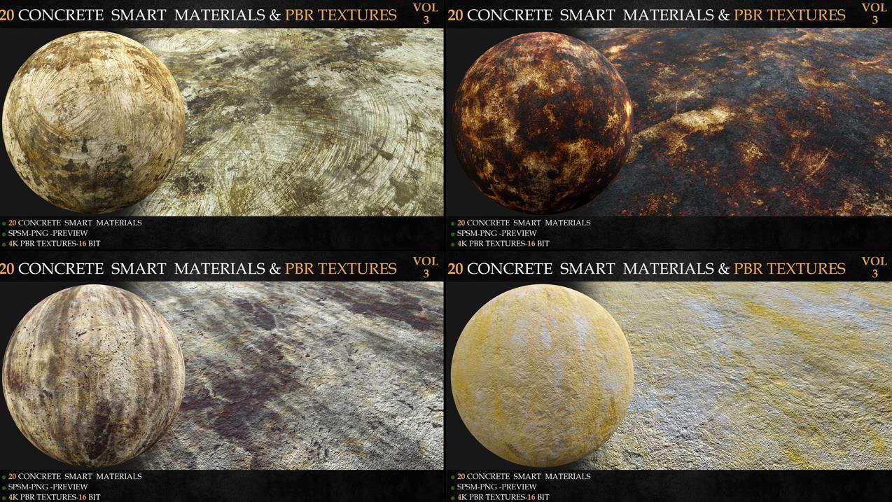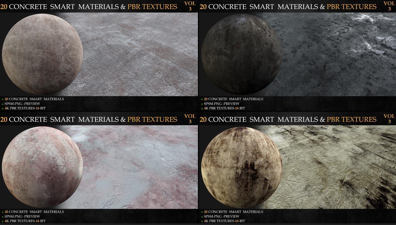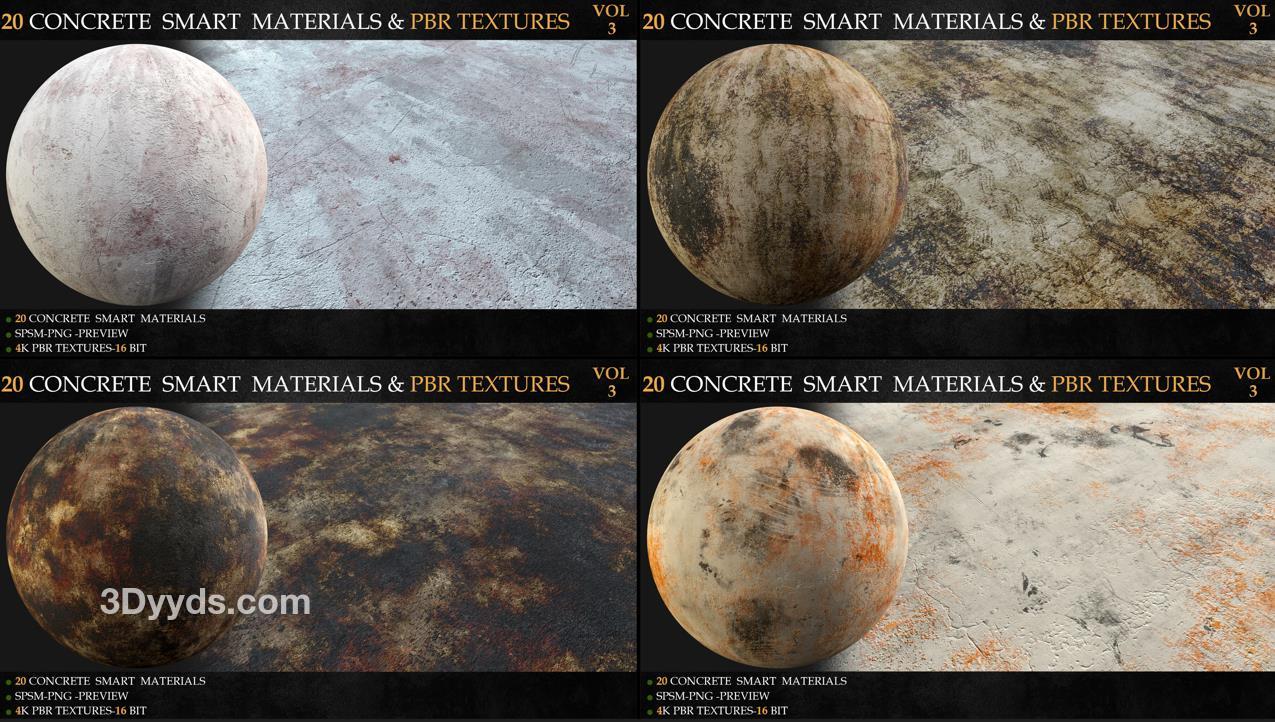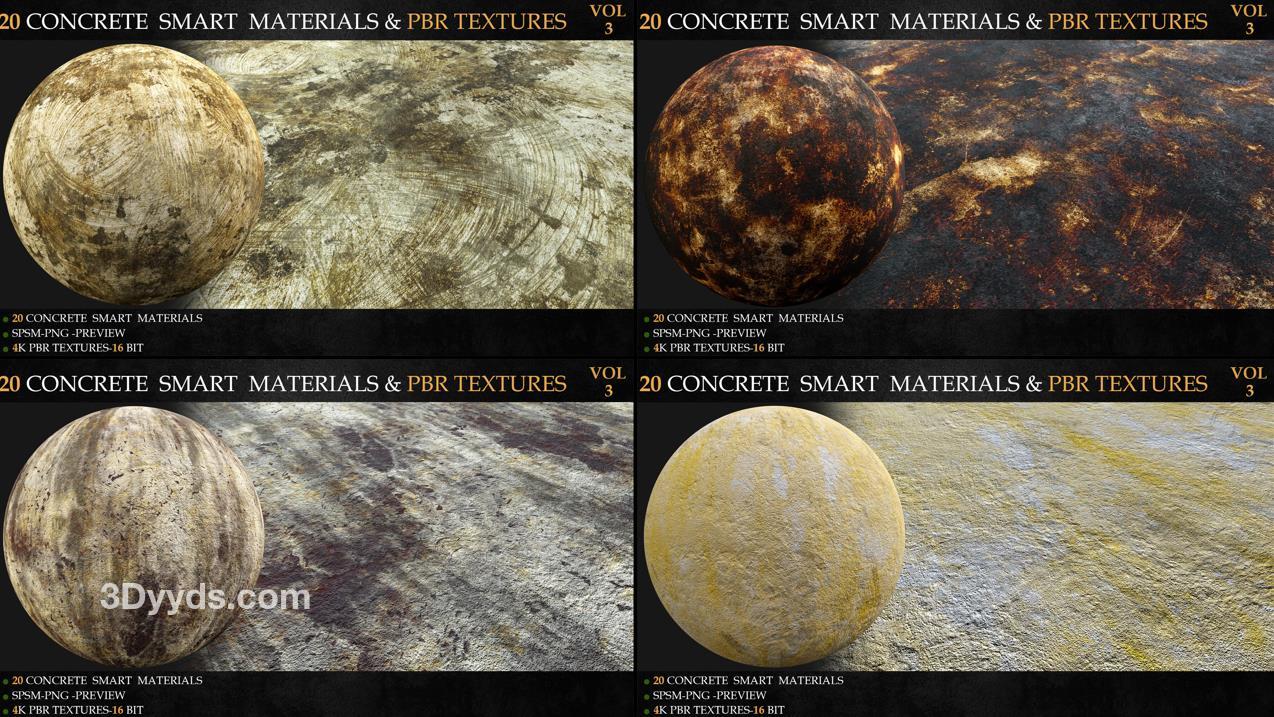 该产品包括 20 种用于物质油漆工的高细节混凝土智能材料