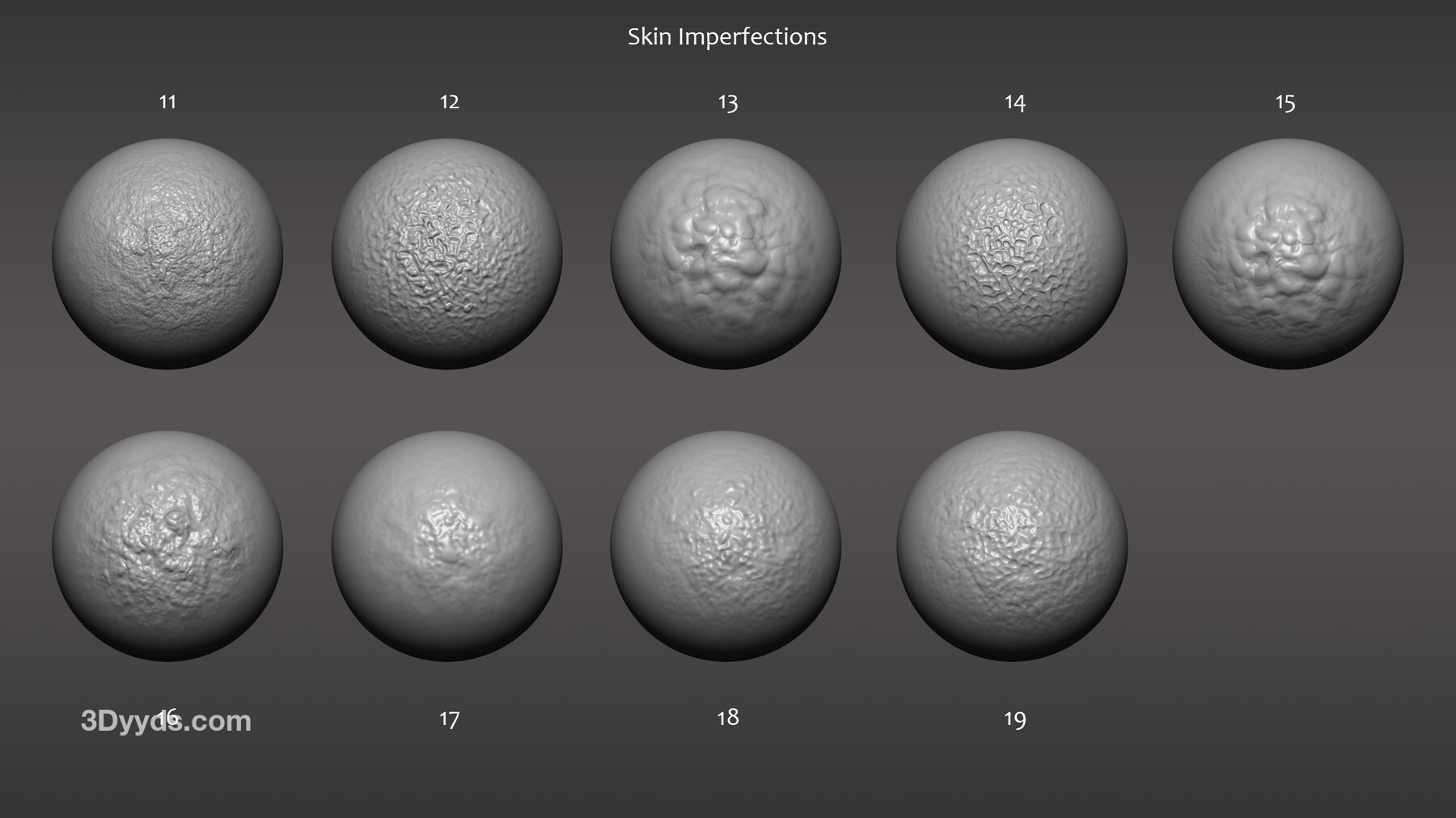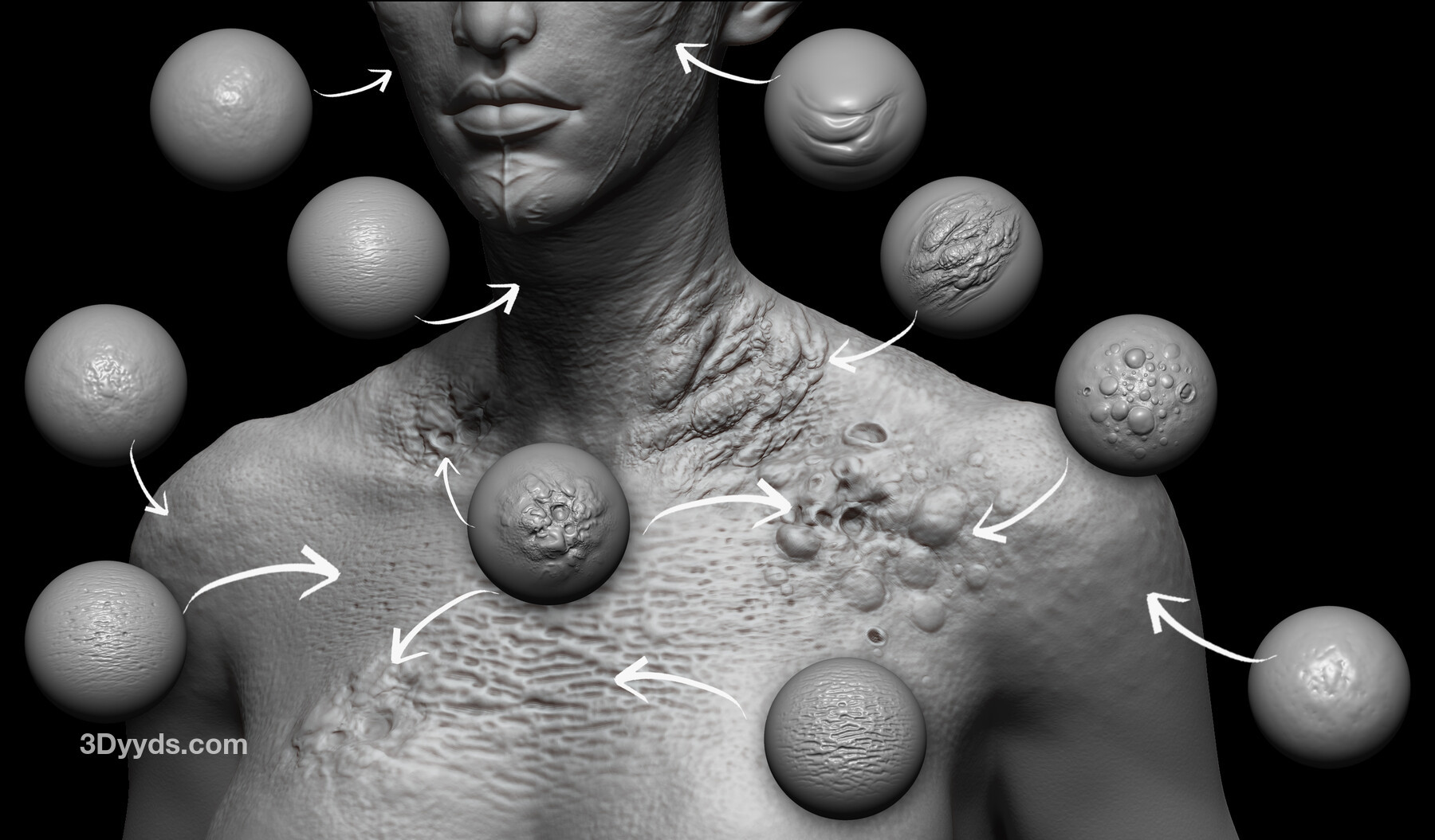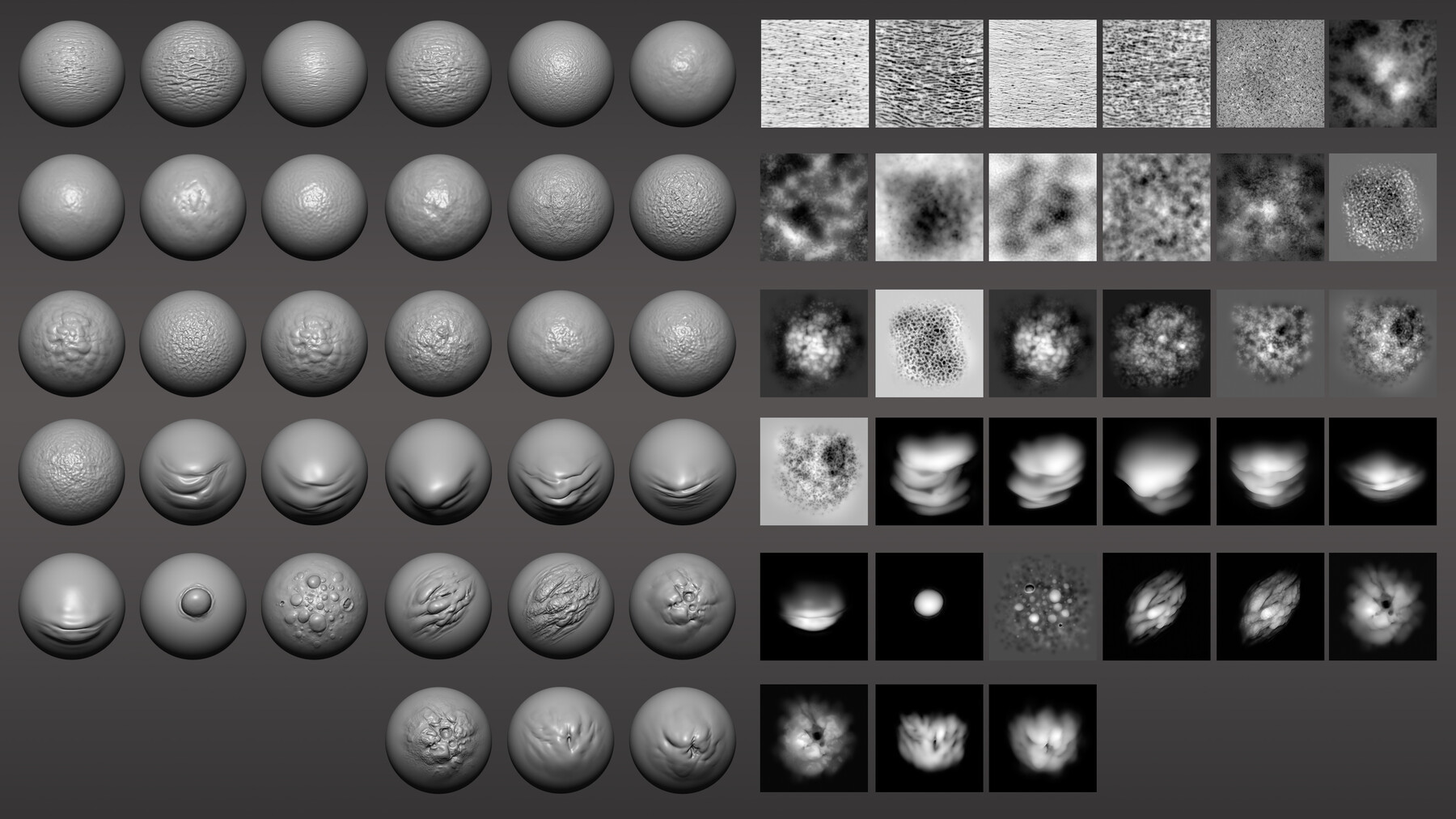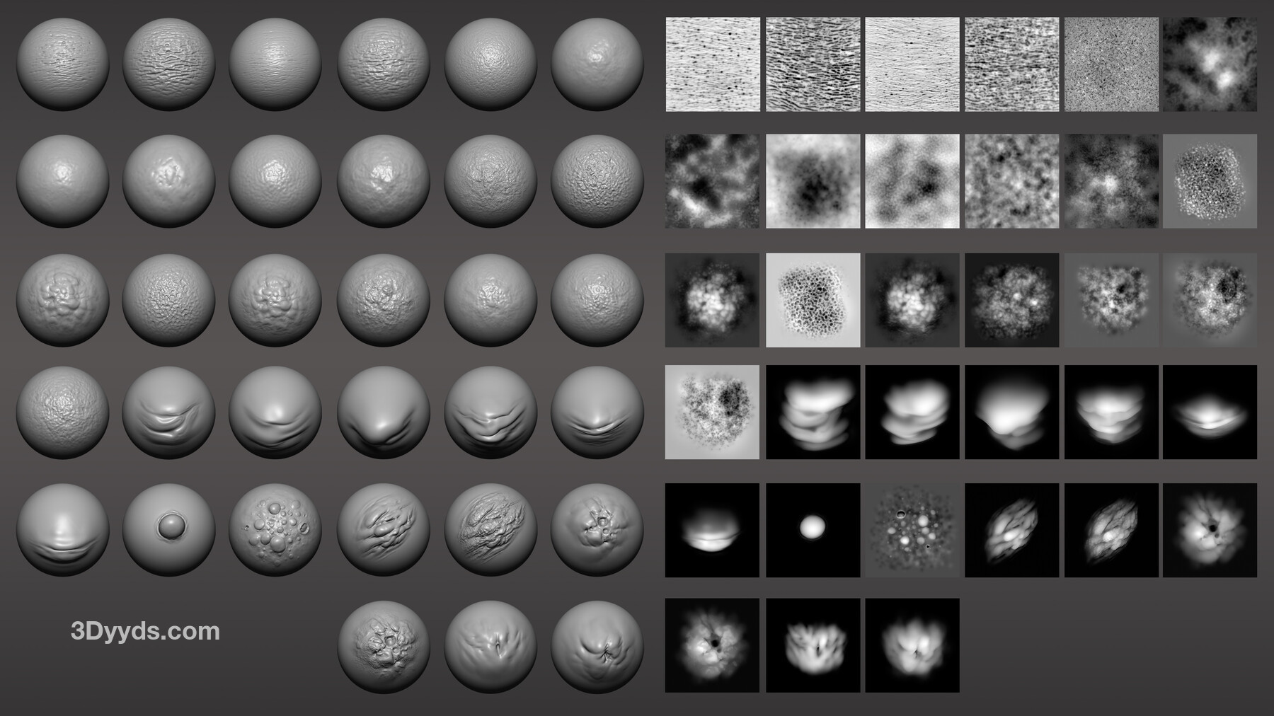 包含33个手工制作的生物皮肤Alpha贴图,用于在ZBrush中为模型创建基础细节,之后可以通过手工进一步精细调整和打磨。