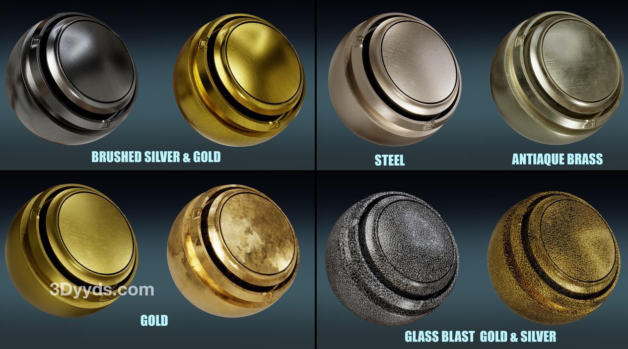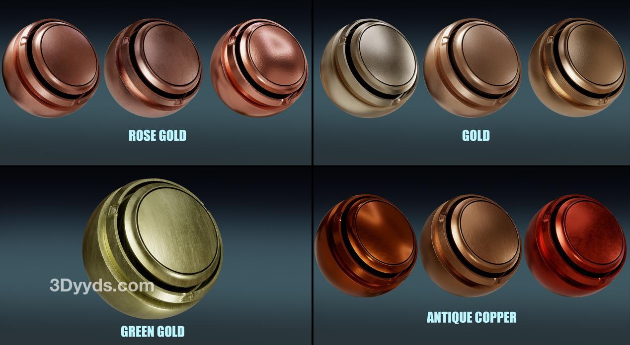 此产品包含26种用于Substance Painter的铜、金、银智能材质和4K PBR纹理,你可以将这些PBR纹理用于任何支持纹理和高度图的程序。