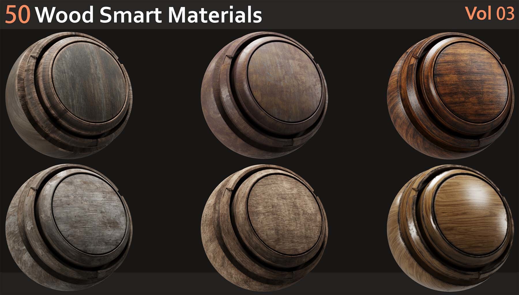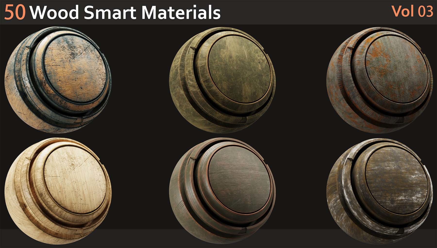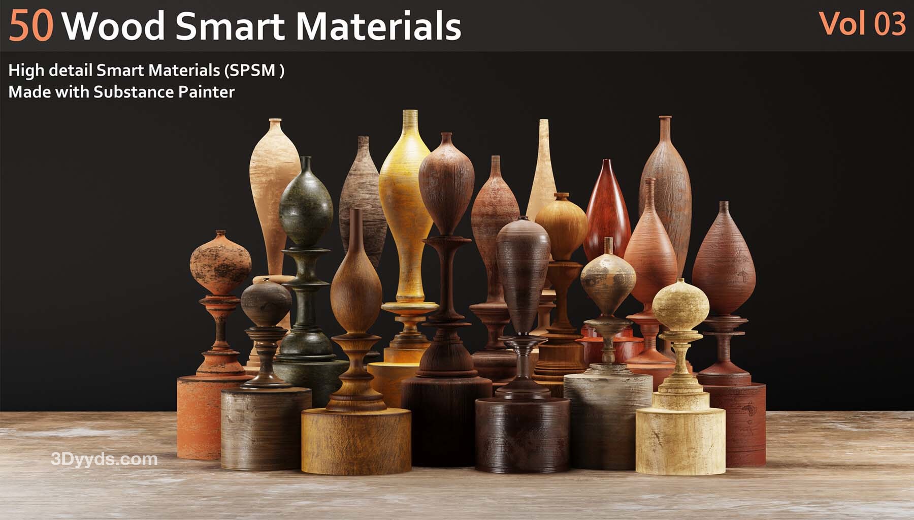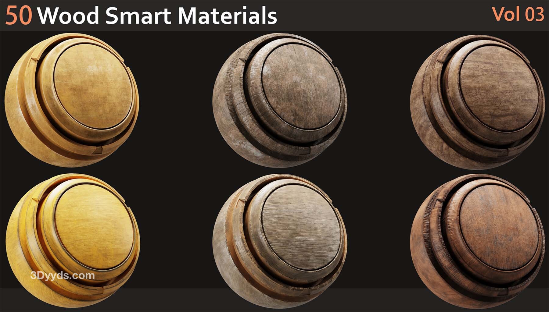 本产品包含50款木材智能材质(Smart Material),适用于Substance Painter。