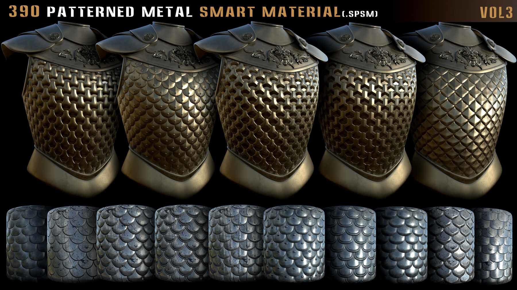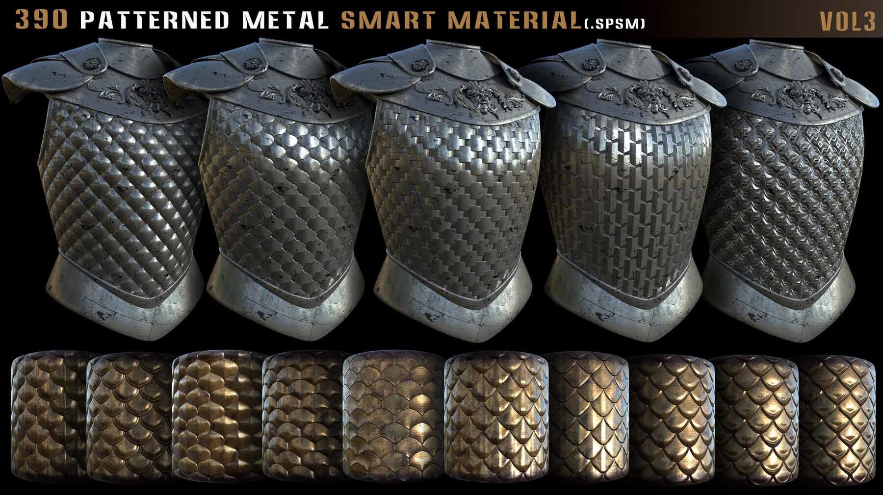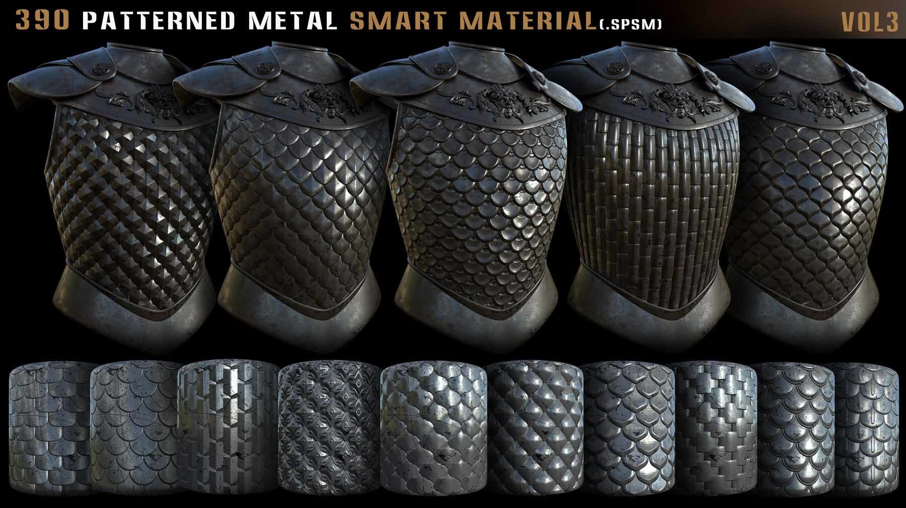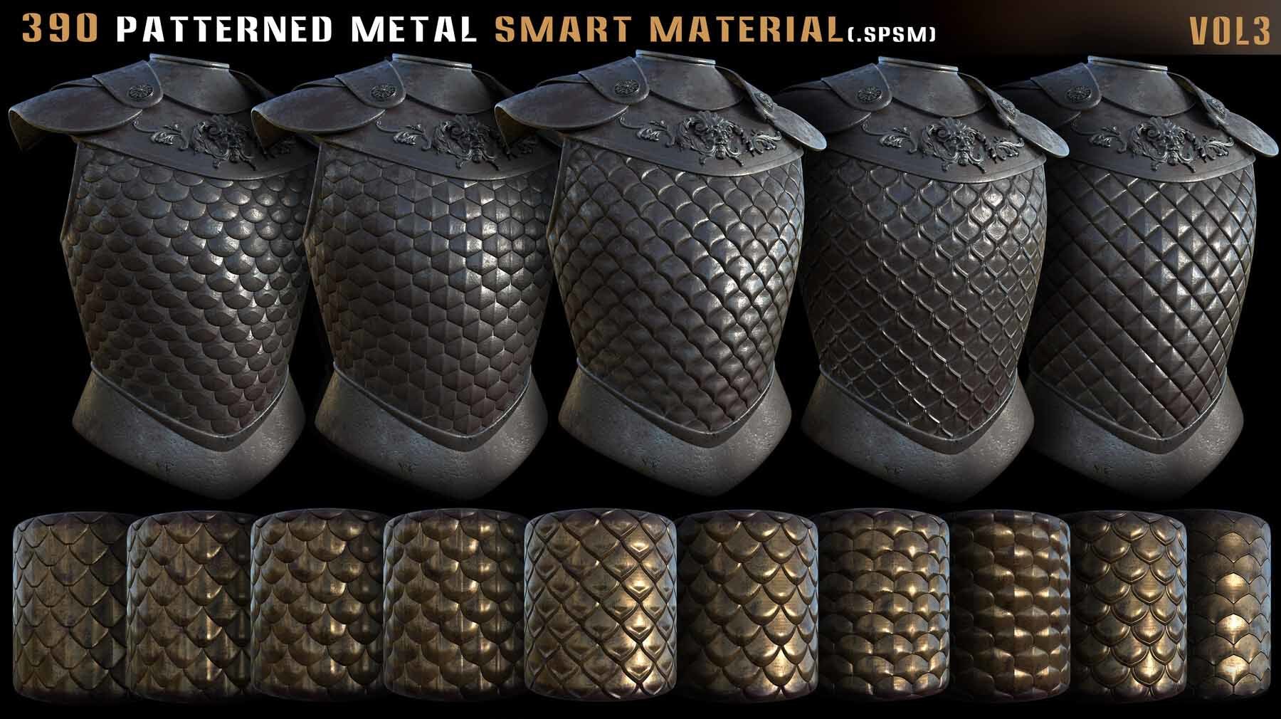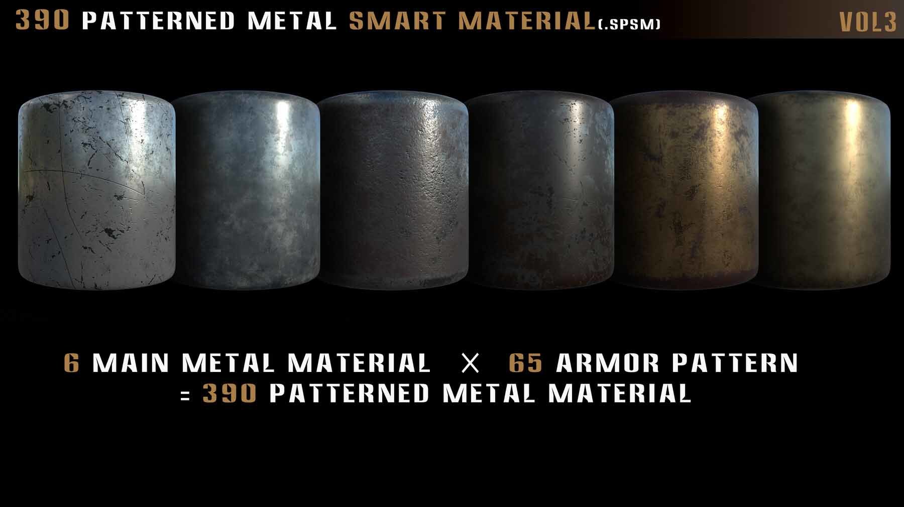 这是一套包含390种高质量和程序化金属智能材质的产品,适用于Substance Painter (.spsm格式)。这个产品包括6种金属基础智能材质,每种有65种不同的图案,总共提供了390种金属智能材质。您还可以在适合您项目的任何金属材料上使用包含65种图案的铠甲图案层。