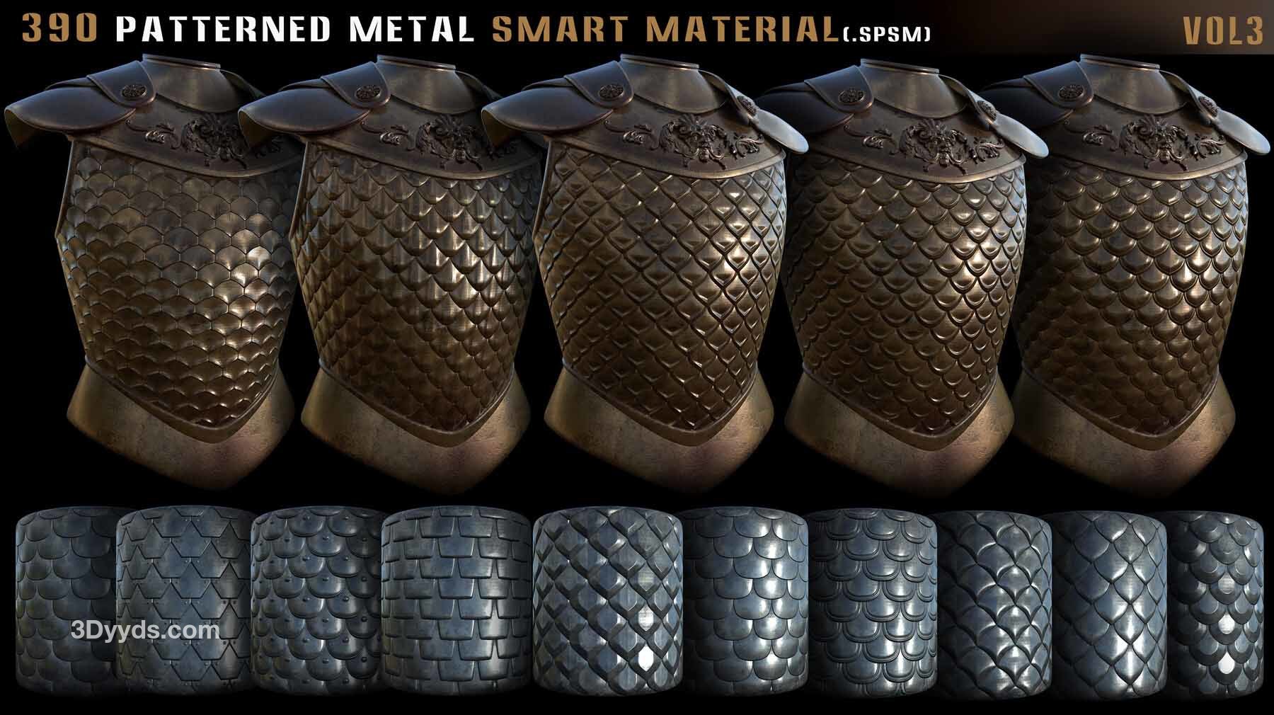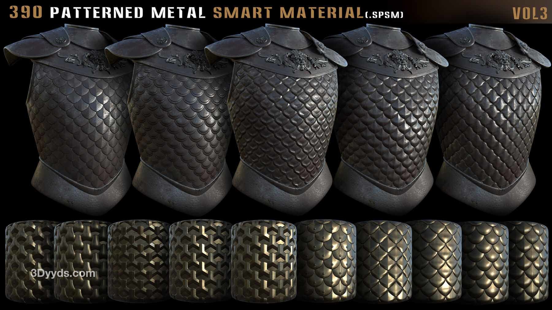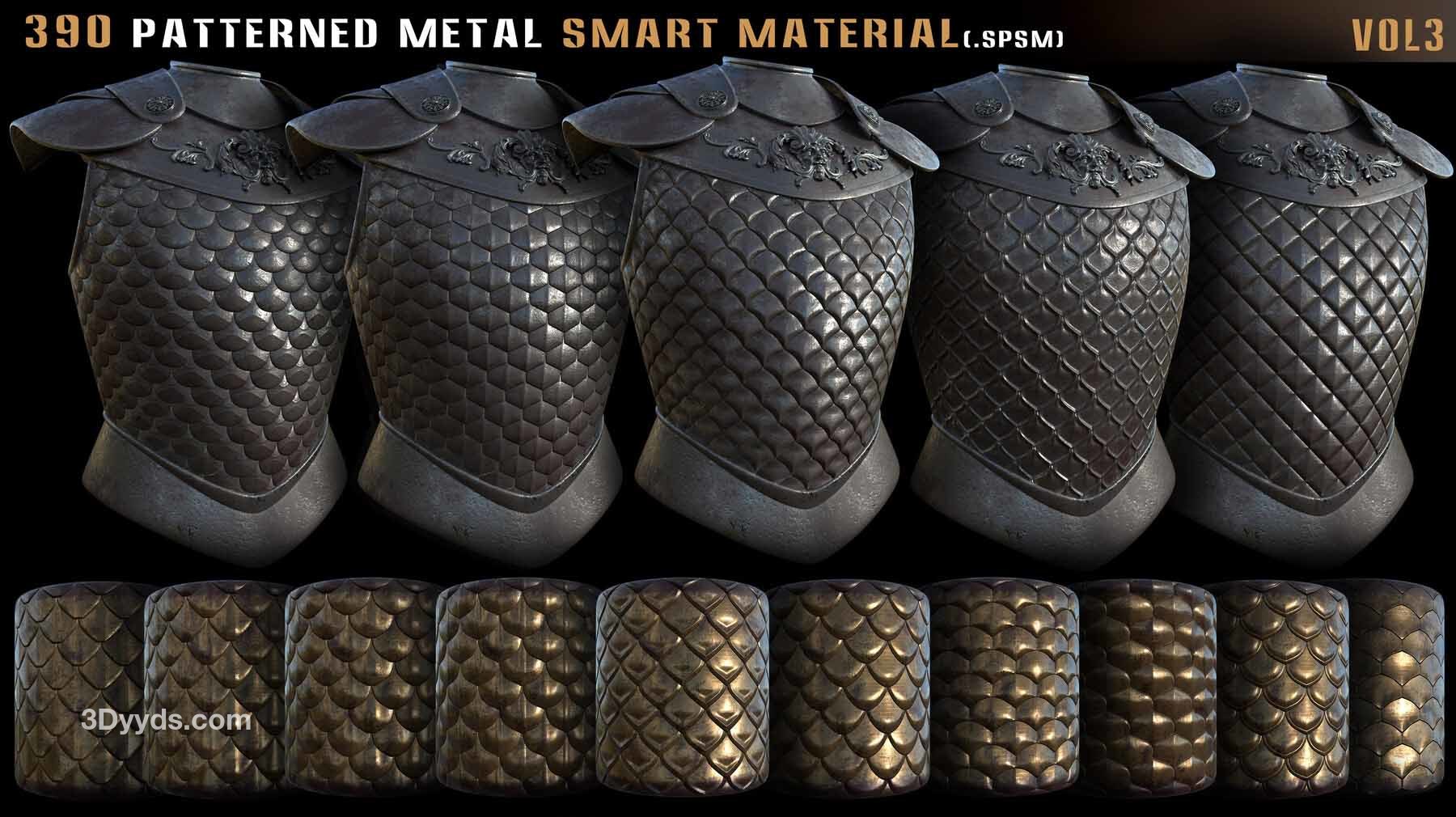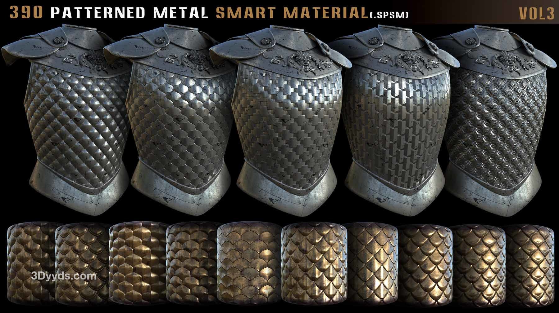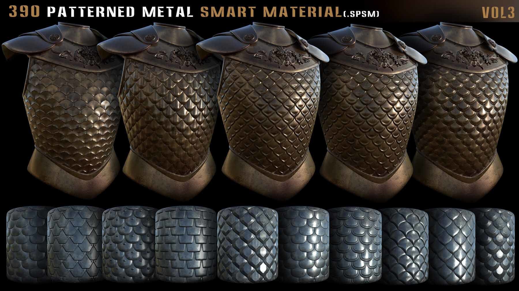 这是一套包含390种高质量和程序化金属智能材质的产品,适用于Substance Painter (.spsm格式)。这个产品包括6种金属基础智能材质,每种有65种不同的图案,总共提供了390种金属智能材质。您还可以在适合您项目的任何金属材料上使用包含65种图案的铠甲图案层。