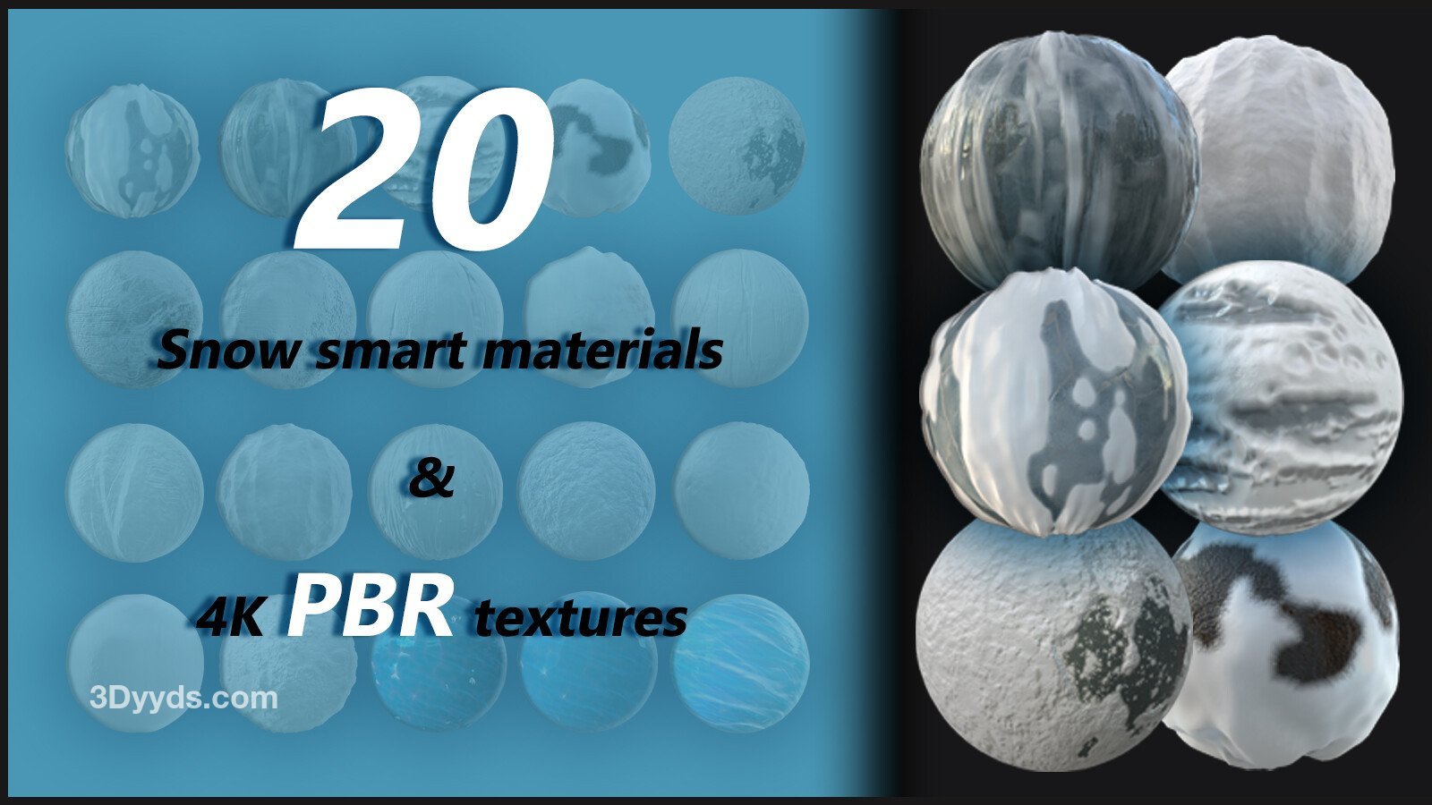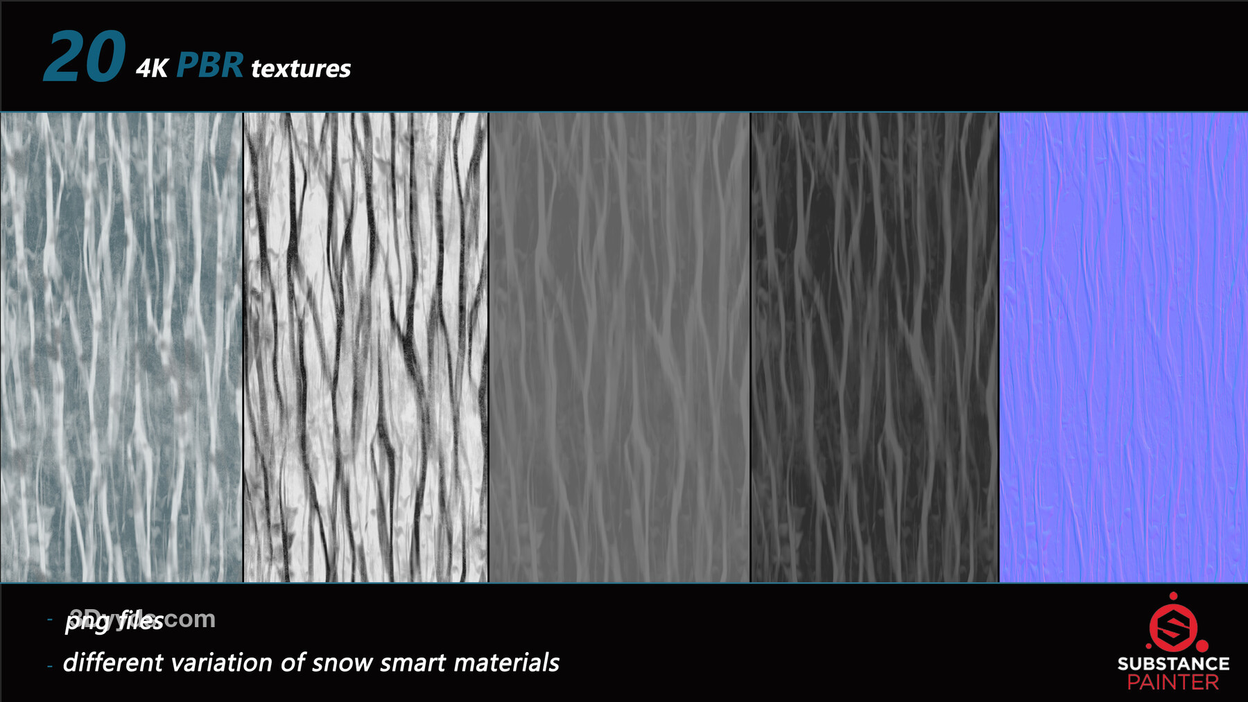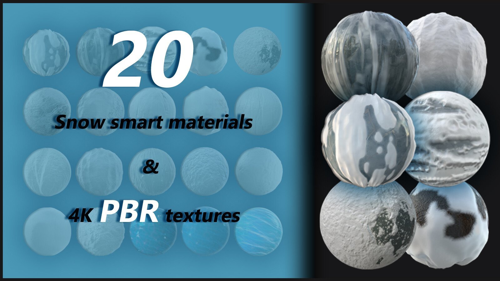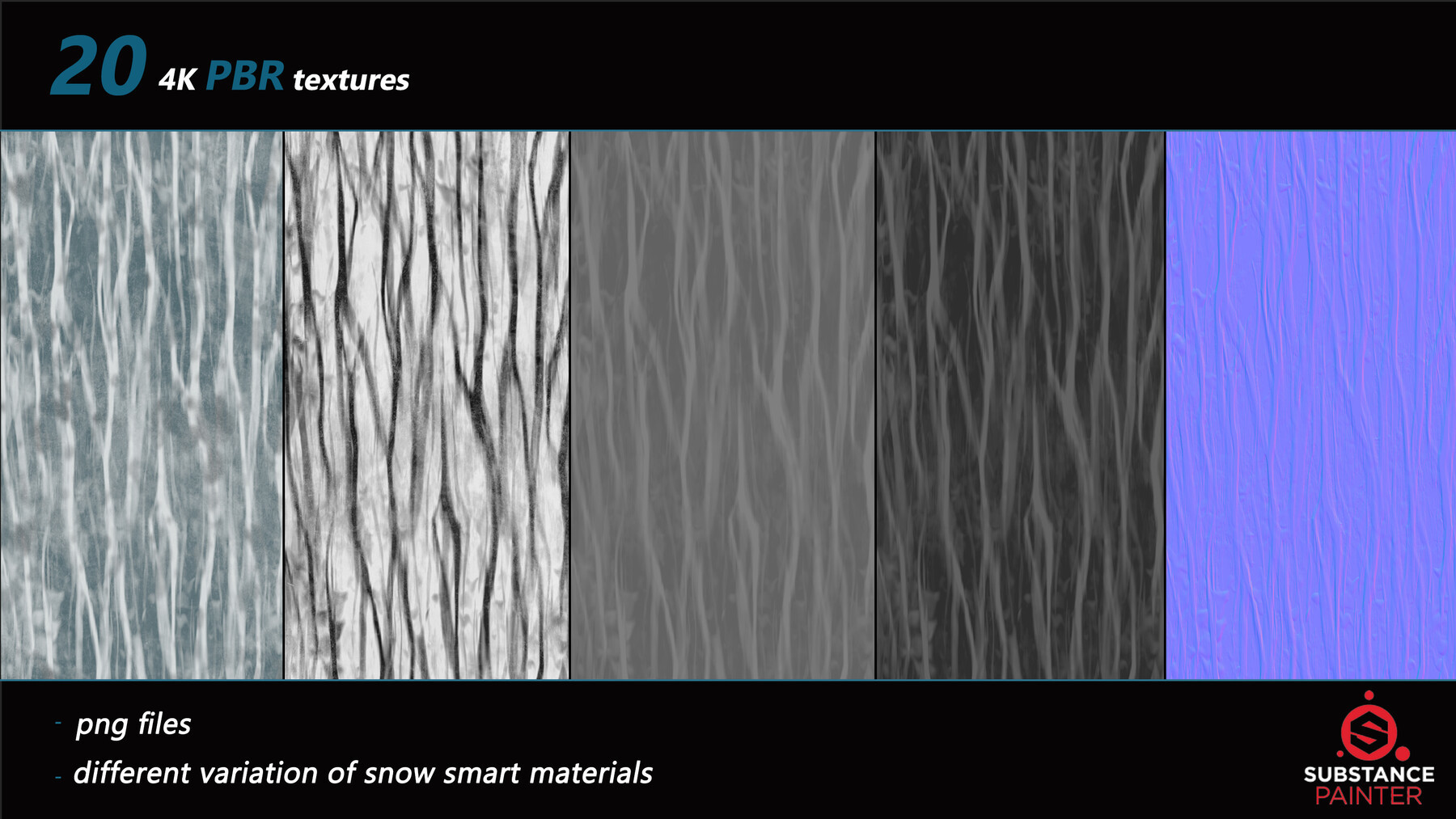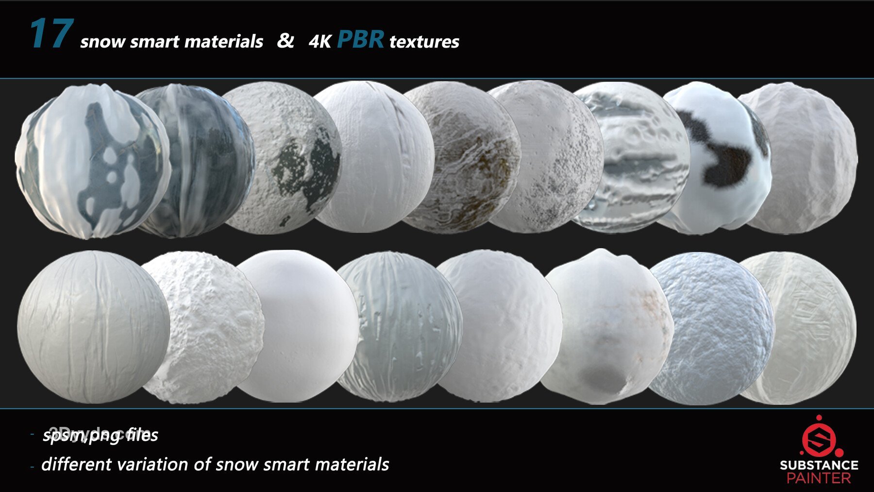 本产品包括 17 种雪智能材质和 3 种幻想冰智能材质,适用于 Substance Painter 和 4k pbr 纹理