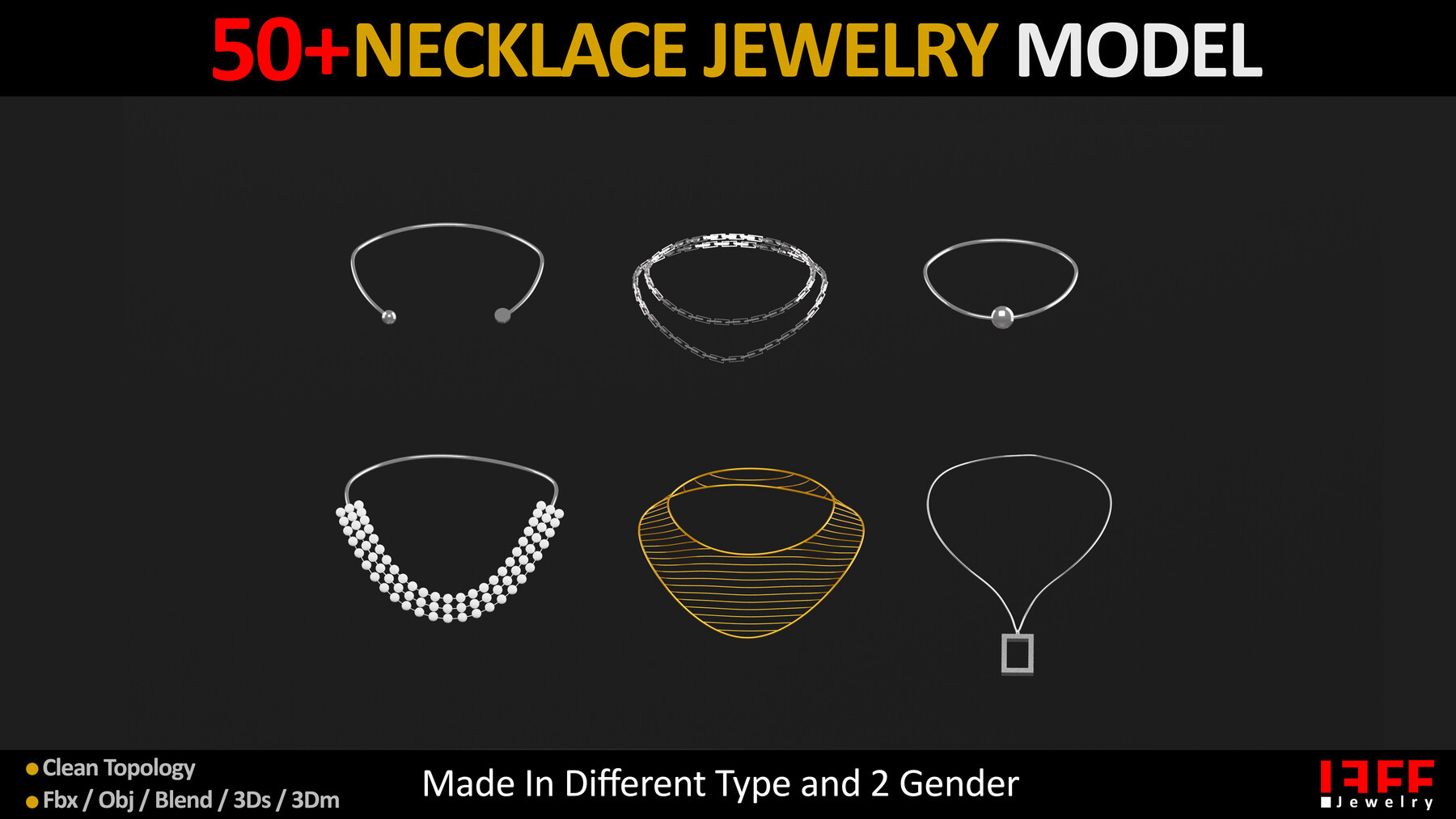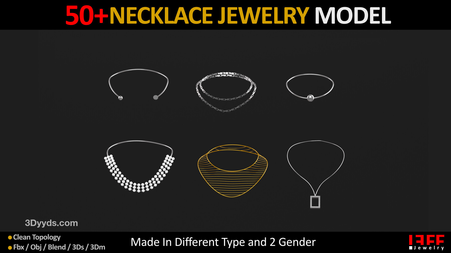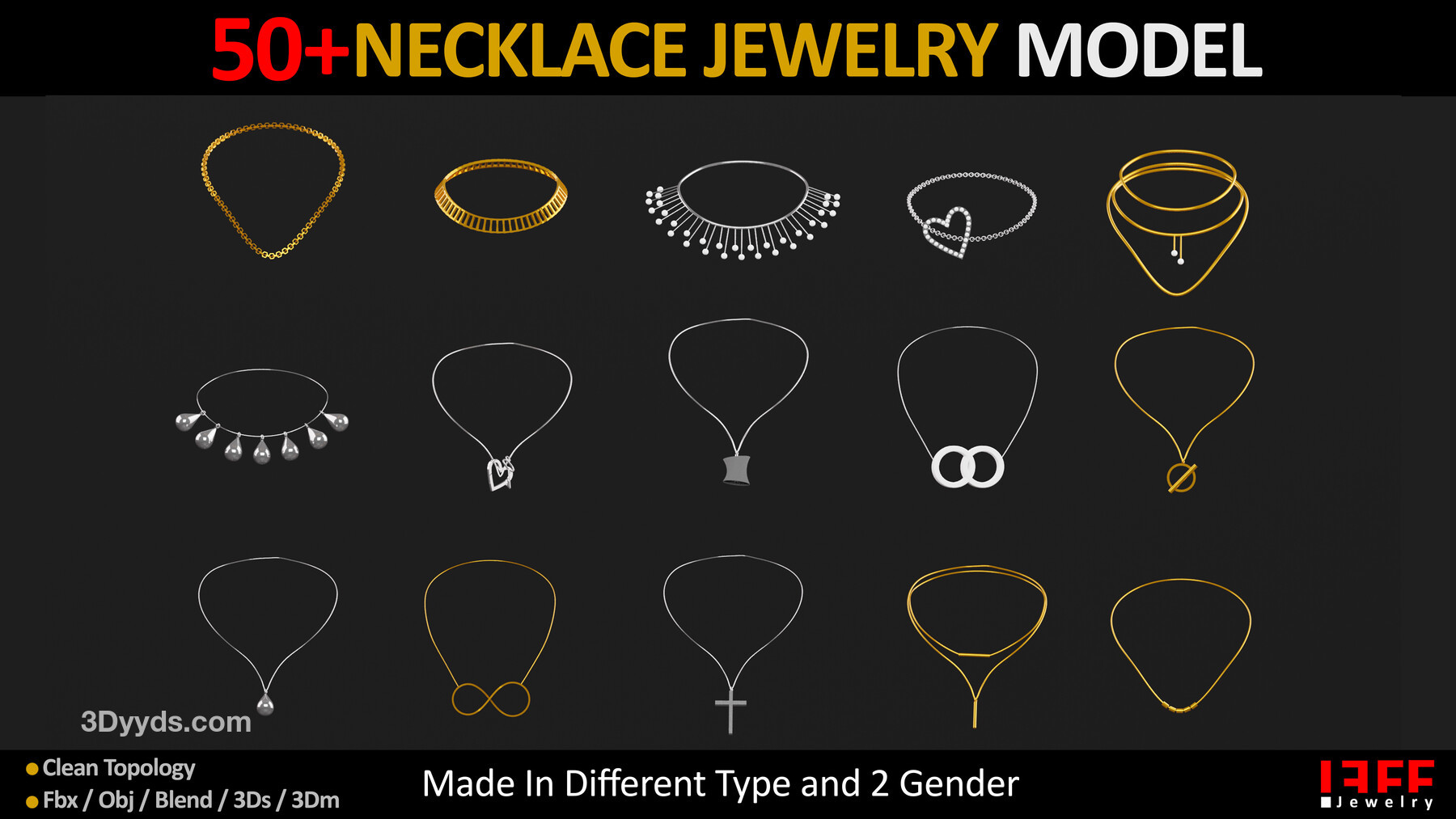 "- 50+个Jeff项链模型,Blend格式" "- 50+个Jeff项链模型,3Ds格式" "- 50+个Jeff项链模型,3Dm格式(Rhinoceros)" "- 50+个Jeff项链模型,Obj格式" "- 50+个Jeff项链模型,Fbx格式"