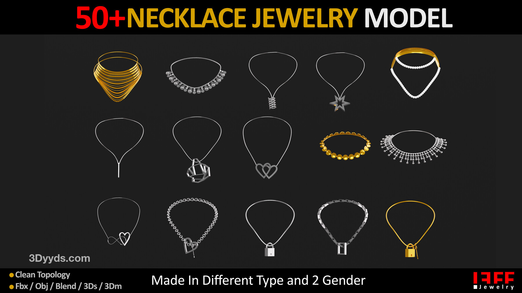 "此外,还包含以下不同类型的50+个Jeff项链模型:经典款、婚礼款、现代款、幻想款、复古款、时尚款、未来主义款、简约款、珠宝款、金色款、银色款、钻石款、订婚款。"