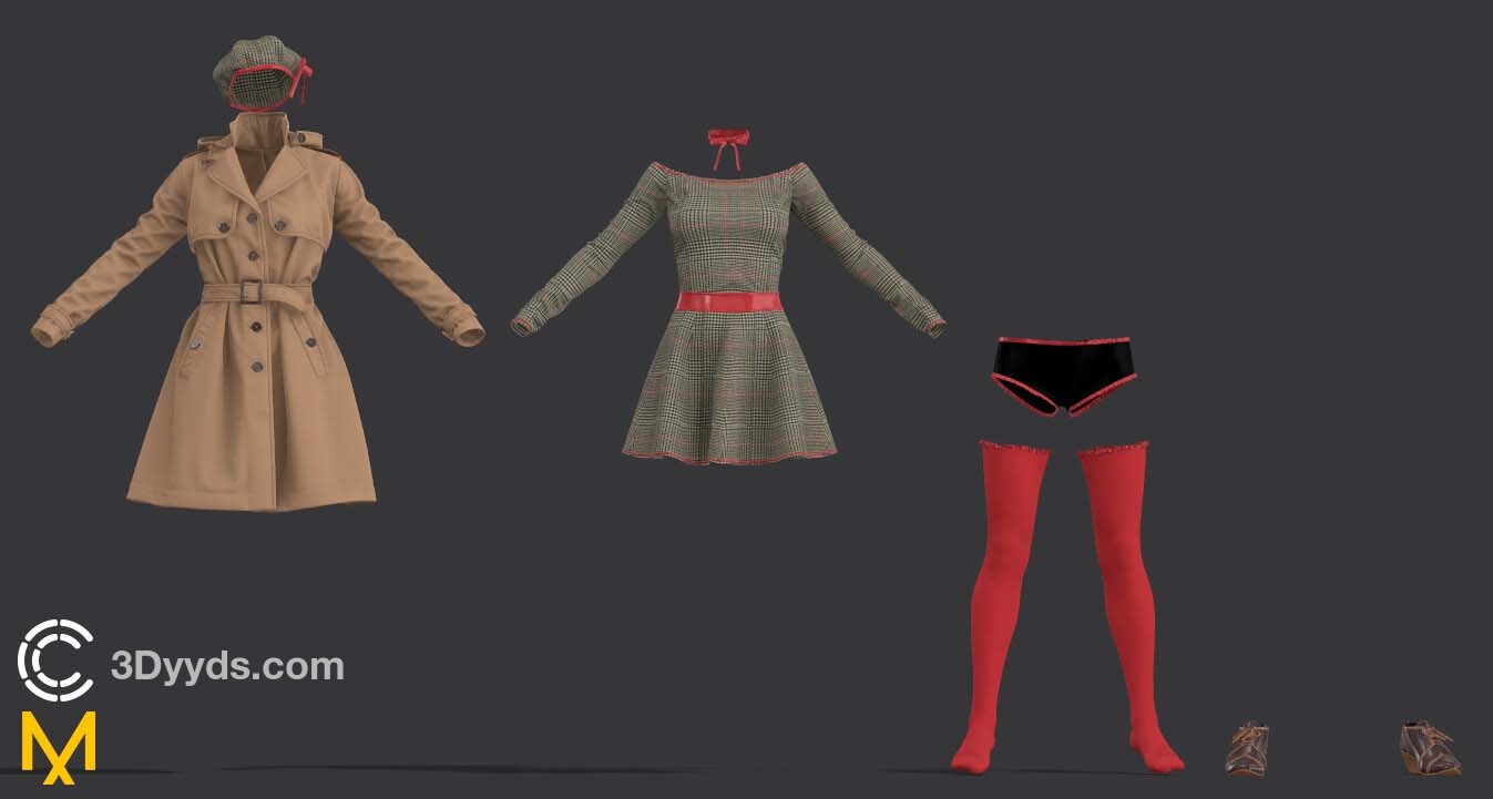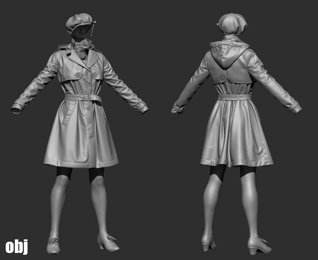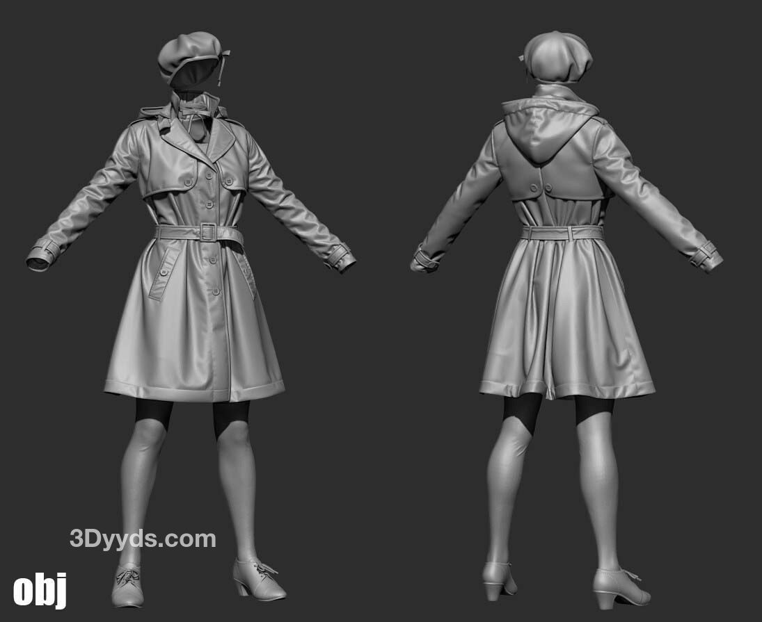 MD27女式中长款风衣英式风衣服饰3d模型&英伦士兵卡其色风衣