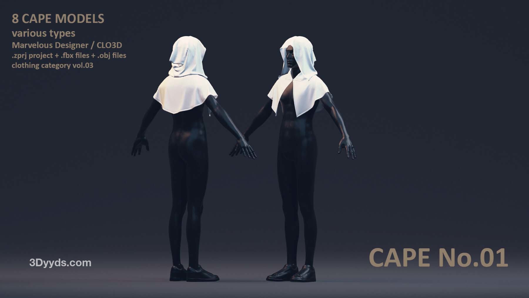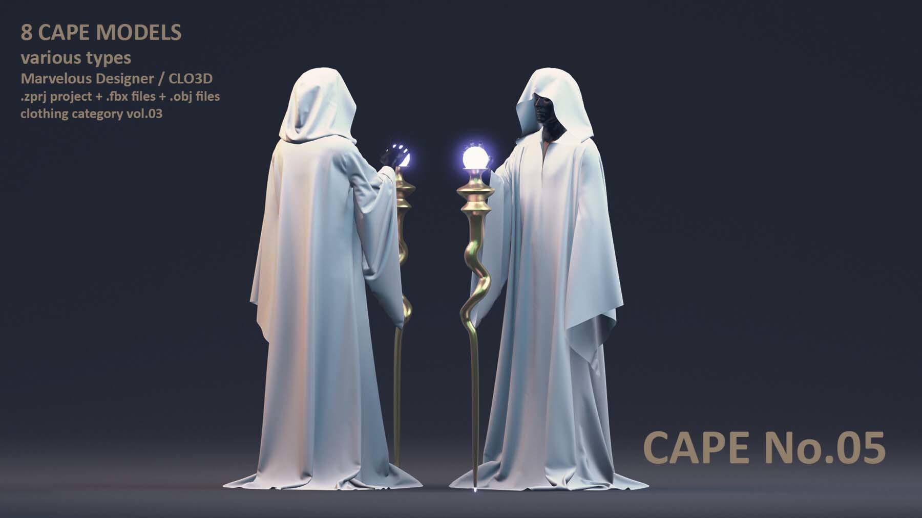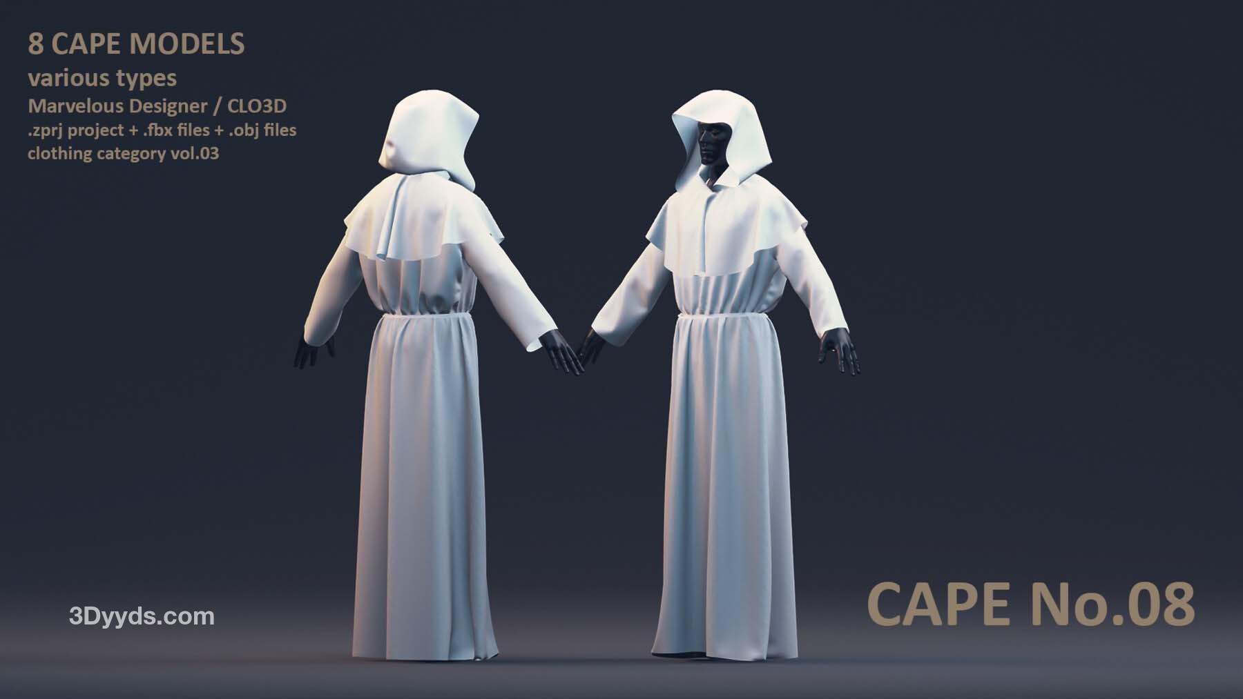 每位艺术家都需要一个合适的模型库,以加速创作艺术作品的过程。这个套装包括了男性和女性风格各异的8 件披风模型。这些模型具有清晰的四边形网格和 UV 映射。这些披风可以轻松地用来加快角色服装的制作过程。