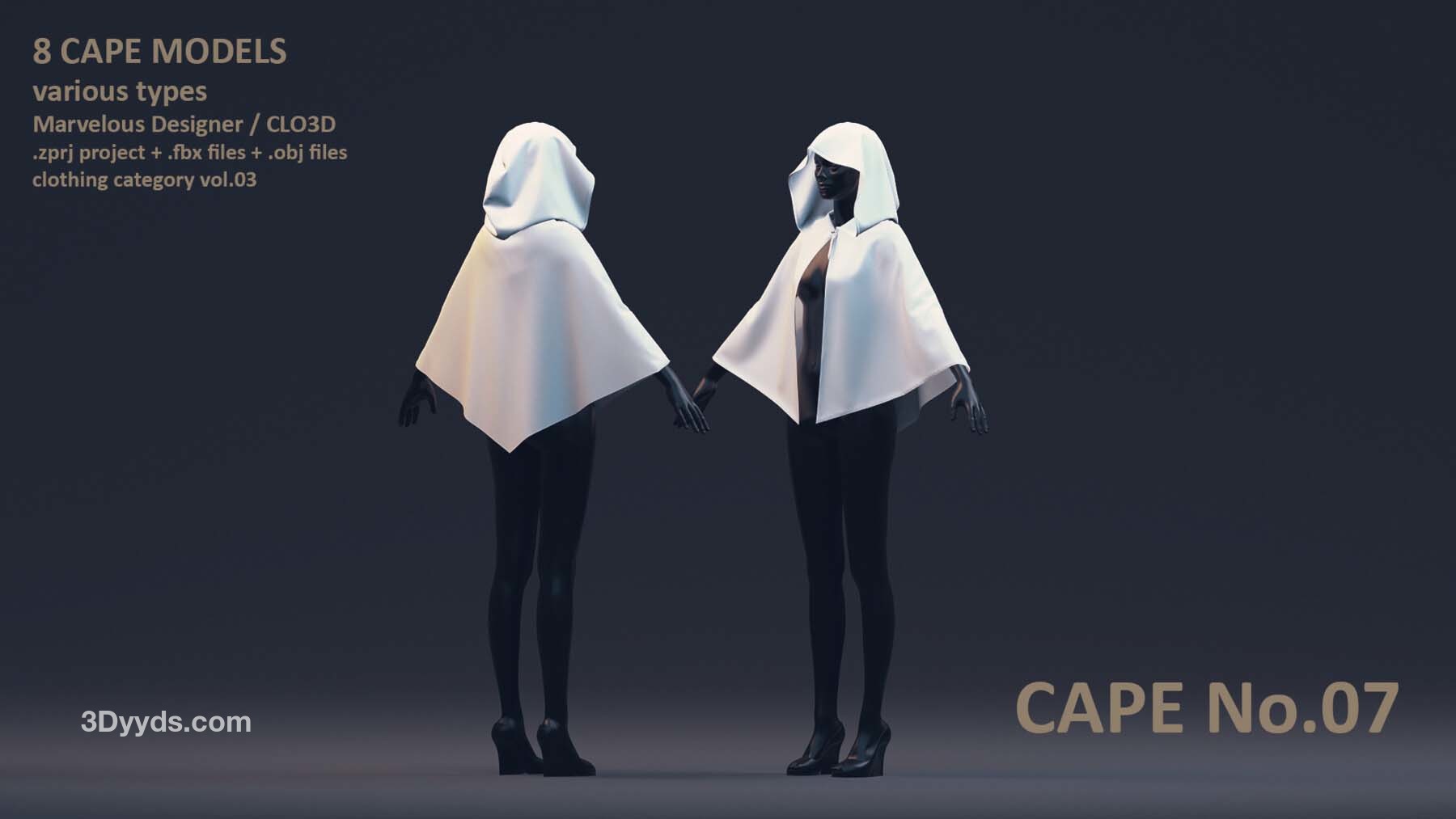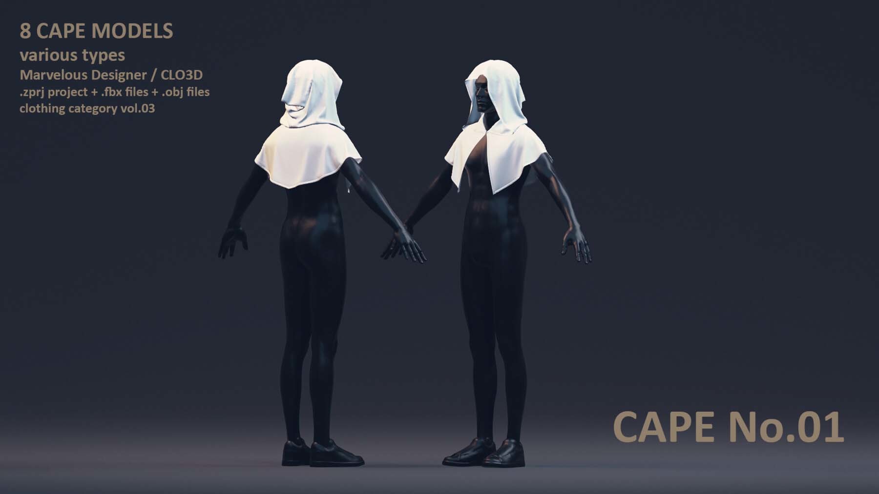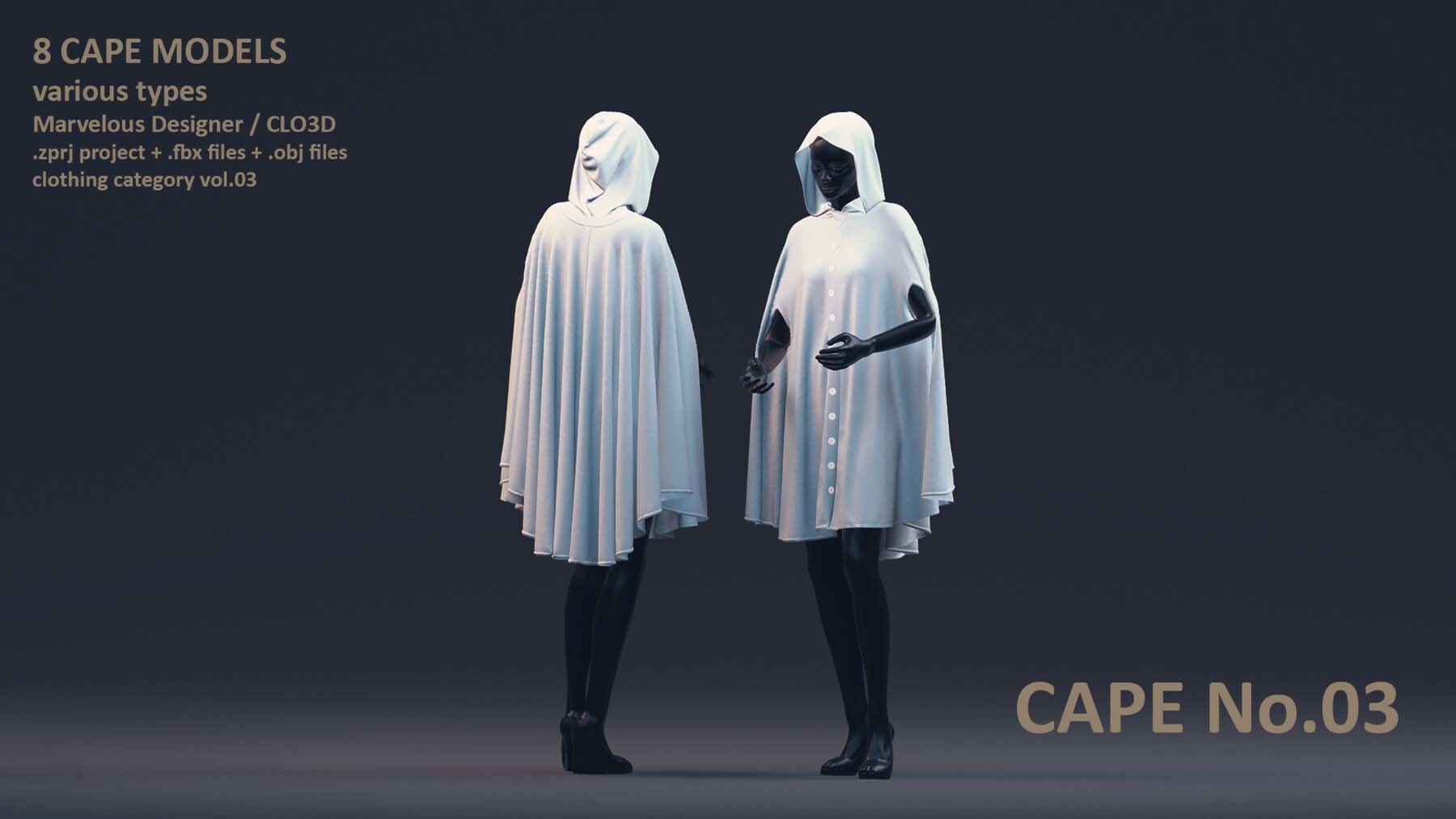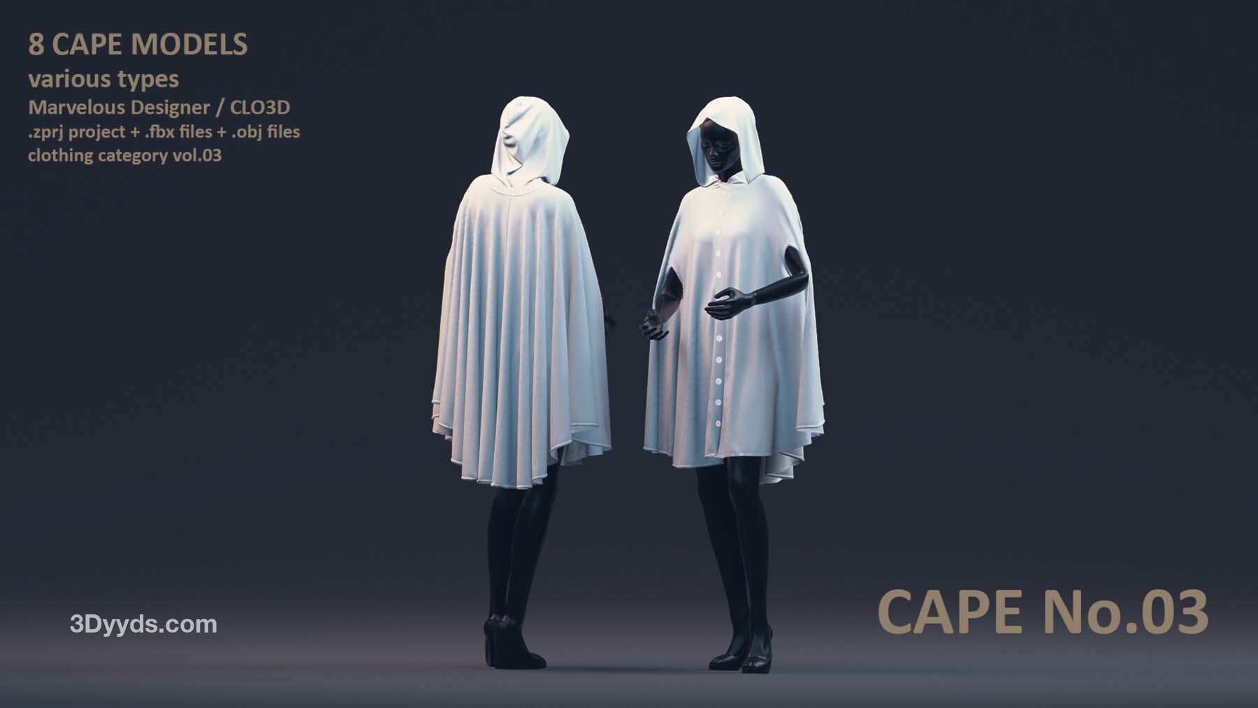 每位艺术家都需要一个合适的模型库,以加速创作艺术作品的过程。这个套装包括了男性和女性风格各异的8 件披风模型。这些模型具有清晰的四边形网格和 UV 映射。这些披风可以轻松地用来加快角色服装的制作过程。